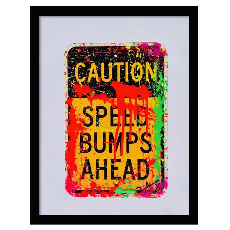 "Caution - Speed Bumps" is an original hand painted metal street sign by E.M. Zax, hand signed by the artist. This piece comes framed. Includes Letter of Authenticity. Measures approx. 19" x 23" (frame), 12" x 18" (image). The actual paint pattern may vary from the image shown.