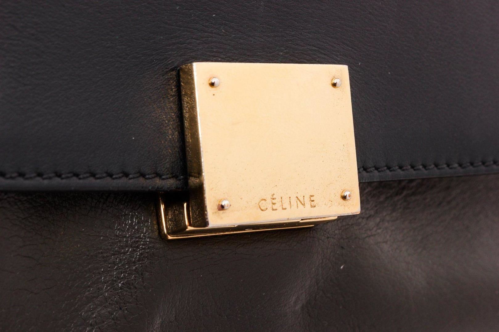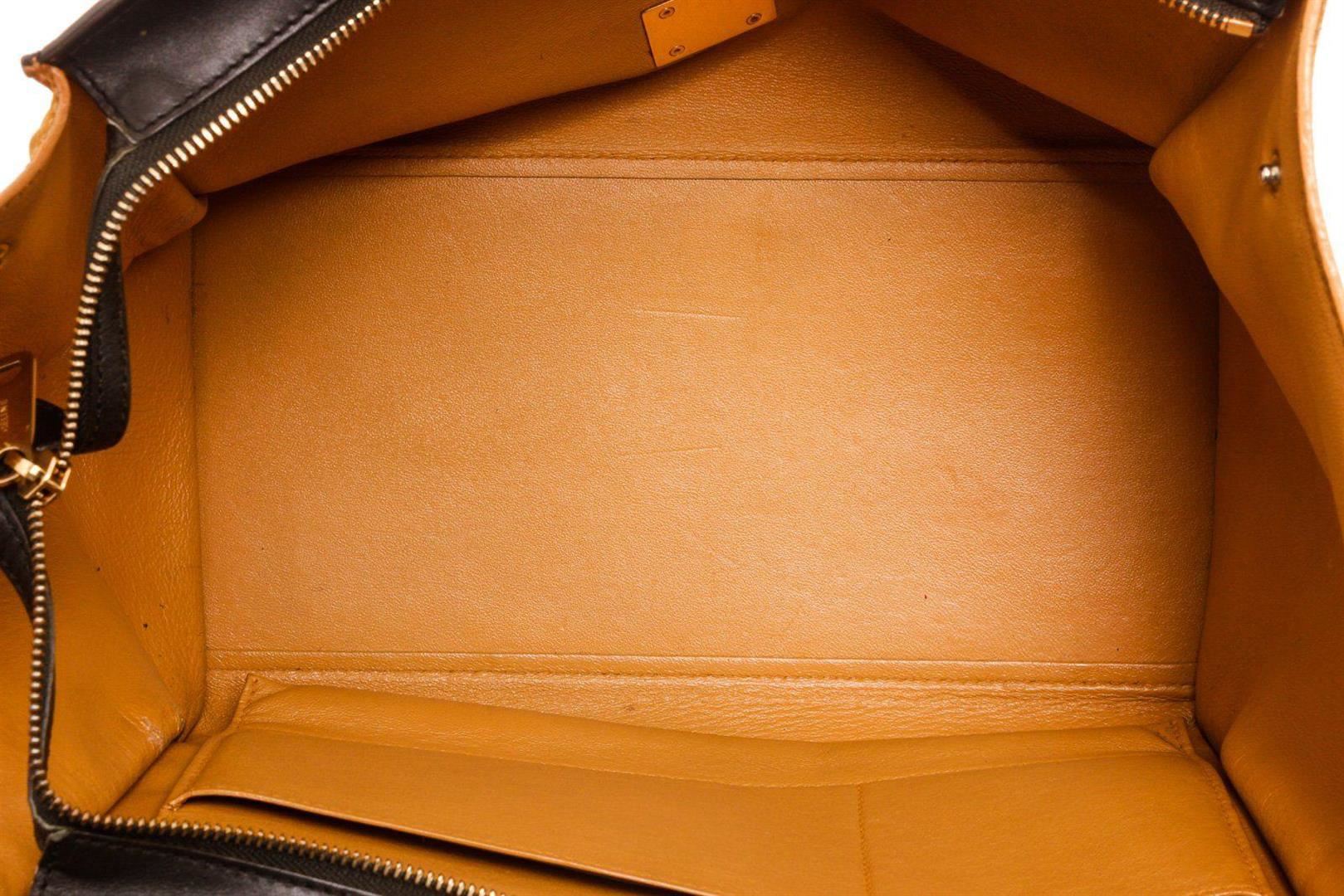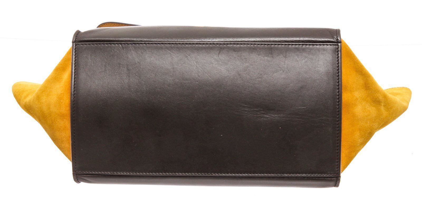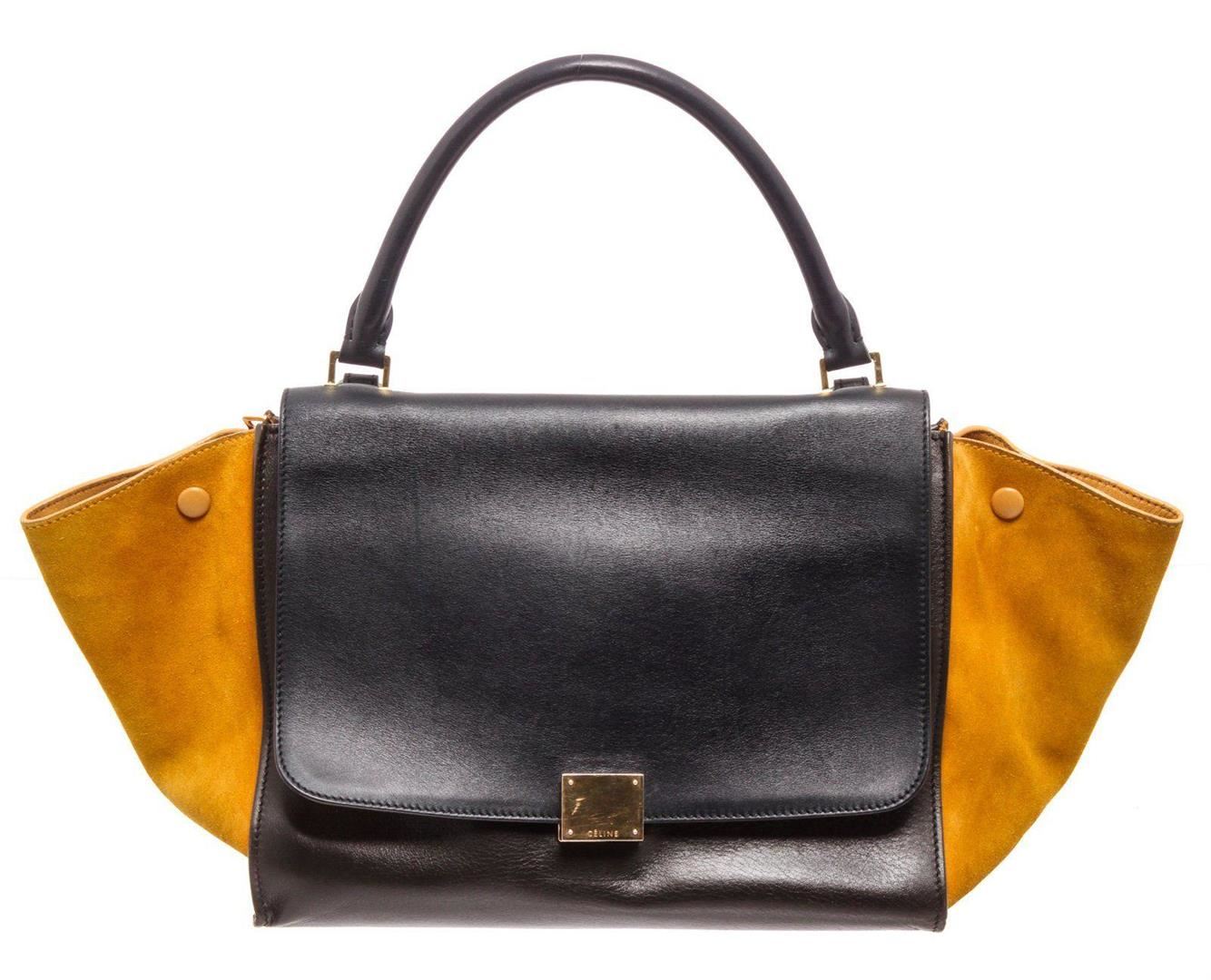 Celine Black Navy Suede Leather Trapeze Mustard Satchel Bag with gold-tone hardware, single rolled top handle, detachable flat shoulder strap, dual side gussets with snap expansions at sides, exterior zip pocket at back, tonal leather lining, dual interior slit pockets and flip-lock closure at front flap. Measurements: Length: 10.5 in / 27 cm Width: 6 in / 15 cm 8 in / 20 cm Condition: Pre-Owned Good overall, please see photographs for detail.