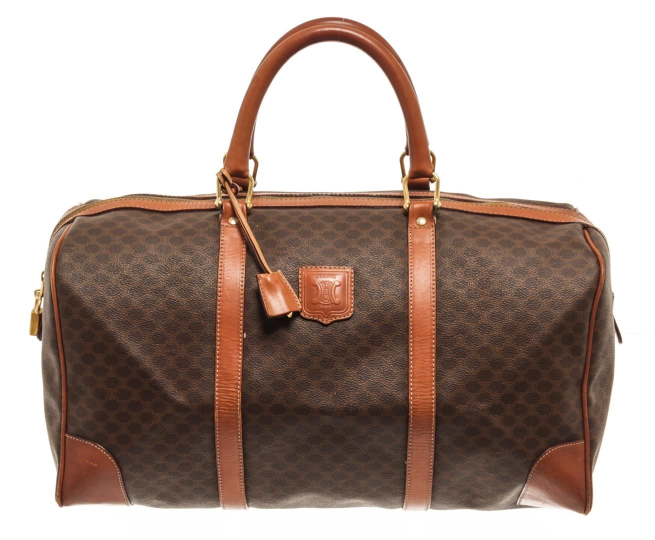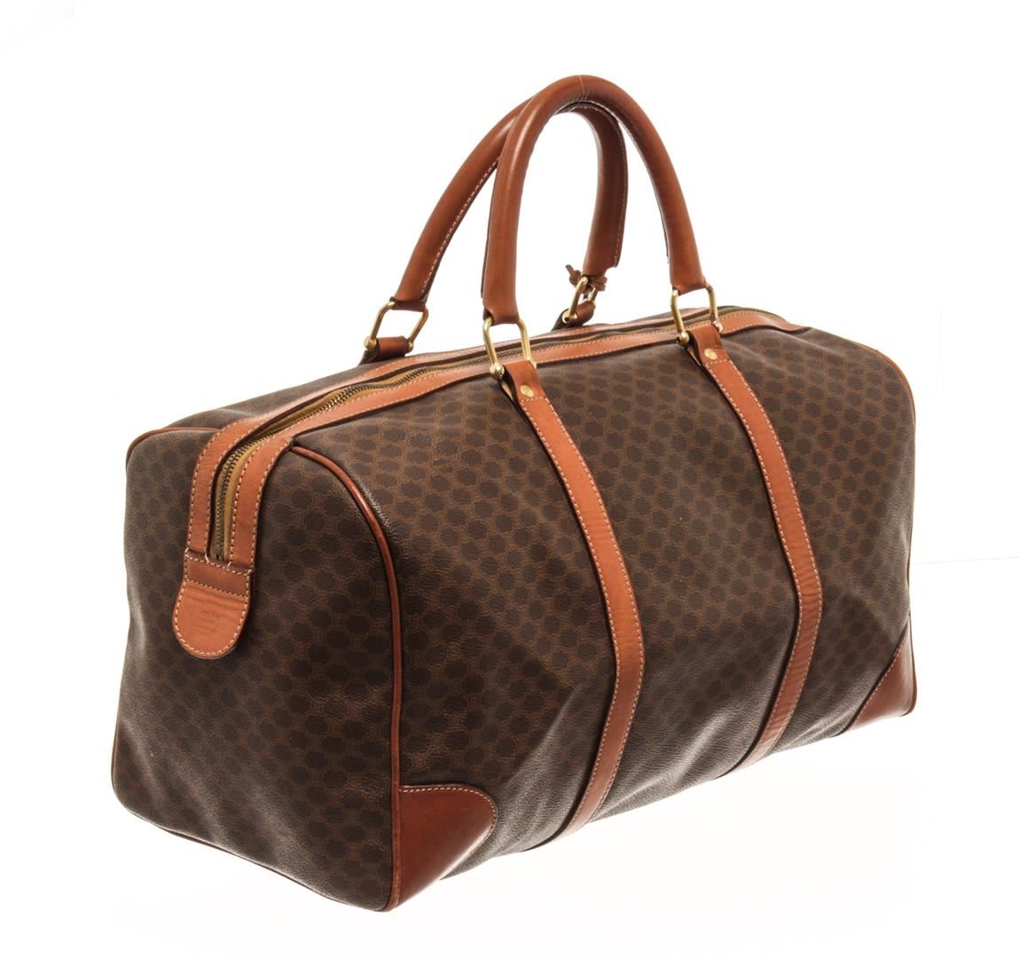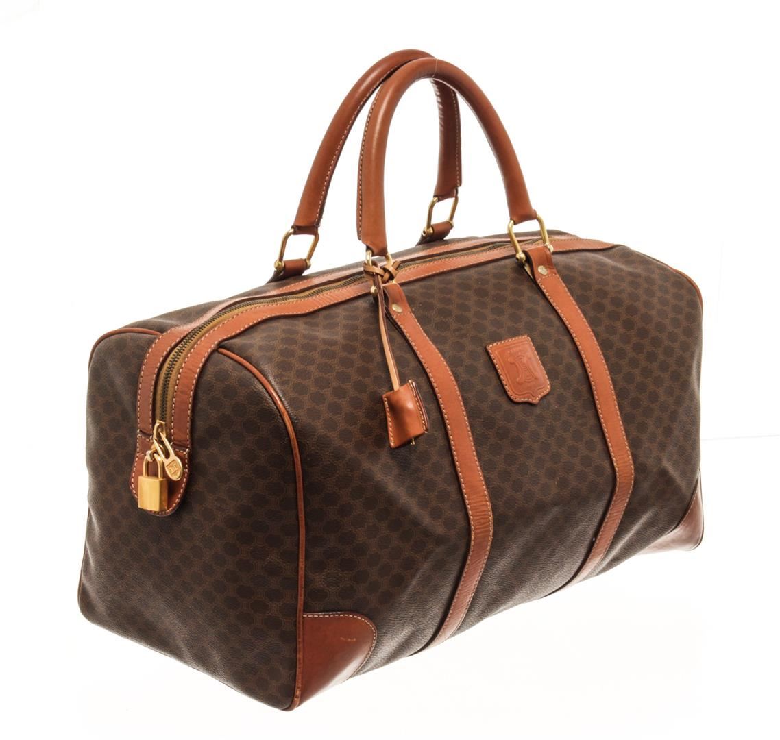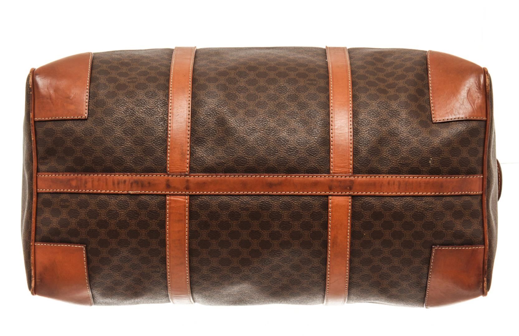One Celine Brown Coated Canvas Macadam Travel Bag. Item is sold AS-IS. All available information is listed in the description and shown in the photo. Celine Brown Macadam Pattern Logo Embossed Big Boston Bag with top handle, keys, clochette and lock, zipper closure, canvas lining. There is some wear on the bottom of the bag and leather peeling off the lining. Please refer to photos. 8.3" L x 16.7" W x 6.7" D, 4.7" drop. / 21.08 x 42.41 x 17.01 Cm