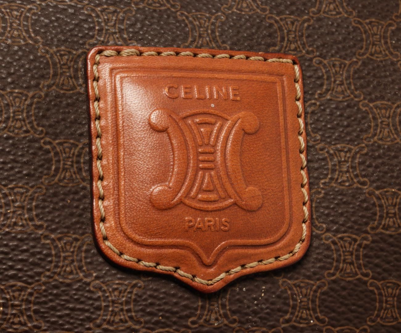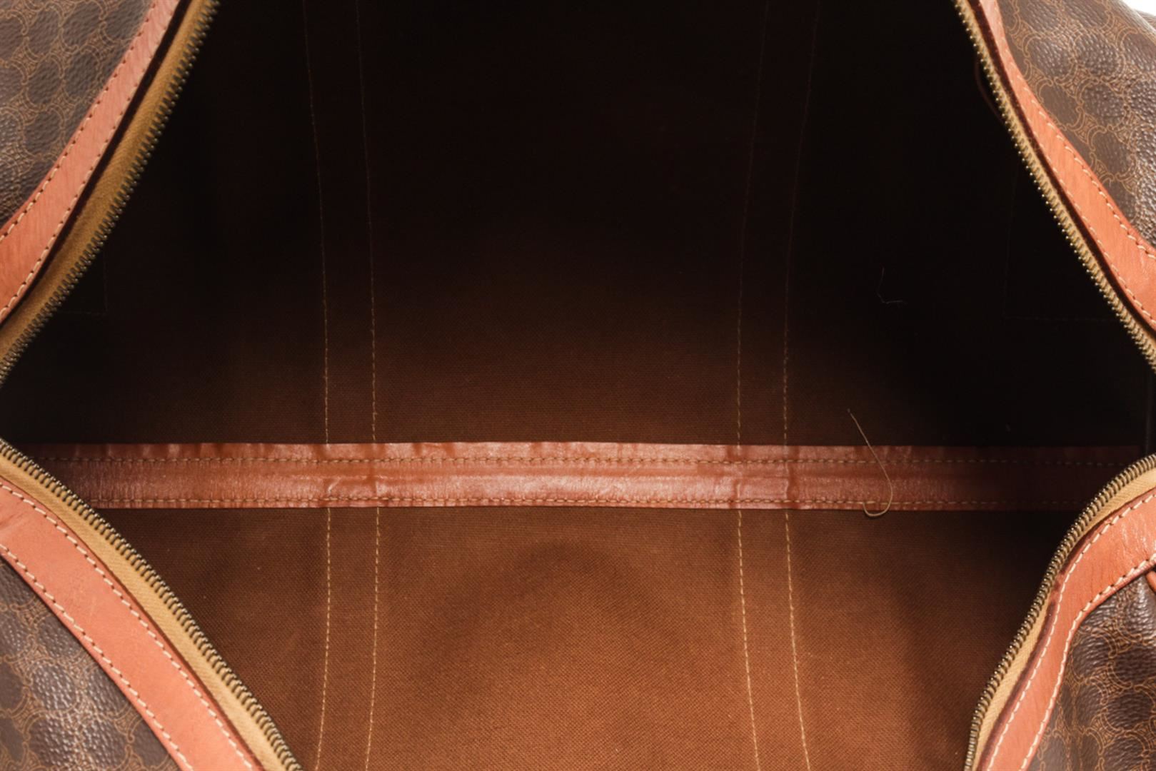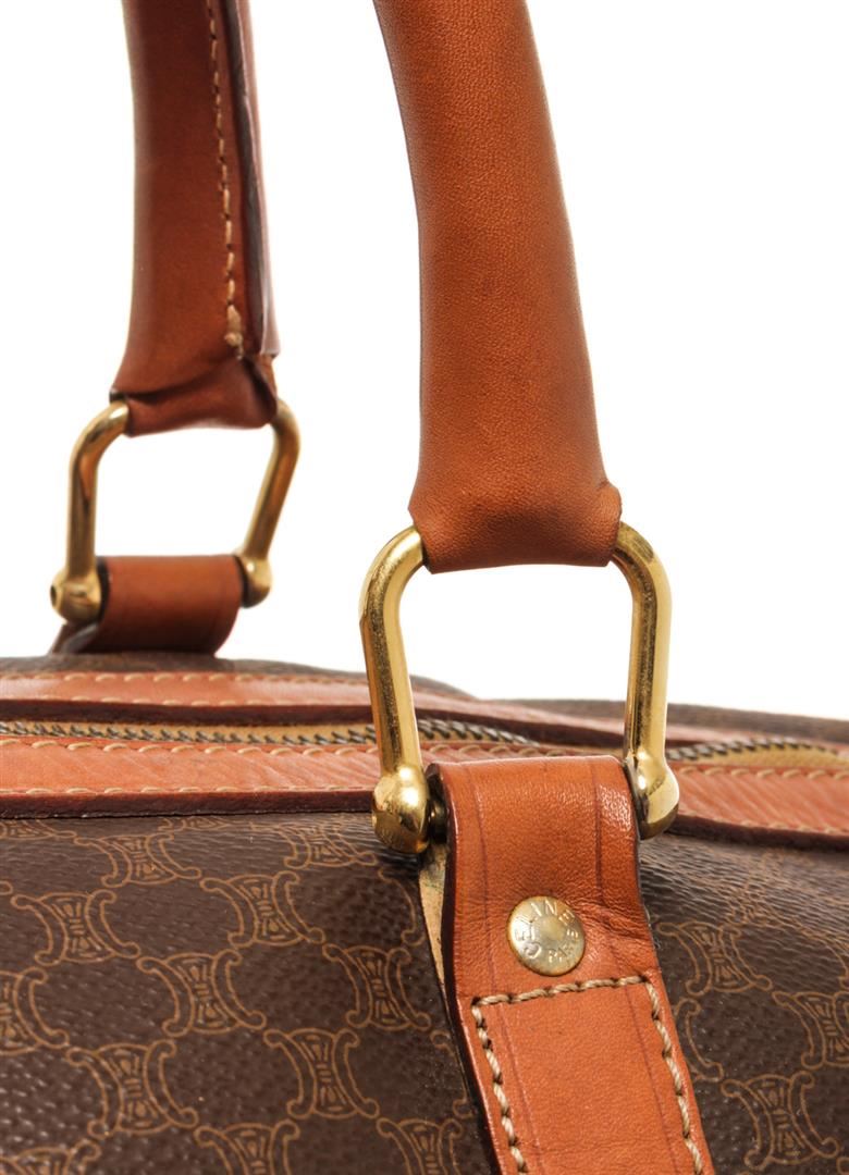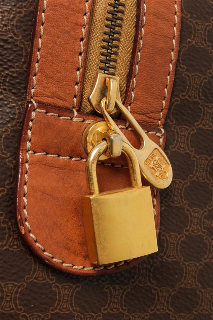 One Celine Brown Coated Canvas Macadam Travel Bag. Item is sold AS-IS. All available information is listed in the description and shown in the photo. Celine Brown Macadam Pattern Logo Embossed Big Boston Bag with top handle, keys, clochette and lock, zipper closure, canvas lining. There is some wear on the bottom of the bag and leather peeling off the lining. Please refer to photos. 8.3" L x 16.7" W x 6.7" D, 4.7" drop. / 21.08 x 42.41 x 17.01 Cm
