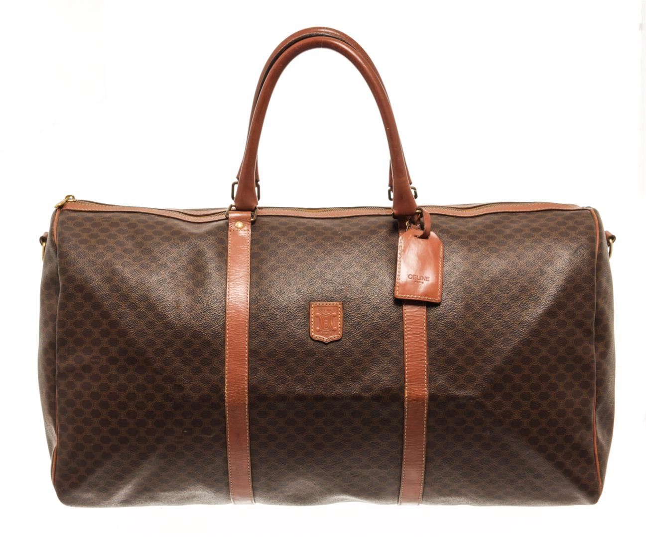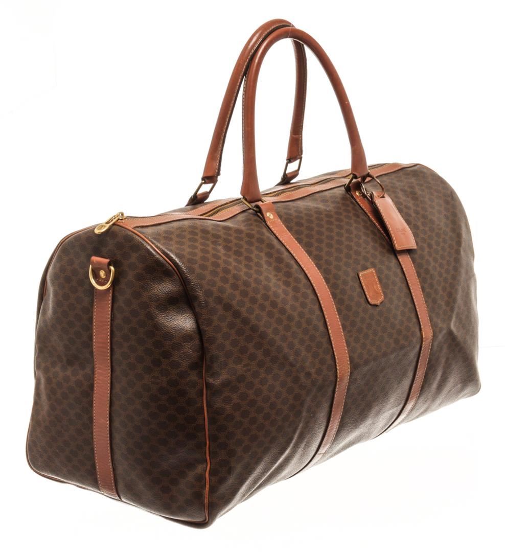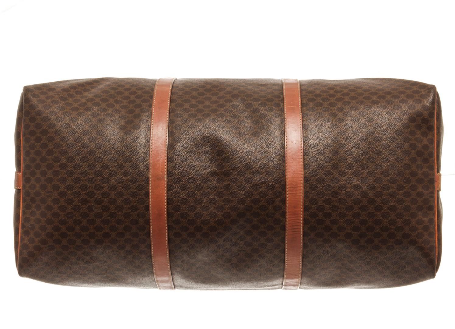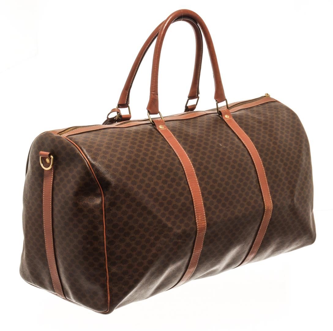 One Celine Brown Coated Canvas Macadam Two Way Travel Bag. Item is sold AS-IS. All available information is listed in the description and shown in the photo. Celine Brown Macadam Pattern Logo Embossed Big Boston Bag with top handle, keys, clochette and lock, zipper closure, canvas lining. H 28cm x W 48cm x D 20cm Handle 35cm. / 11.02 x 18.89 x 7.87 Inches