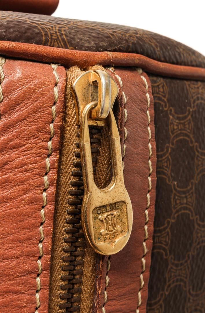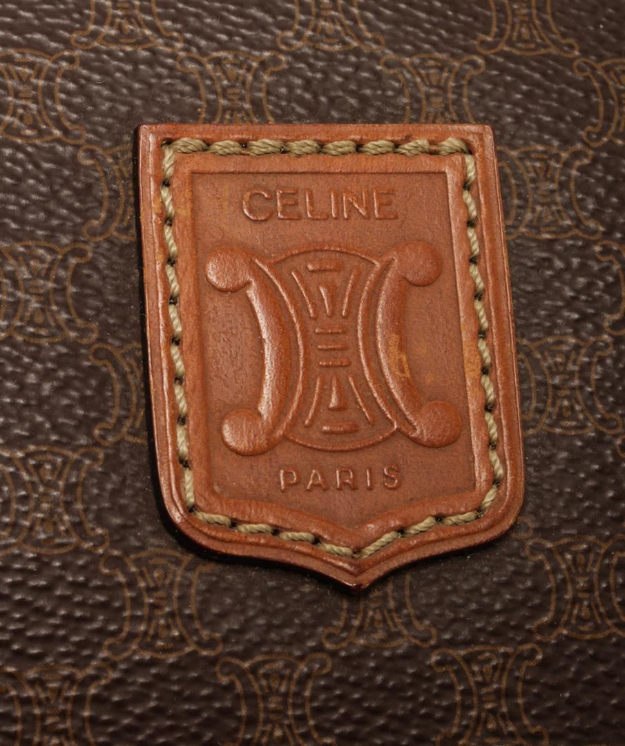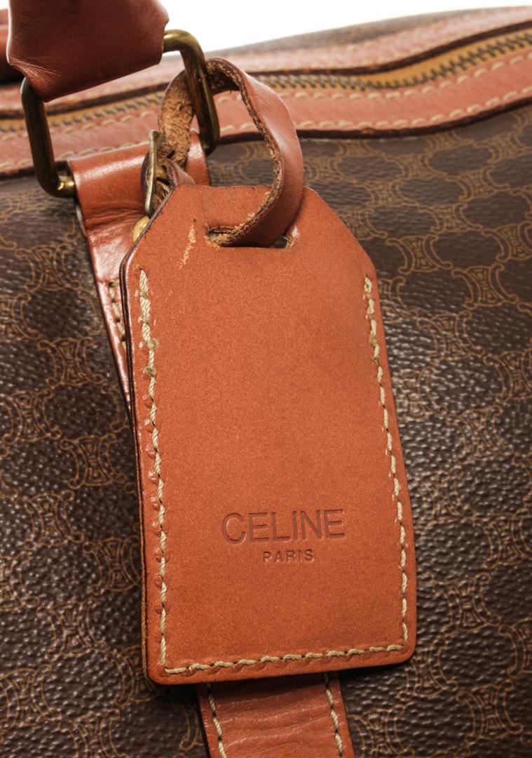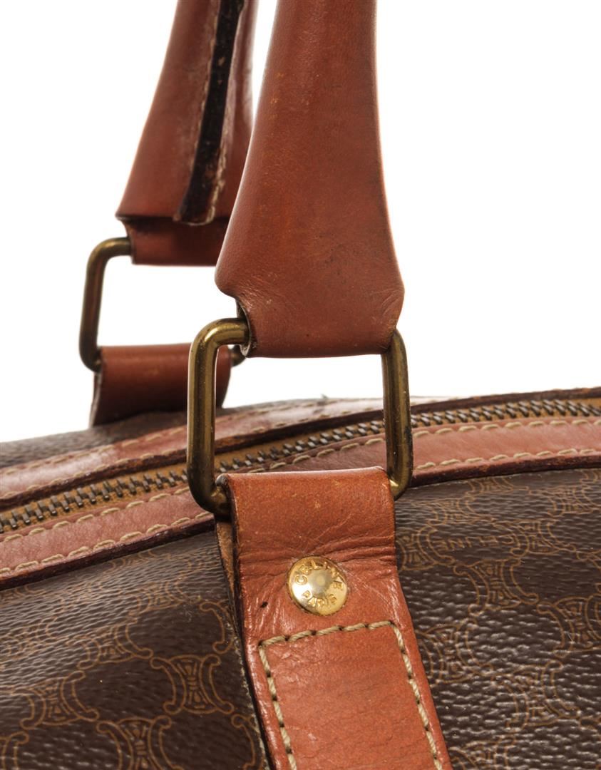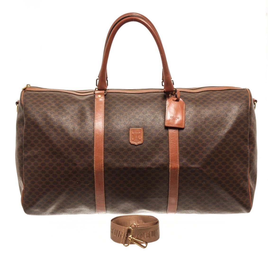 One Celine Brown Coated Canvas Macadam Two Way Travel Bag. Item is sold AS-IS. All available information is listed in the description and shown in the photo. Celine Brown Macadam Pattern Logo Embossed Big Boston Bag with top handle, keys, clochette and lock, zipper closure, canvas lining. H 28cm x W 48cm x D 20cm Handle 35cm. / 11.02 x 18.89 x 7.87 Inches