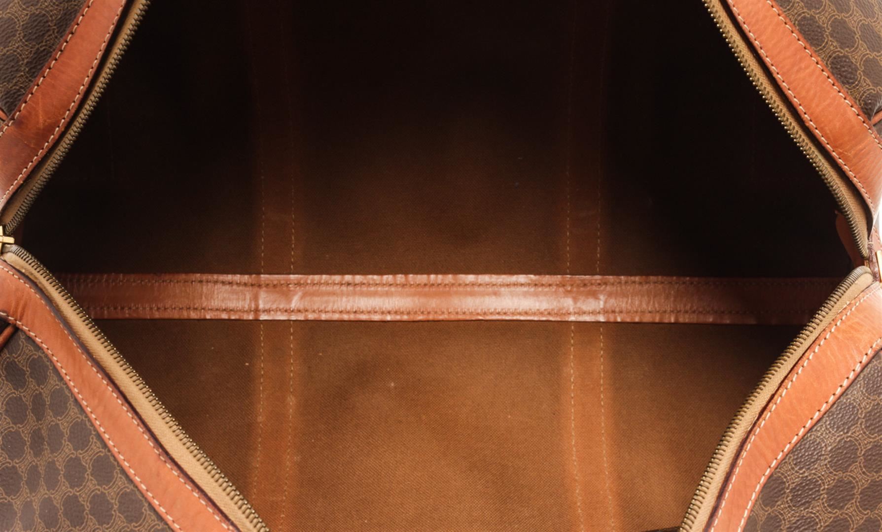One Celine Brown Macadam Pattern Logo Embossed Big Boston Bag. Item is sold AS-IS. All available information is listed in the description and shown in the photo. Celine Brown Macadam Pattern Logo Embossed Big Boston Bag with top handle, keys, clochette and lock, zipper closure, canvas lining. There is some wear on the bottom of the bag. Please refer to photos. H 28cm x W 48cm x D 20cm Handle 35cm. / 11.02 x 18.89 x 7.87 Inches