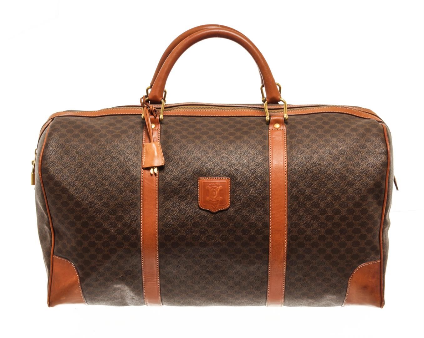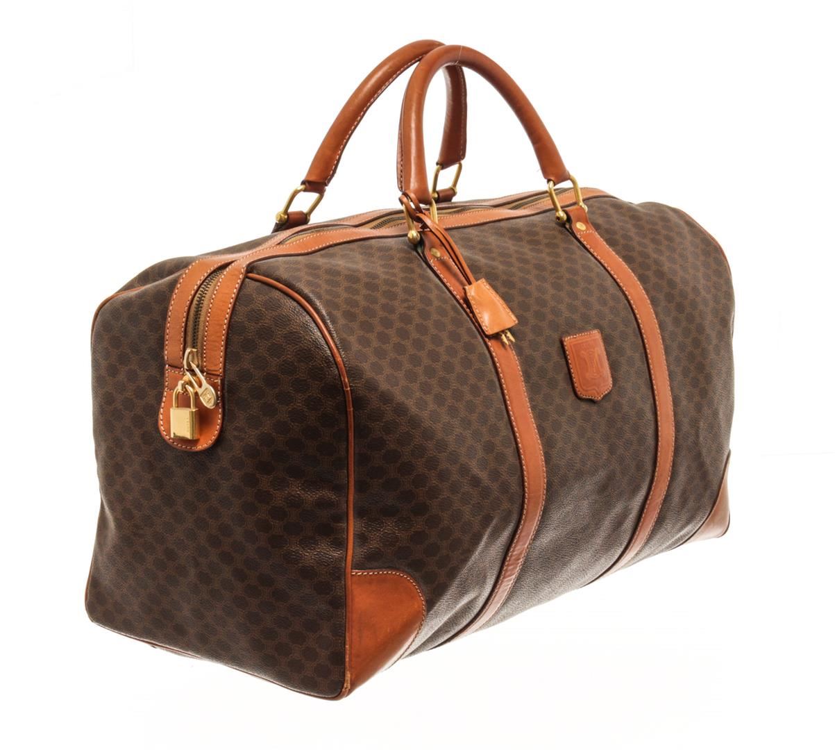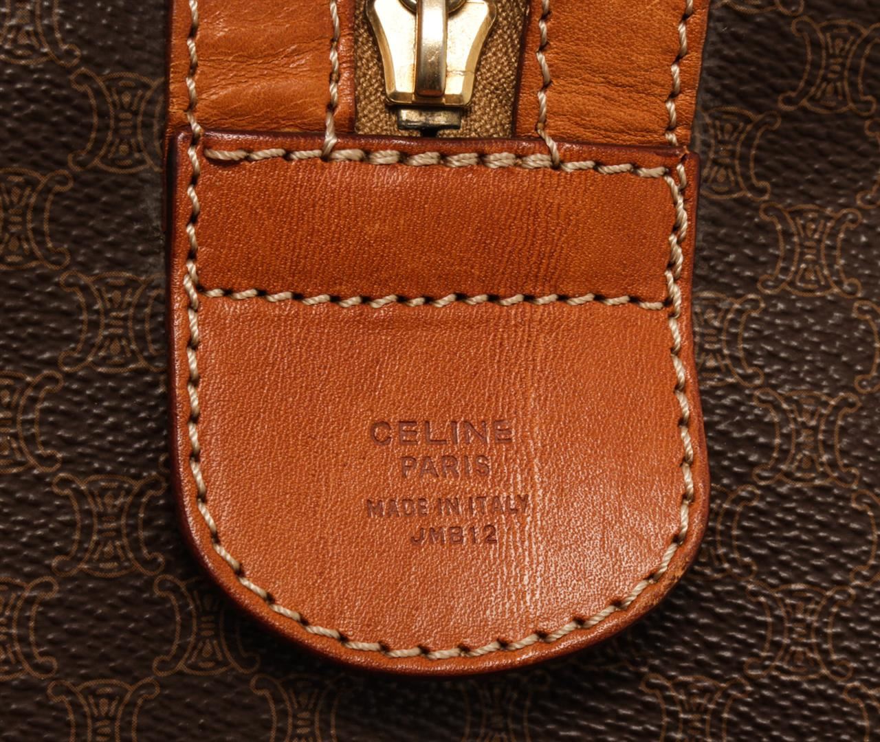 One Celine Brown Macadam Pattern Logo Embossed Big Boston Bag. Item is sold AS-IS. All available information is listed in the description and shown in the photo. Celine Brown Macadam Pattern Logo Embossed Big Boston Bag with top handle, keys, clochette and lock, zipper closure, canvas lining. H 28cm x W 48cm x D 20cm Handle 35cm. / 11.02 x 18.89 x 7.87 Inches