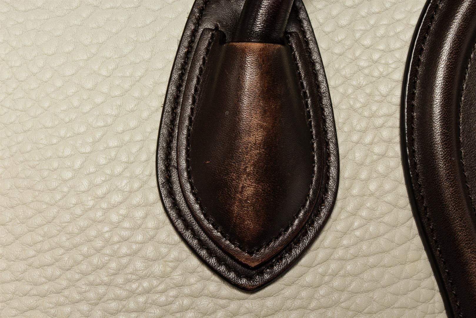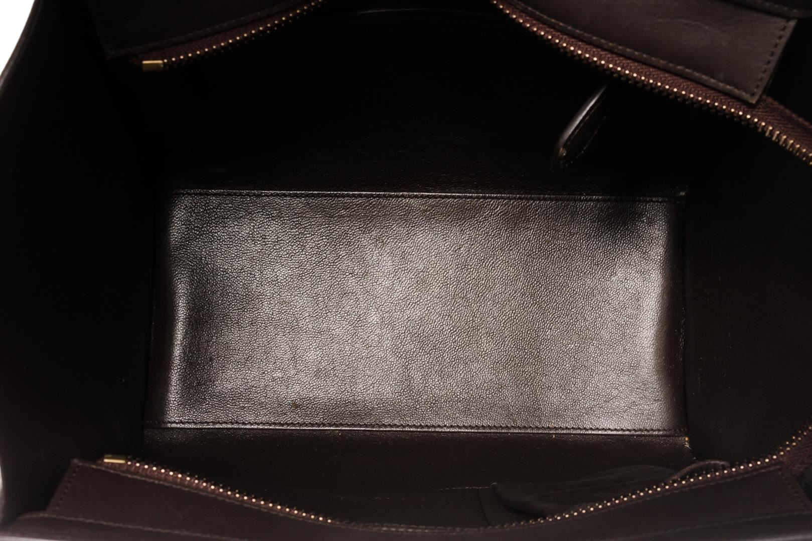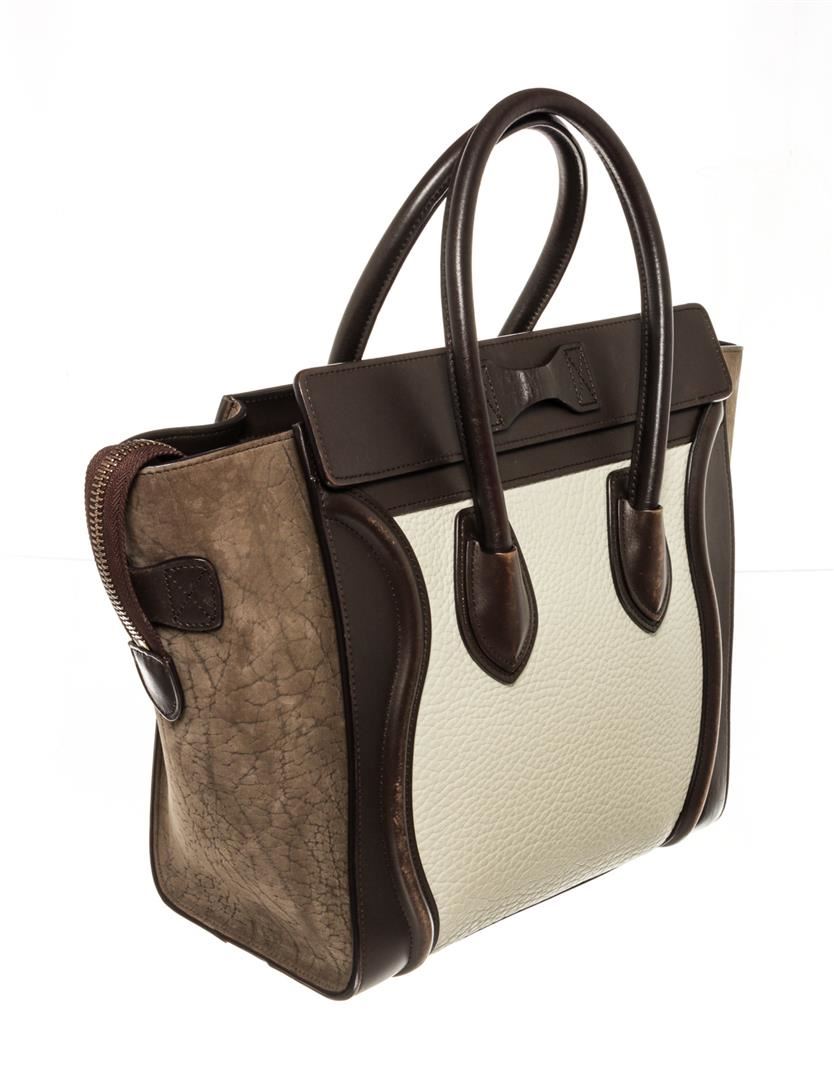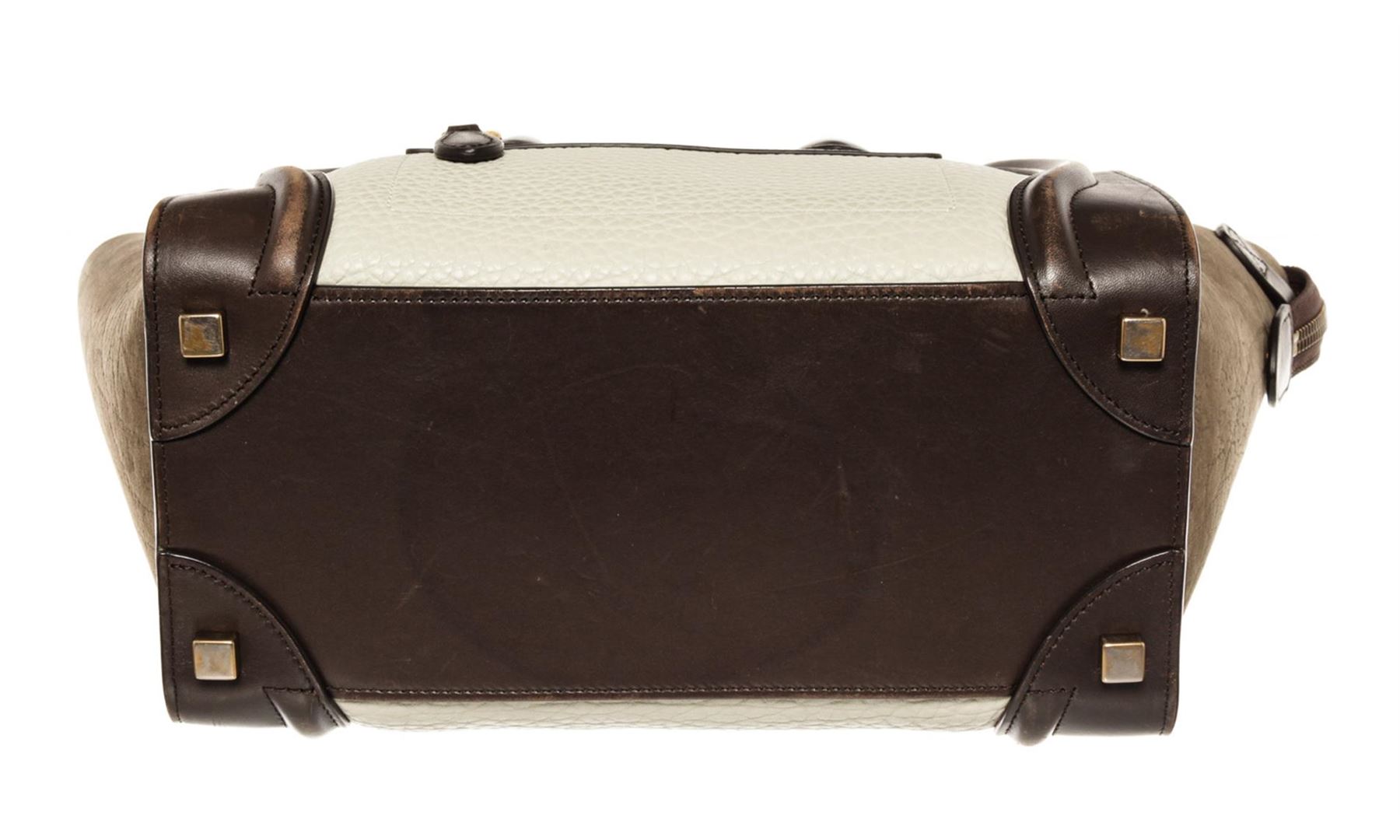 Celine Brown Multicolor Suede Leather Micro Luggage Handbag. All available information is listed in the description and shown in the photos. Celine Multicolor Mini Luggage with brown and ivory leather, brown suede, gold-tone hardware, dual rolled top handles, single zip pocket and foil-stamped logo at front face, protective feet at base, brown leather lining, three pockets at interior walls; one with zip closure and zip closure at top. Height 10", Width 10", Depth 5", Handle Drop 23"