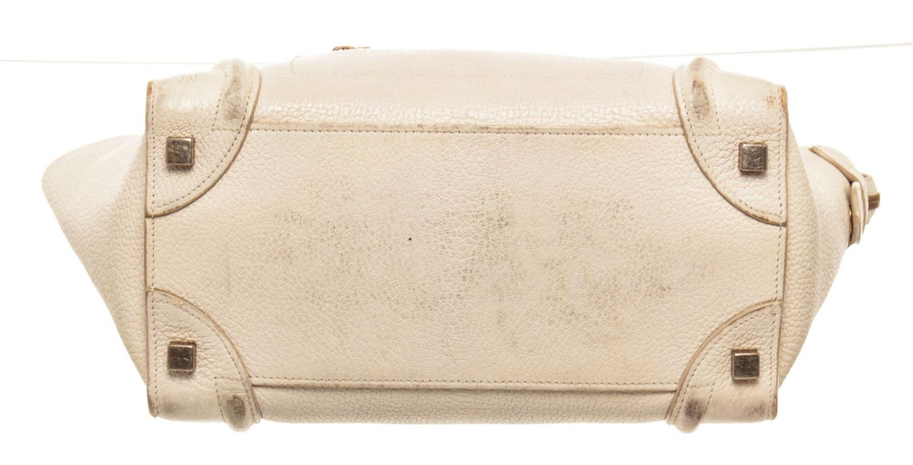 One Celine Cream Leather Mini Luggage Tote Bag. Item is sold AS-IS. All available information is listed in the description and shown in the photo. Celine Cream Leather Mini Luggage Tote Bag, gold-tone hardware, exterior zip pocket, interior slip pocket, dual top handle and zipper closure.