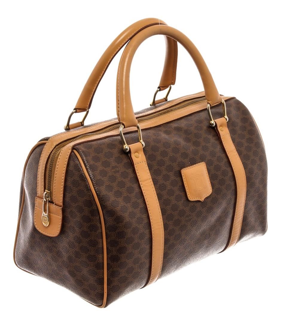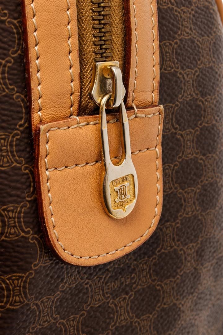 Celine Dark Brown and Tan Leather Macadam Boston Bag. All available information is listed in the description and shown in the photos. Celine Dark Brown and Tan Leather Macadam Boston Bag with gold-tone hardware, leather trim, dual rolled handles, leather trim embellishment, leather lining & single interior pocket, zip closure at top, protective feet at base. Height: 7.5" Width: 12" Depth: 6", Handle Drop: 3.5" / 19.05 x 30.48 x 15.24 Cm