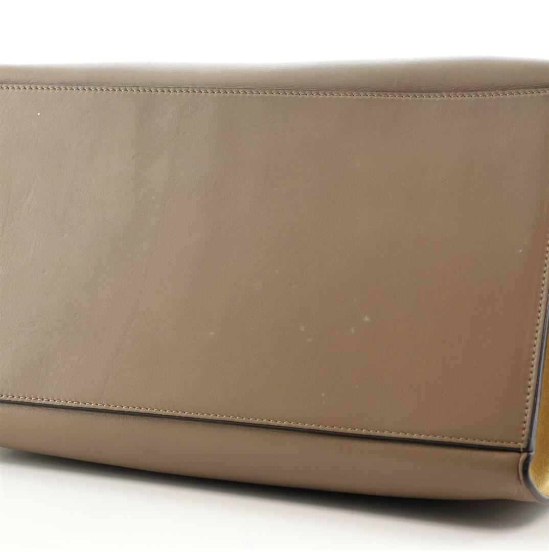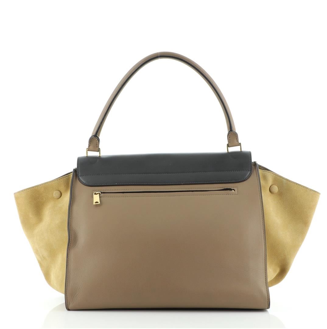 Celine Trapeze Bag Tricolor Calfskin Leather And Suede. All available information is listed in the description and shown in the photos. Celine Trapeze large tote bag with black and taupe calfskin leather, olive suede, gold-tone hardware, two inner flat pockets, large zipper pocket on the back, rolled leather top handle, a flap top with a flip-turn lock and zipper closure. Condition Details: Some creasing and scuffs on leather exterior, underneath flap, and in interior, cracking and splitting on side opening wax edges. Small indentations on interior base, scratches, tarnish and discoloration on hardware, and some markings on suede. Please note: The flip-turn lock closure does not lock, and it will not lay flat when you close the bag. Height 10", Width 13", Depth 8", Strap Drop 14.5