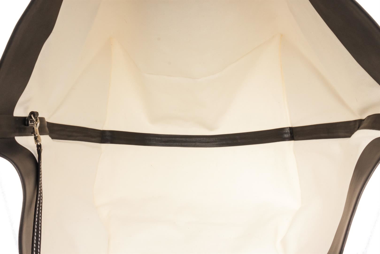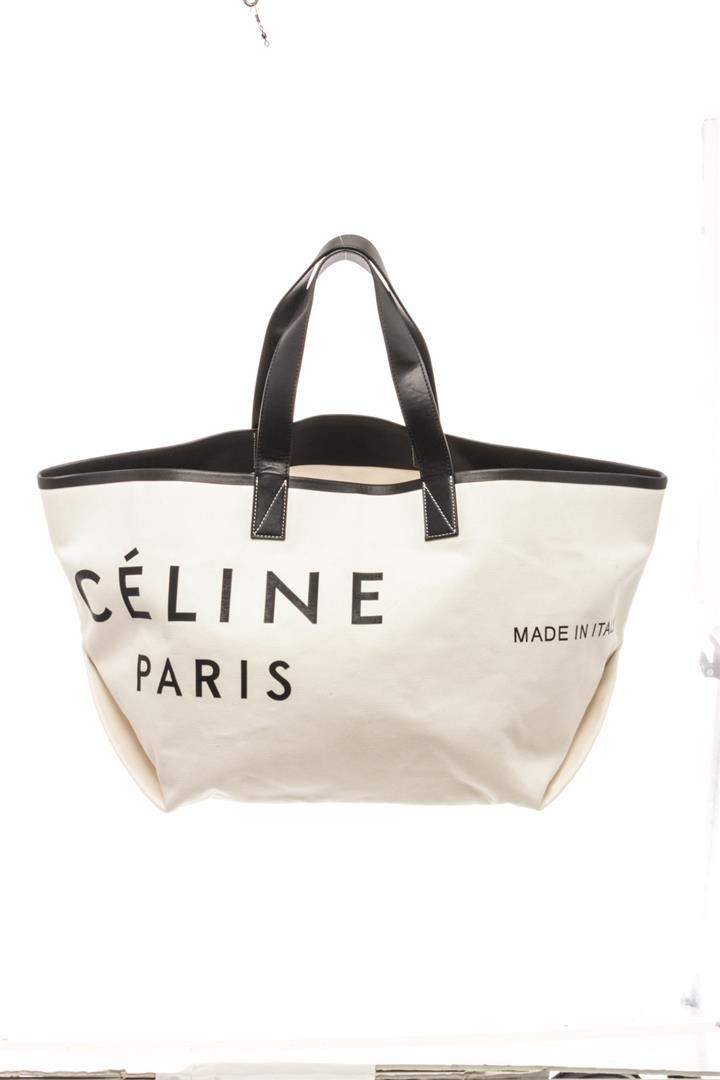 Celine White Canvas with Leather Medium Logo Tote Bag. All available information is listed in the description and shown in the photos. Celine White Canvas with Leather Medium Logo Tote Bag with black matte leather trim and tall flat black leather shoulder straps making this bag a beautifully simple design, The top is open to a white interior, open top. Height: 33.02 cm (13 in), Width: 36.83 cm (14.5 in), Depth: 30.48 cm (12 in)