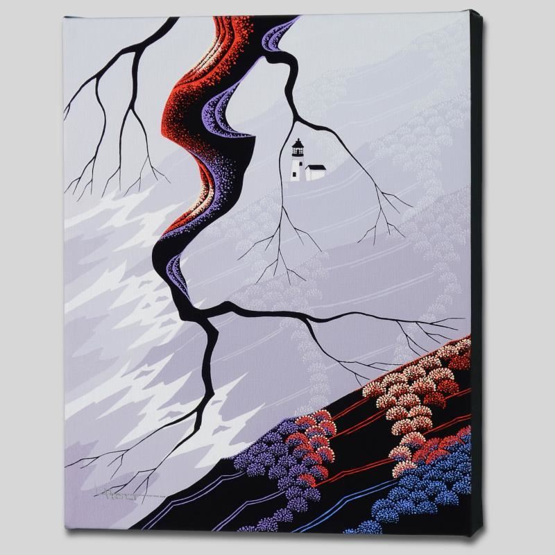Larissa Holt, a student of distinguished artist Eyvind Earle(1916-2000), uses bold colors and breathtaking scenery to create images of Nature in her own unique style. "Central Lighthouse" is a limited edition giclee on stretched canvas by Holt, numbered and bearing Holt's authorized signature. This piece comes gallery wrapped. Includes Letter of Authenticity. Measures approx. 10" x 12.5" x 1.5" (image).