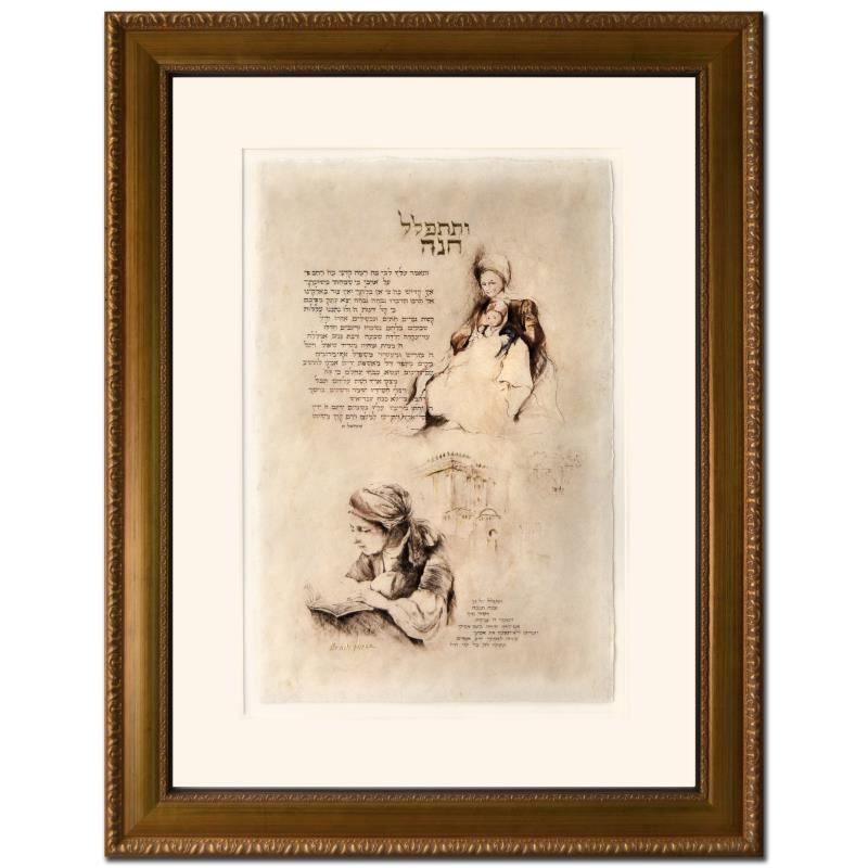 "Chanah's Prayer" is a mixed media giclee on handmade Indian paper by Brachi Horen, hand signed by the artist! This creation received personal attention by the artist in the form of water coloring and gilding. This piece has been custom framed using acid free materials and is ready to hang! Includes Certificate of Authenticity! Measures approx. 28" x 36.5" (with frame), 15" x 23.5" (image).