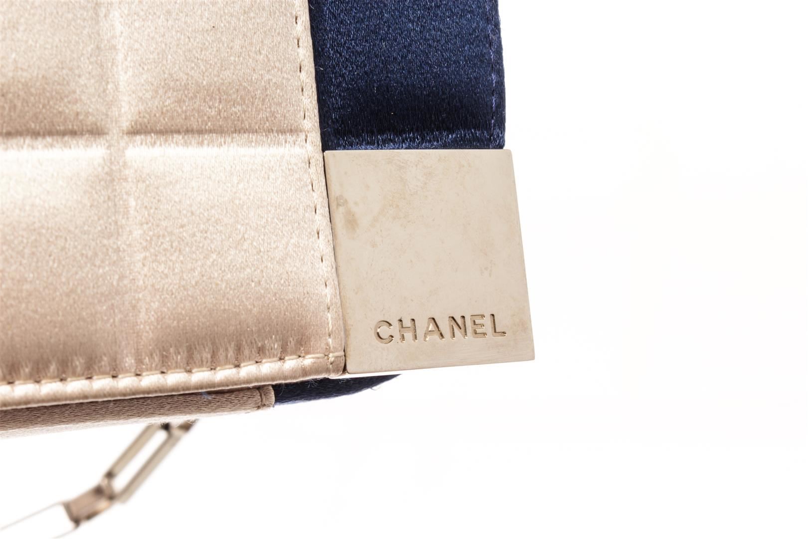 Chanel Beige Blue Satin Chocolate Bar Chain Shoulder Bag. All available information is listed in the description and shown in the photos. chanel beige blue satin chocolate bar chain shoulder bag with silver-tone hardware, a single edgy chain-link top handle, a dark slate tonal grosgrain lining, single zip pocket at interior wall and magnetic snap closure at front flap. Height: 5", Width: 8", Depth: 2" / 12.7 X 20.32 X 5.08 CM