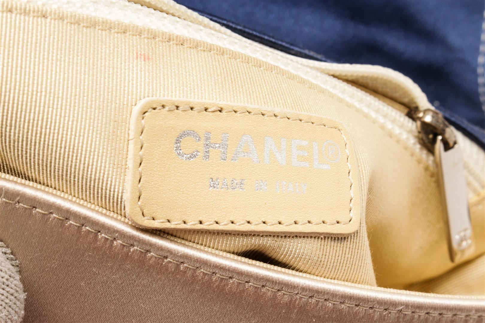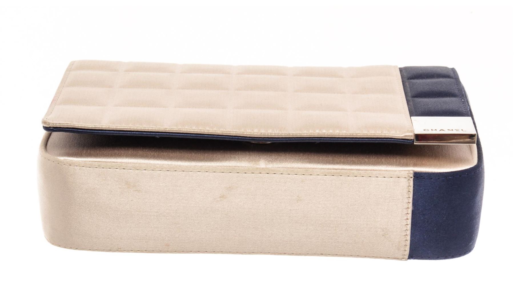 Chanel Beige Blue Satin Chocolate Bar Chain Shoulder Bag. All available information is listed in the description and shown in the photos. chanel beige blue satin chocolate bar chain shoulder bag with silver-tone hardware, a single edgy chain-link top handle, a dark slate tonal grosgrain lining, single zip pocket at interior wall and magnetic snap closure at front flap. Height: 5", Width: 8", Depth: 2" / 12.7 X 20.32 X 5.08 CM