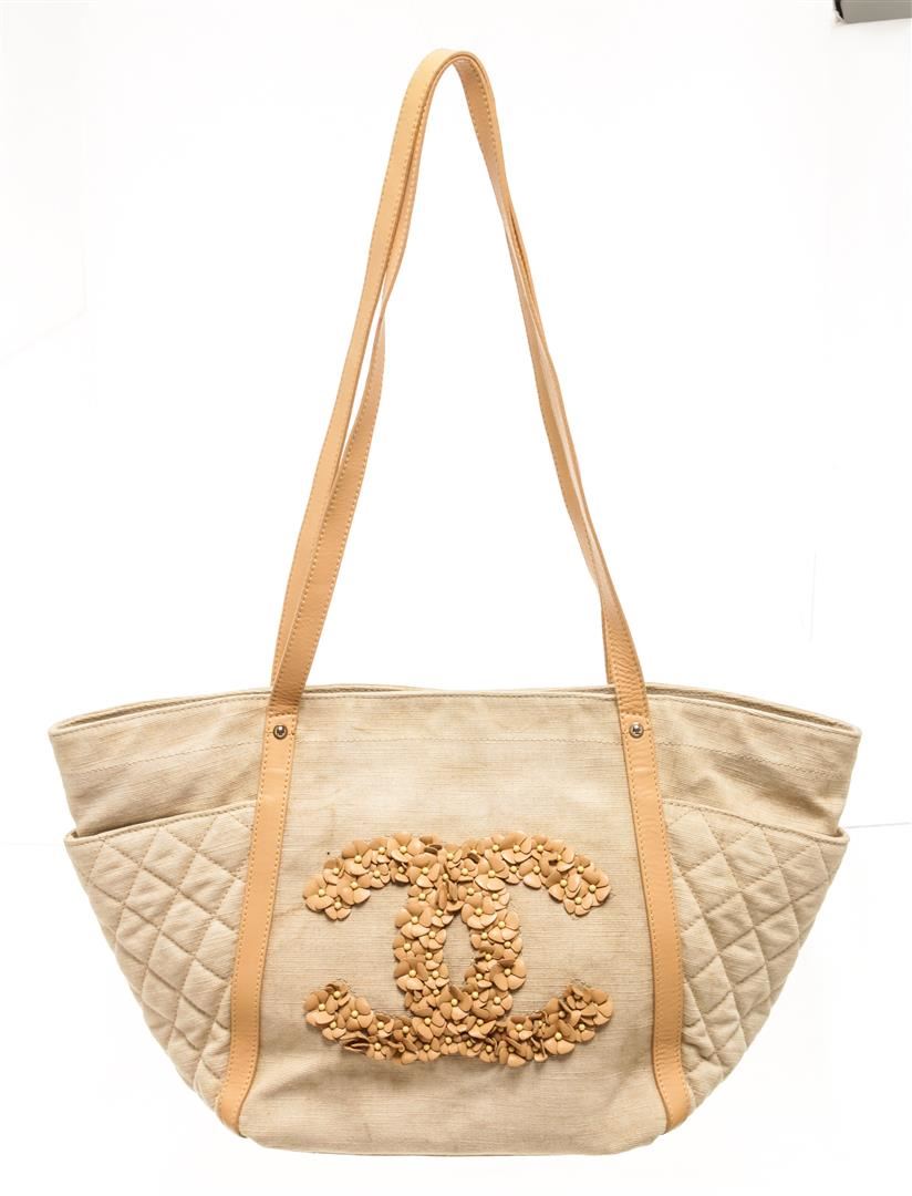 Chanel Beige Canvas CC Camelia Shoulder Bag. All available information is listed in the description and shown in the photos. Chanel beige canvas CC camelia shoulder bag with beige canvas exterior, beige leather straps, open top, silver-tone hardware, beige fabric lining, and two interior pockets: one zip, one slip. There are some stains on the exterior canvas as shown in pictures. Height: 11.81" Width: 20.47" Depth: 7.48", Shoulder Handle Drop: 15.35" / 30 x 52 x 19 Cm