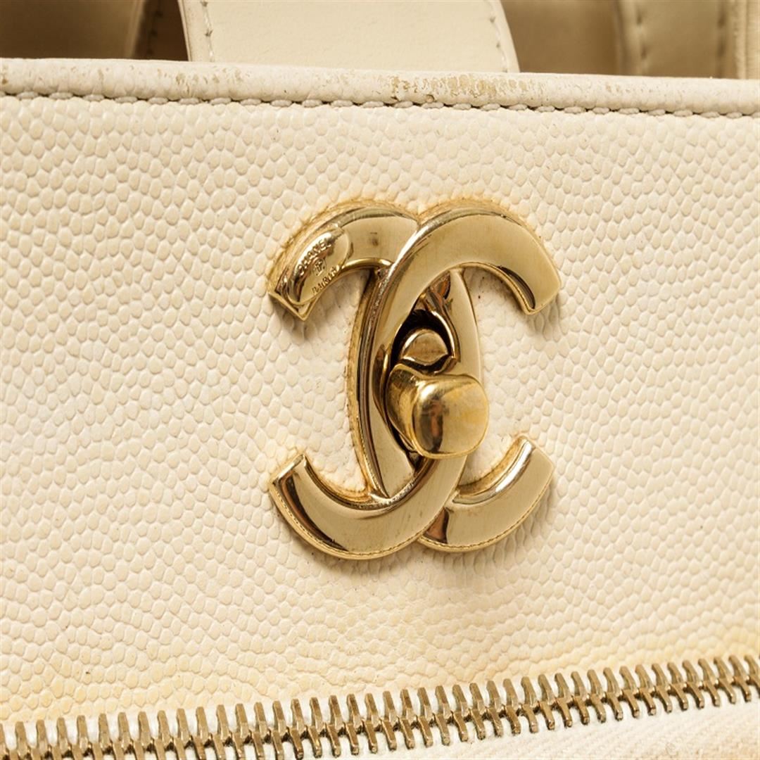 Chanel Beige Leather Business Affinity Shoulder Bag. All available information is listed in the description and shown in the photos. Chanel beige leather Business Affinity shoulder bag with quilted beige leather exterior, gold-tone hardware, turn-lock closure, beige leather lining, exterior zip pocket, interior zip slip pocket, dual top handle, long shoulder chain, and snap closure. There are some stains, leather wear, marking in the lining. Please refer to photos. Height: 10.5" Width: 13" Depth: 6", Handle Drop: / 26.67 x 33.02 x 15.24 Cm