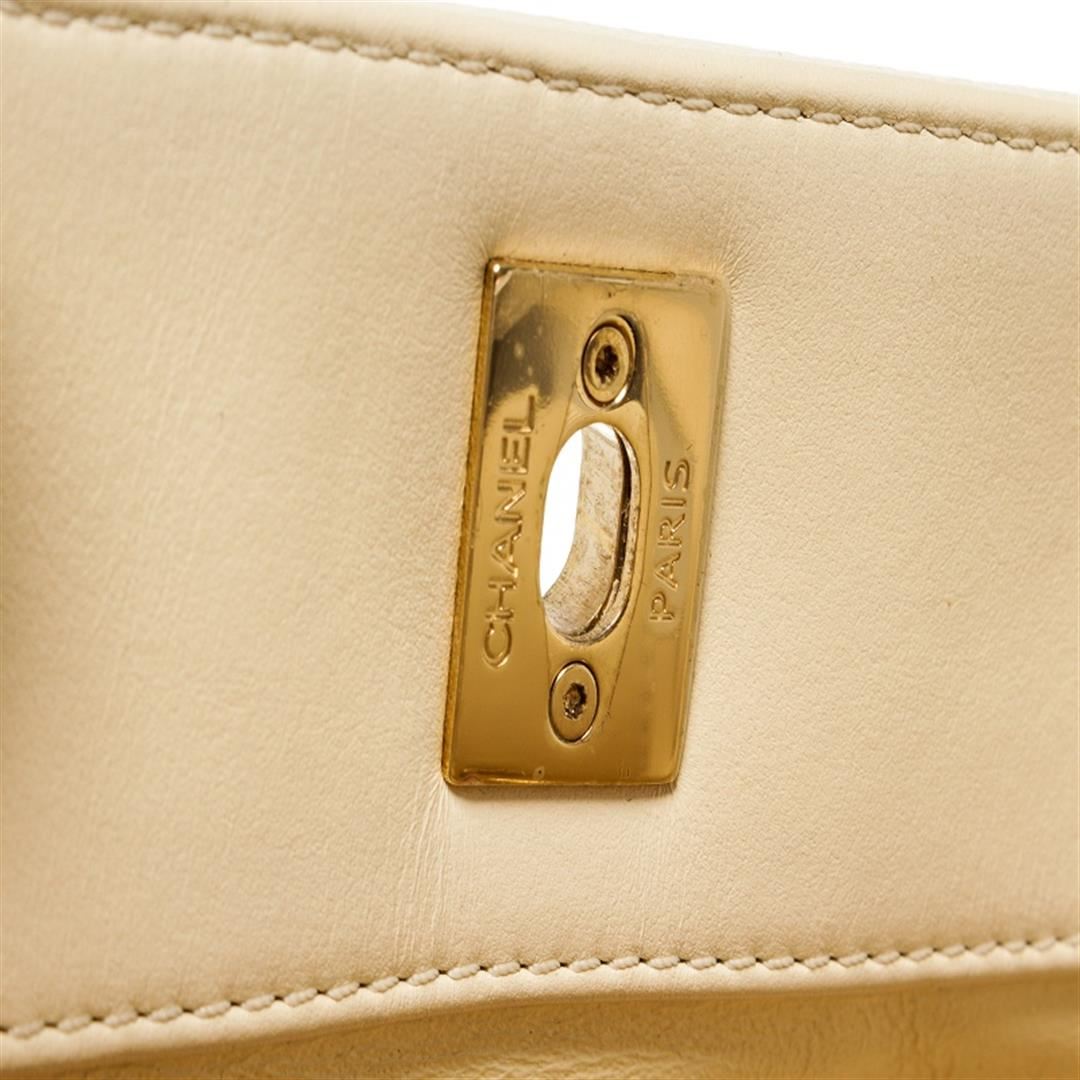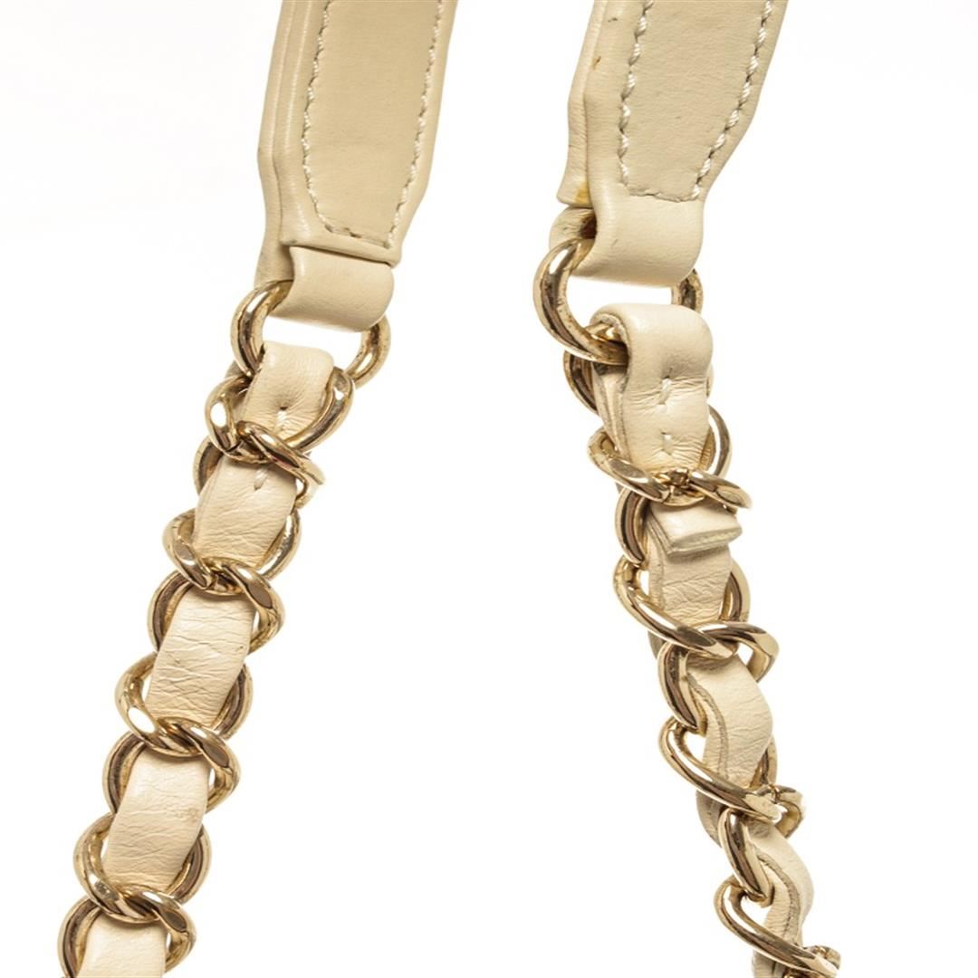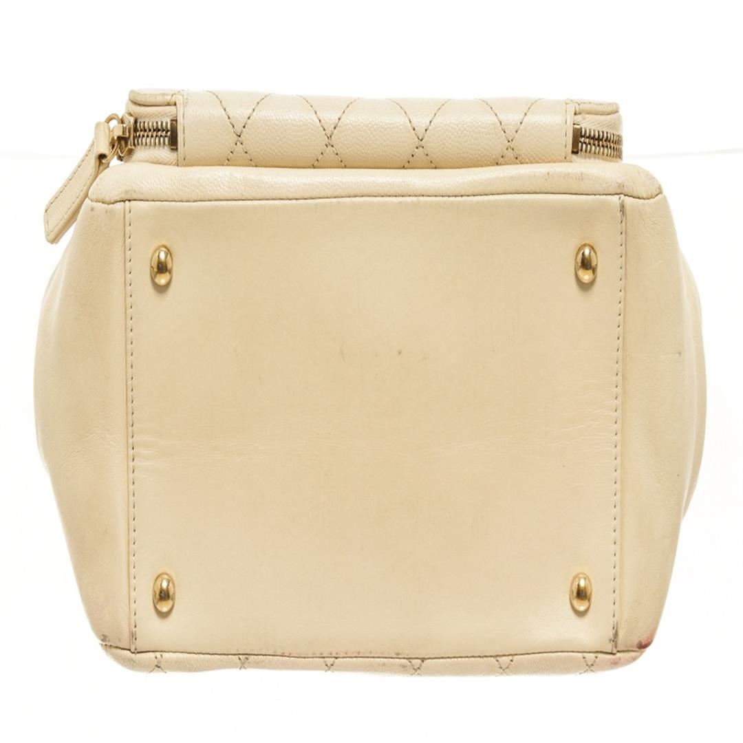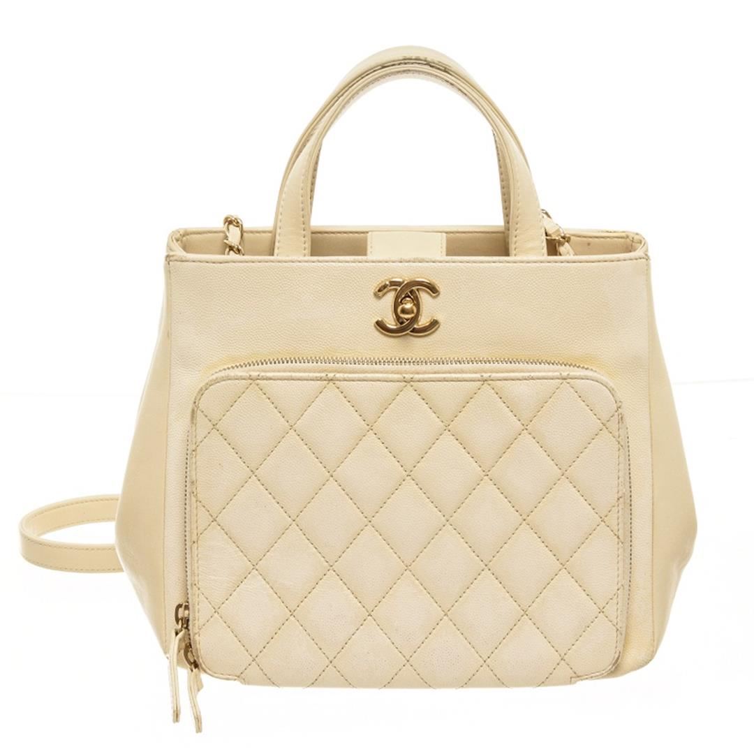 Chanel Beige Leather Business Affinity Shoulder Bag. All available information is listed in the description and shown in the photos. Chanel beige leather Business Affinity shoulder bag with quilted beige leather exterior, gold-tone hardware, turn-lock closure, beige leather lining, exterior zip pocket, interior zip slip pocket, dual top handle, long shoulder chain, and snap closure. There are some stains, leather wear, marking in the lining. Please refer to photos. Height: 10.5" Width: 13" Depth: 6", Handle Drop: / 26.67 x 33.02 x 15.24 Cm