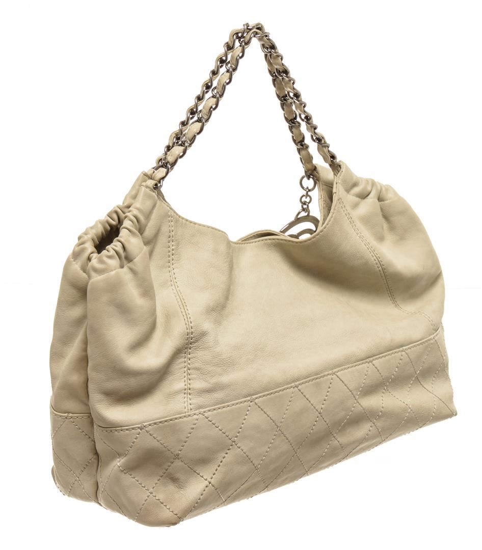 One Chanel Beige Leather Coco Cabas Tote Bag. Item is sold AS-IS. All available information is listed in the description and shown in the photo. Chanel beige leather Coco Cabas tote bag with relaxed beige leather exterior, with the bottom half having diamond-patterned stitching, silver-tone hardware, a CC logo, two top chain-link shoulder straps, beige satin lining, one interior zip pocket, and snap button closure. Corners are worn, fabric lining is very stained. Please refer to photos.