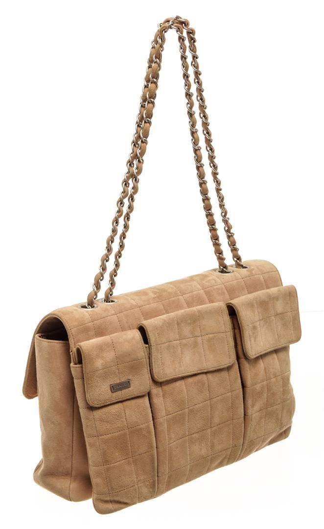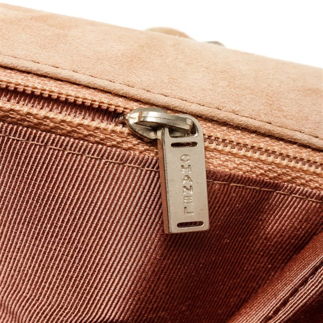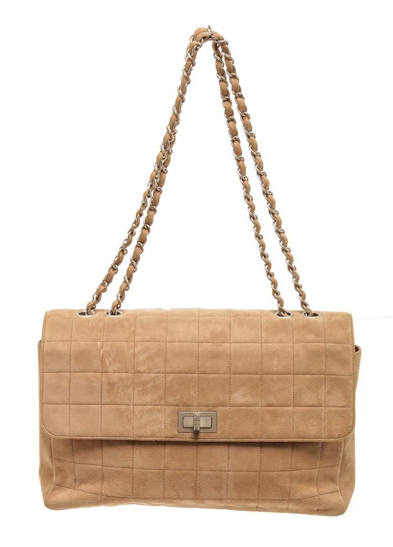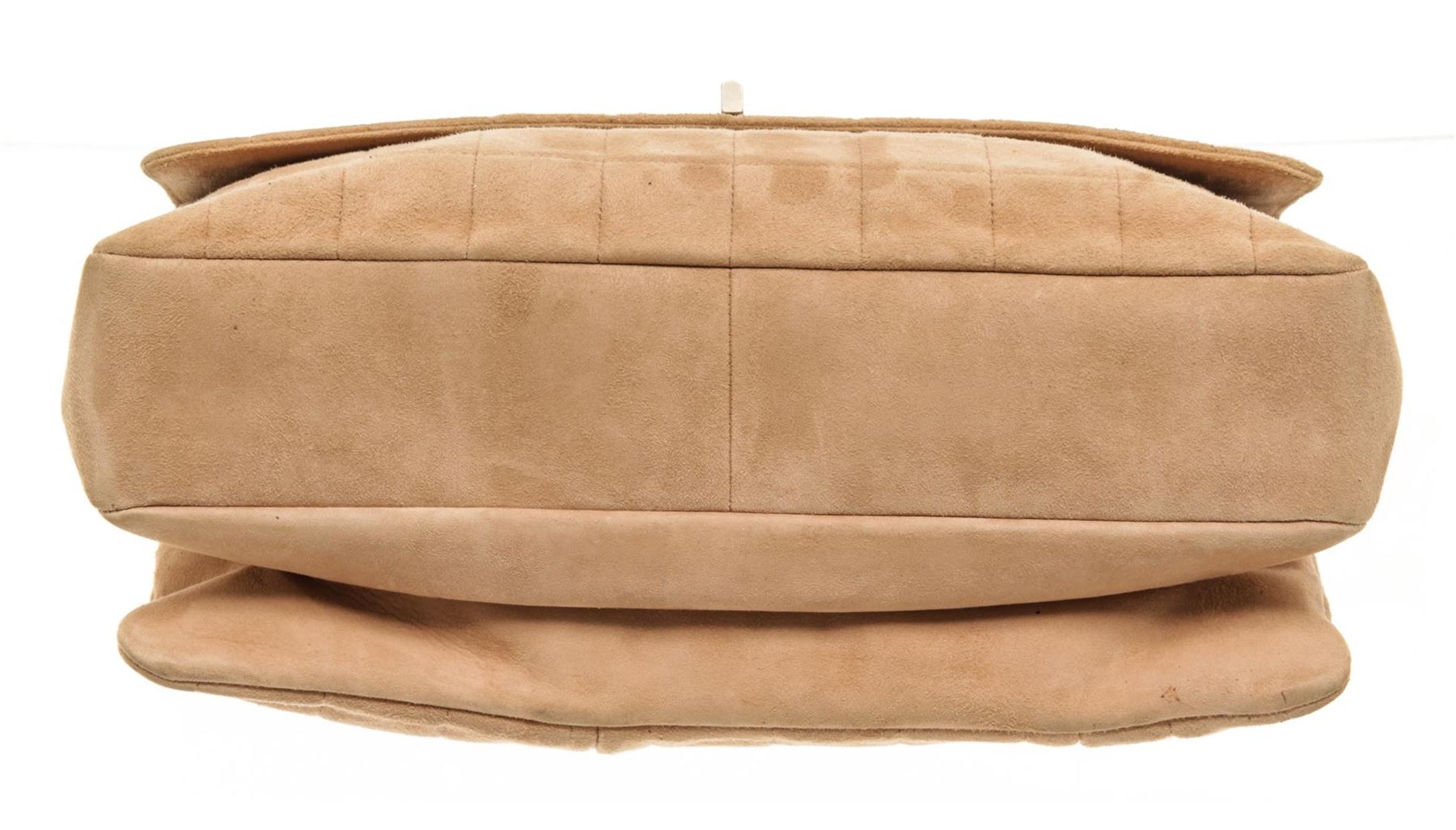 One Chanel Beige Suede Leather Reissue Chocolate Bar Shoulder Bag. Item is sold AS-IS. All available information is listed in the description and shown in the photo. Chanel beige suede leather reissue chocolate bar shoulder bag with single flap, beige grosgrain lining, featuring three pockets on the back, opaque silver-tone metal chain interlaced with beige suede leather and mademoiselle turn-lock, two inner labels reading Chanel. There are some stains on the fabric lining as shown in photos. Height: 7.48" Width: 12.20" Depth: 3.93" , Handle Drop: 3.5" / 19 x 31 x 10 Cm