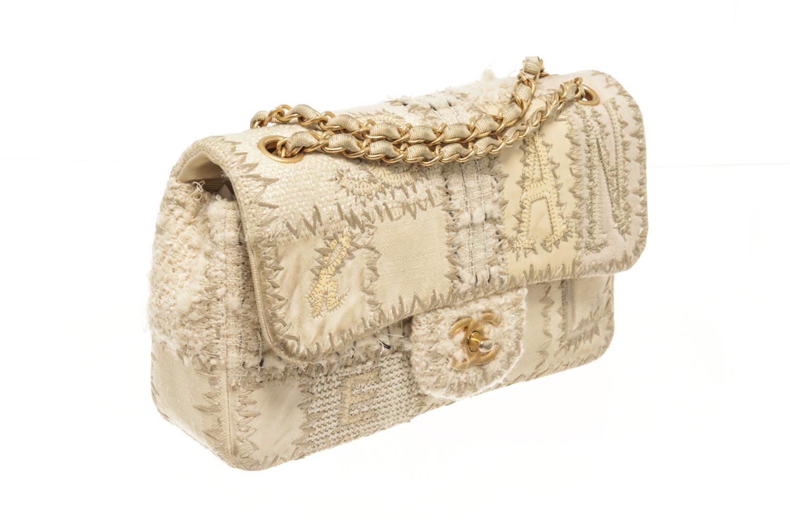 Chanel Beige White Canvas Tweed Medium Patchwork Jumbo Flap Shoulder Bag. All available information is listed in the description and shown in the photos. chanel beige white canvas tweedmedium patchwork jumbo flap shoulder bag 12"L x 3.25"W x 8"H / 30.48 x 8.25 x 20.32 CM