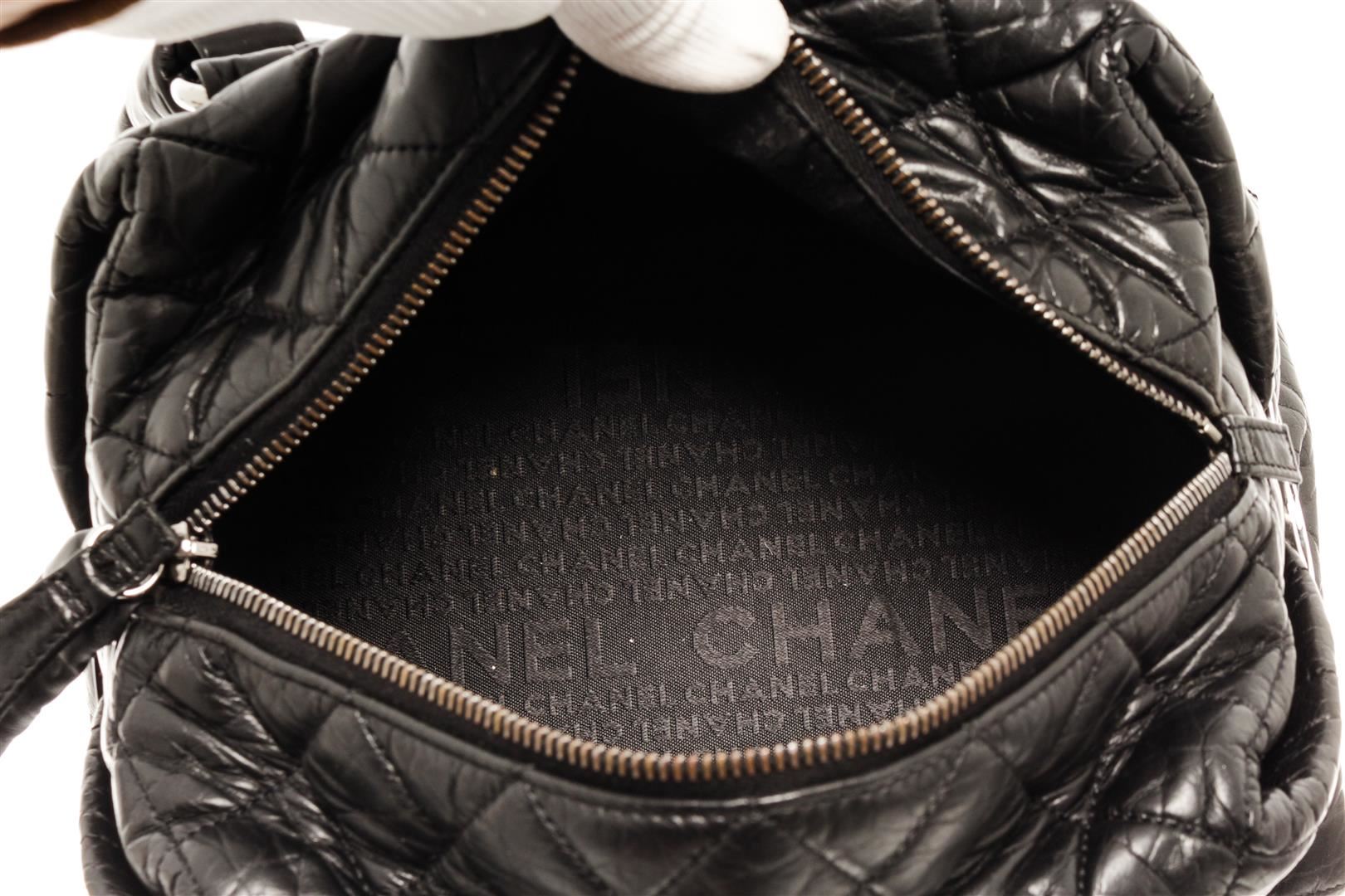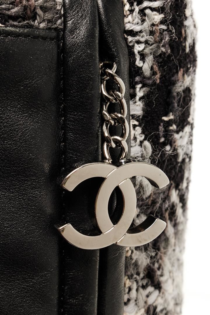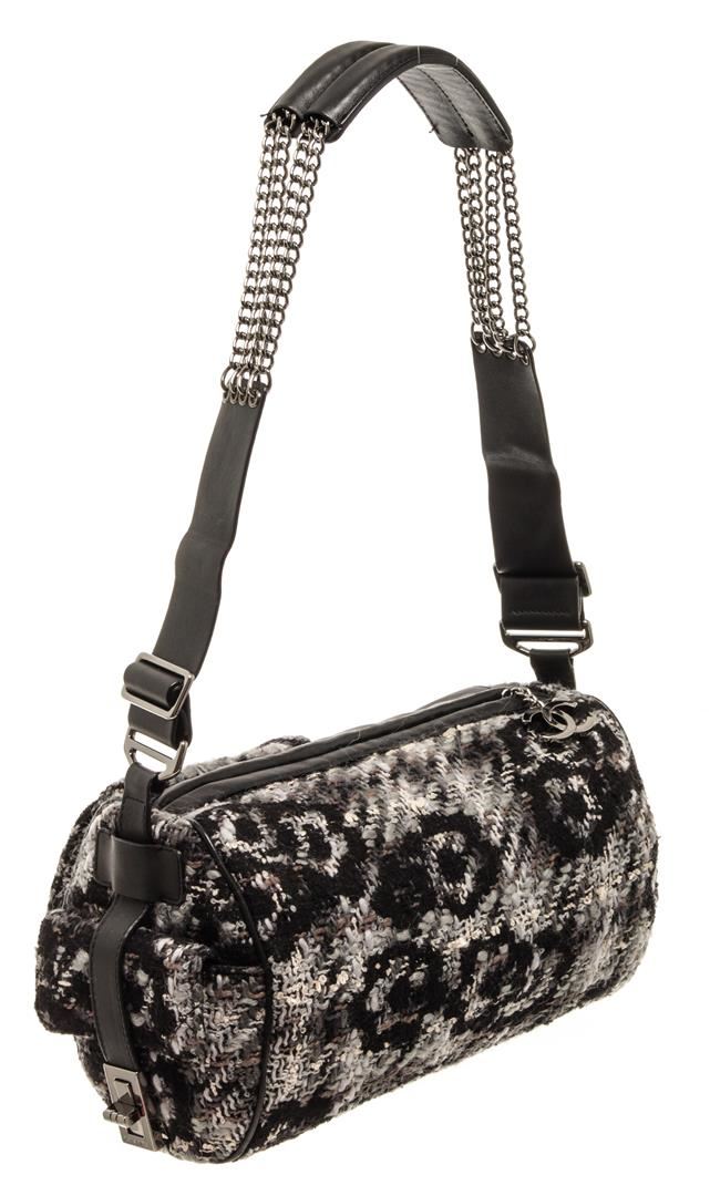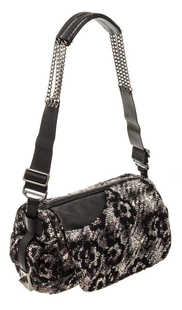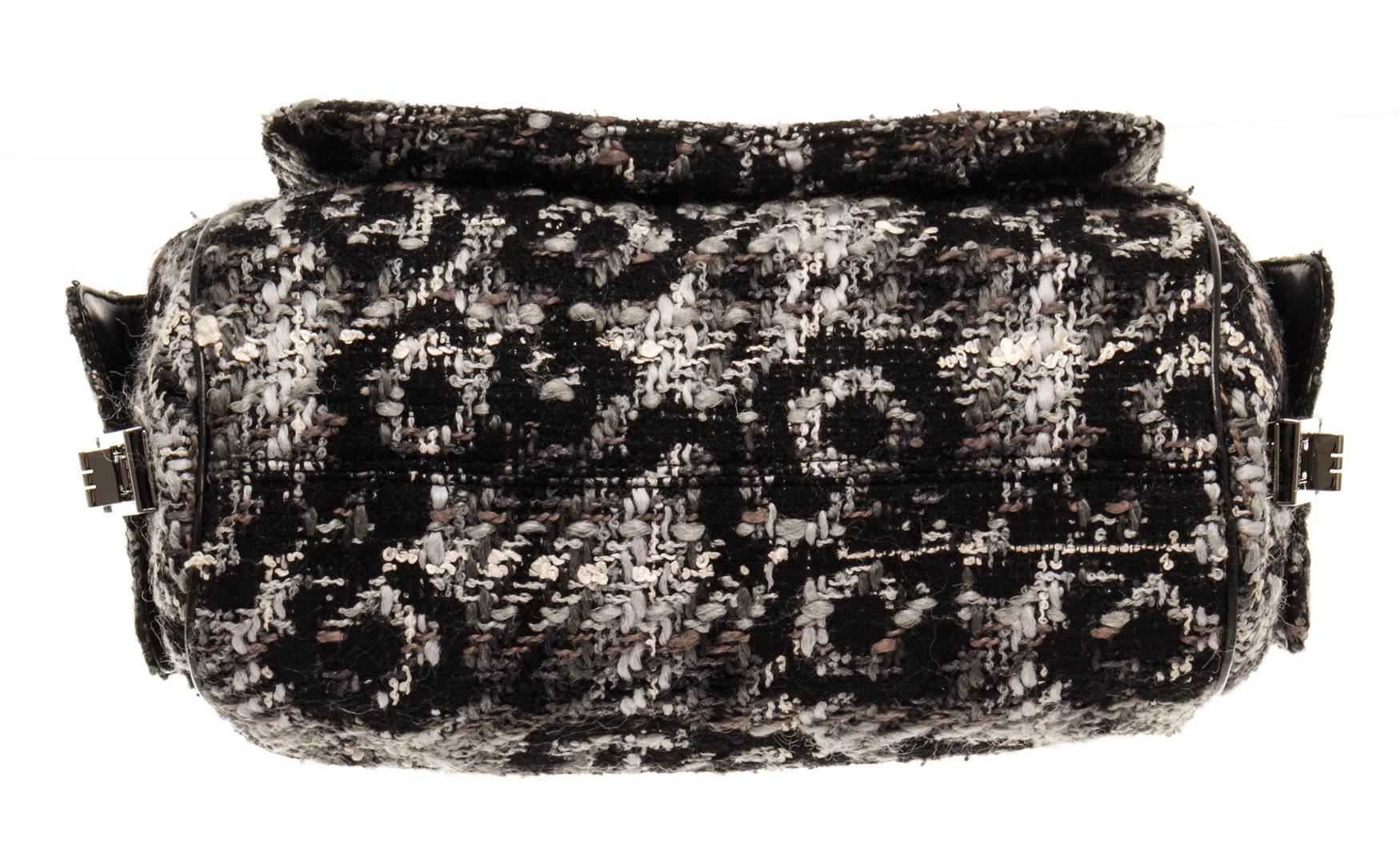 One Chanel Black 2.55 Tweed Chain Shoulder Bag. Item is sold AS-IS. All available information is listed in the description and shown in the photo. Chanel black 2.55 tweed chain shoulder bag with flower patterned black, grey, and white tweed exterior; black Chanel patterned fabric lining, adjustable strap with thin silver-toned chains and black leather shoulder pad; silver-tone hardware, zipper closure, interlocking CC logo as zipper tab, and one interior zip pocket. Height: 6 in (15.24 cm), Width: 7 in (17.78 cm), Length: 12.5 in (31.75 cm)