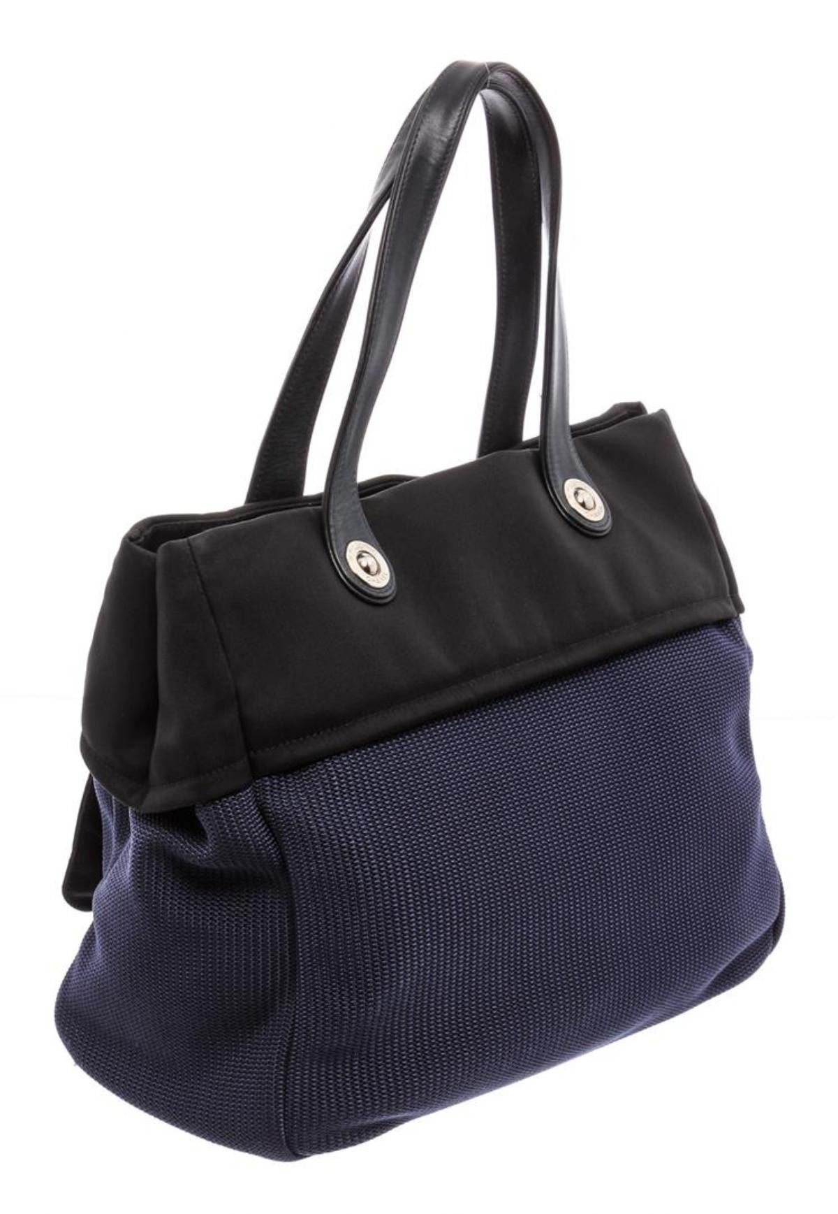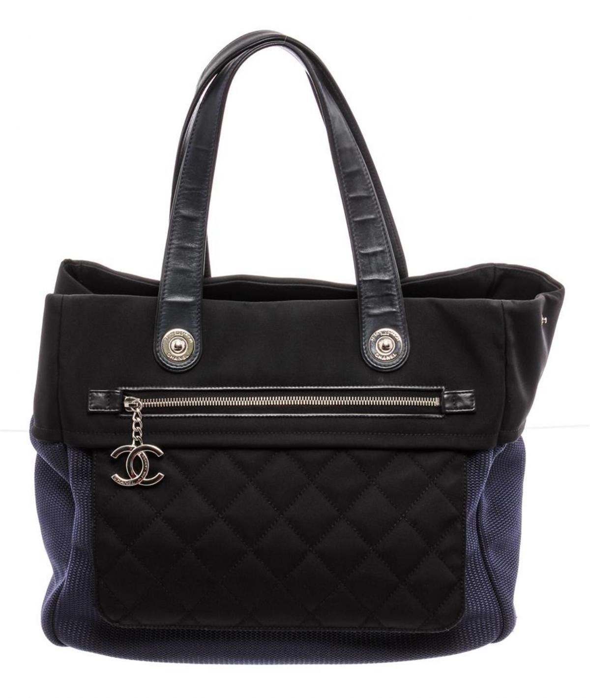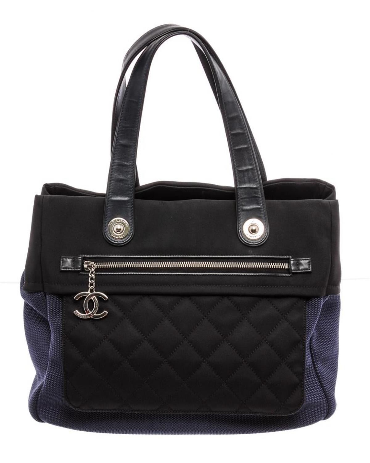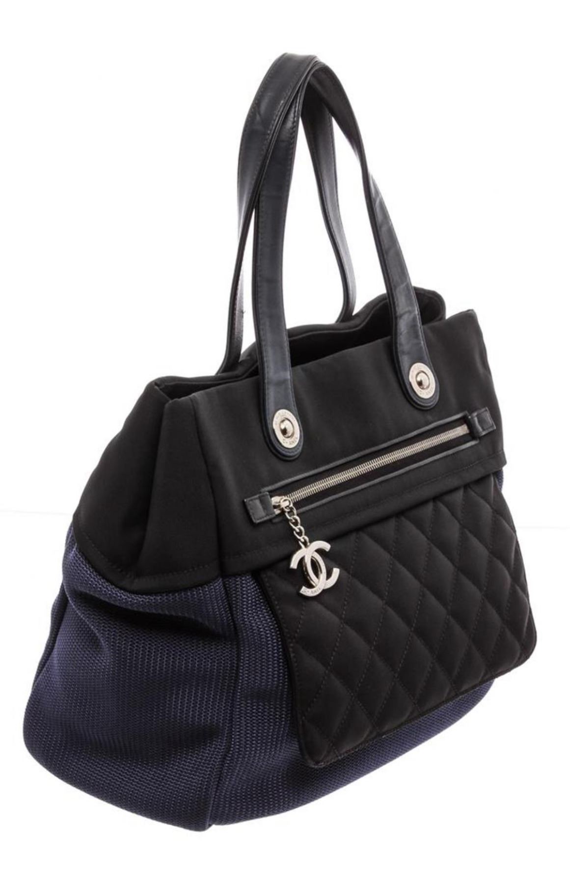 Black and Blue canvas Chanel Rue Cambon Large Shopping tote with silver-tone hardware, black leather trim, single zip pocket at front, interlocking CC logo charm at front, tonal stitching, dual flat shoulder straps, black canvas lining, dual pockets at interior wall, single zip pocket and magnetic snap closure at top.
