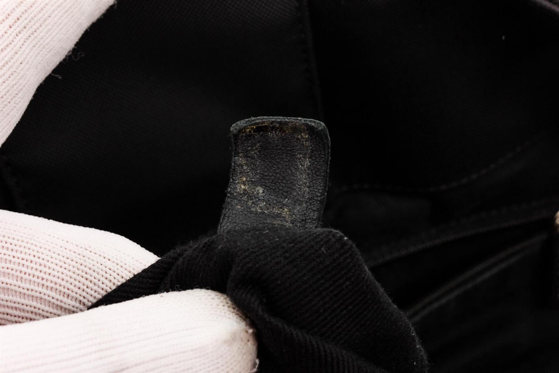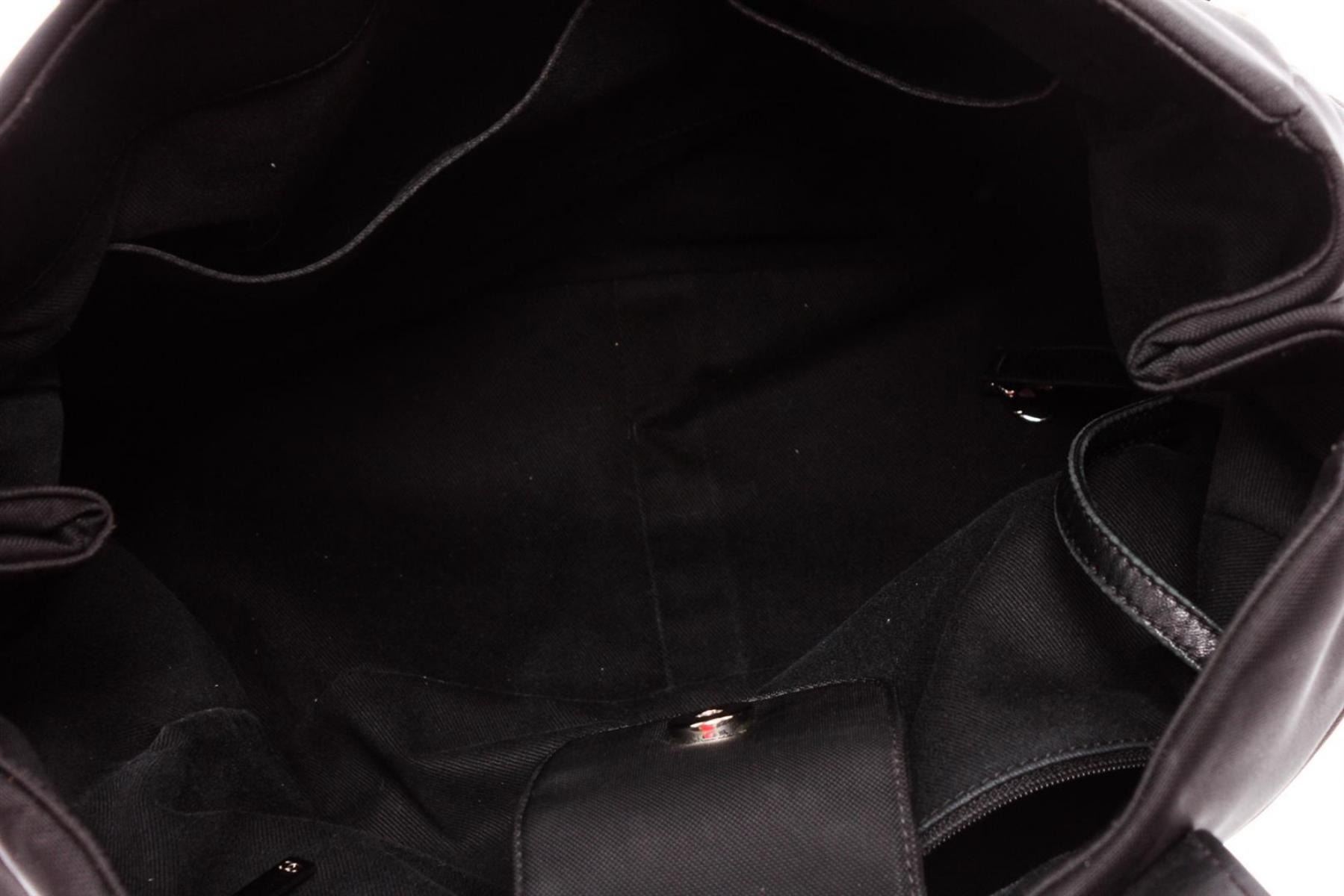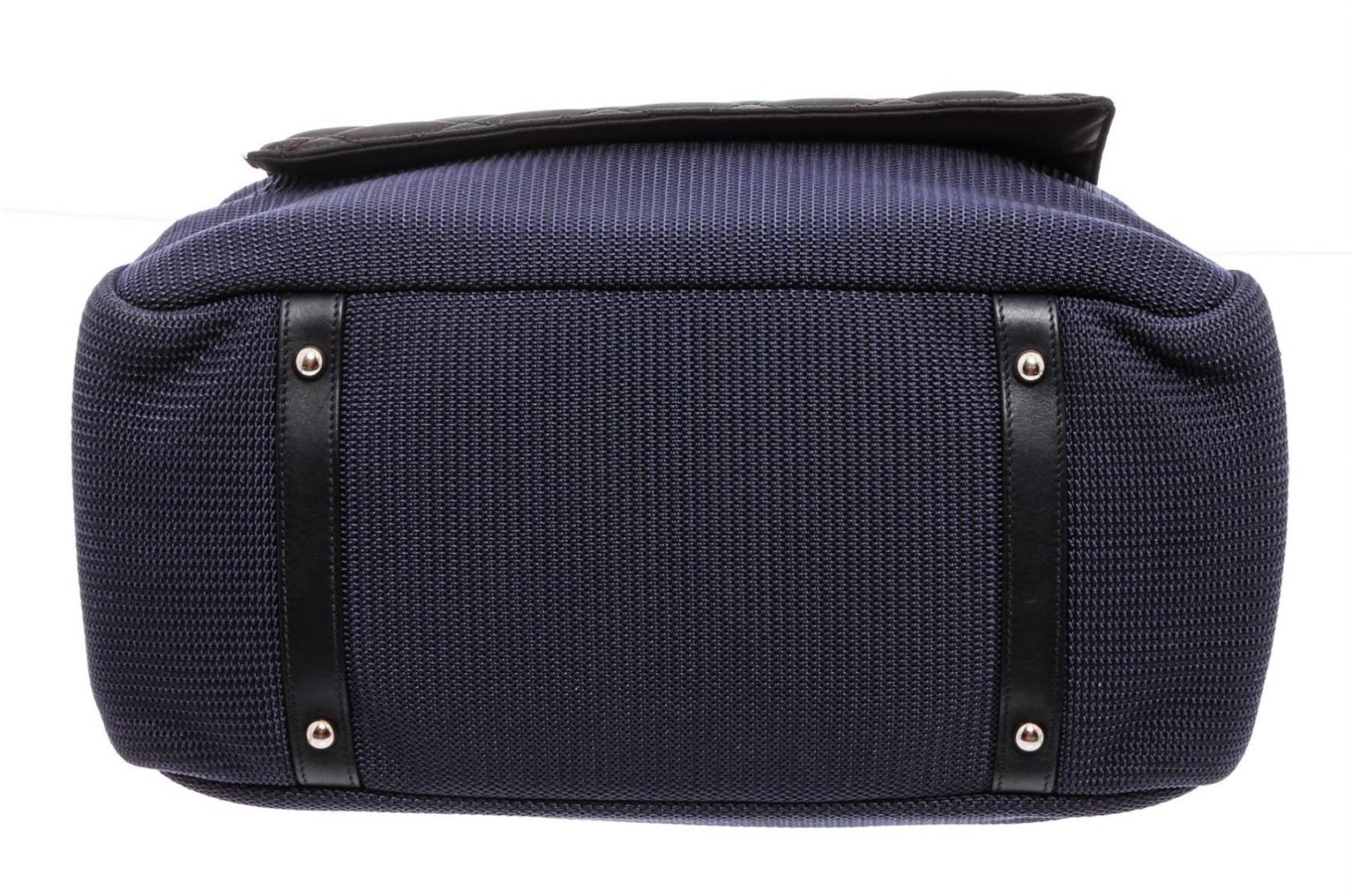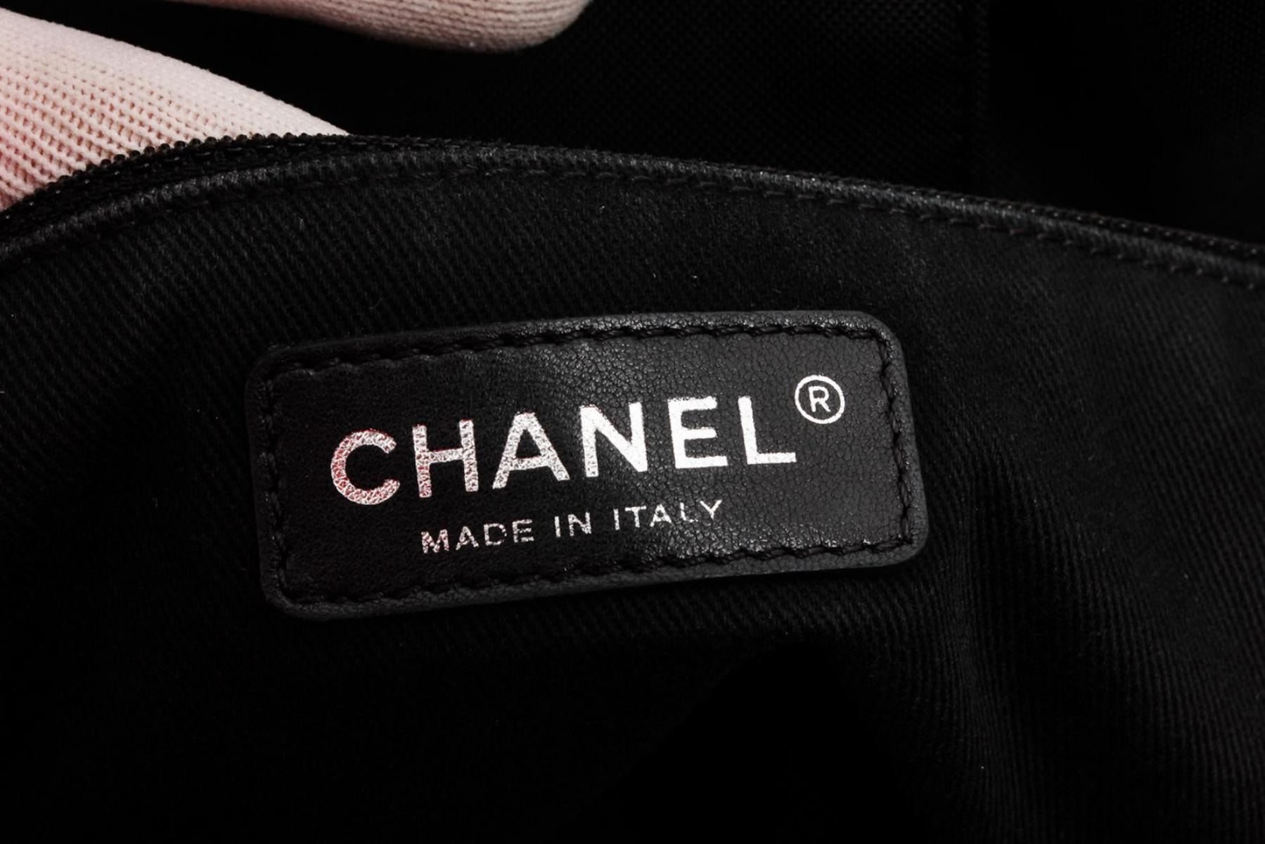 Black and Blue canvas Chanel Rue Cambon Large Shopping tote with silver-tone hardware, black leather trim, single zip pocket at front, interlocking CC logo charm at front, tonal stitching, dual flat shoulder straps, black canvas lining, dual pockets at interior wall, single zip pocket and magnetic snap closure at top.