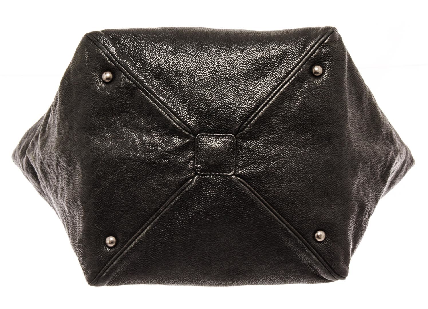 Chanel Black Caviar Leather CC Chain Tote Bag. All available information is listed in the description and shown in the photos. Chanel Black Caviar Leather CC Chain Tote Bag with gold-tone harware, caviar leather body, chain straps with leather guard, open top with hook closure, and interior zip pocket.