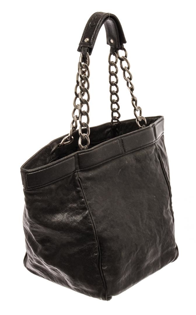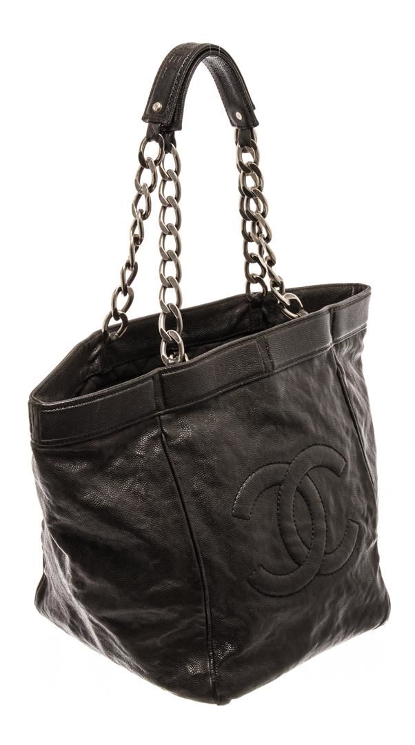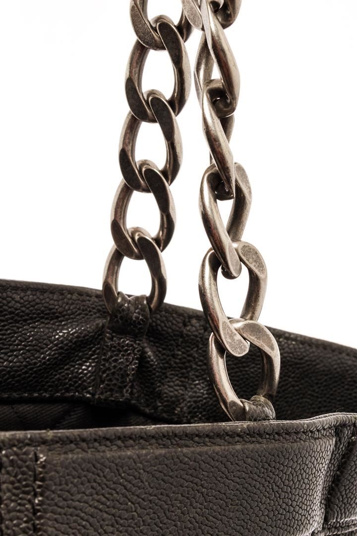 Chanel Black Caviar Leather CC Chain Tote Bag. All available information is listed in the description and shown in the photos. Chanel Black Caviar Leather CC Chain Tote Bag with gold-tone harware, caviar leather body, chain straps with leather guard, open top with hook closure, and interior zip pocket.