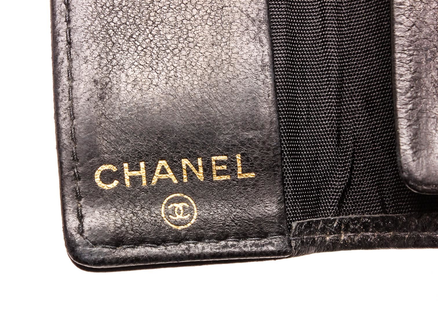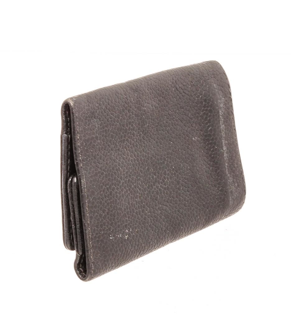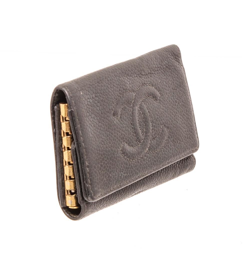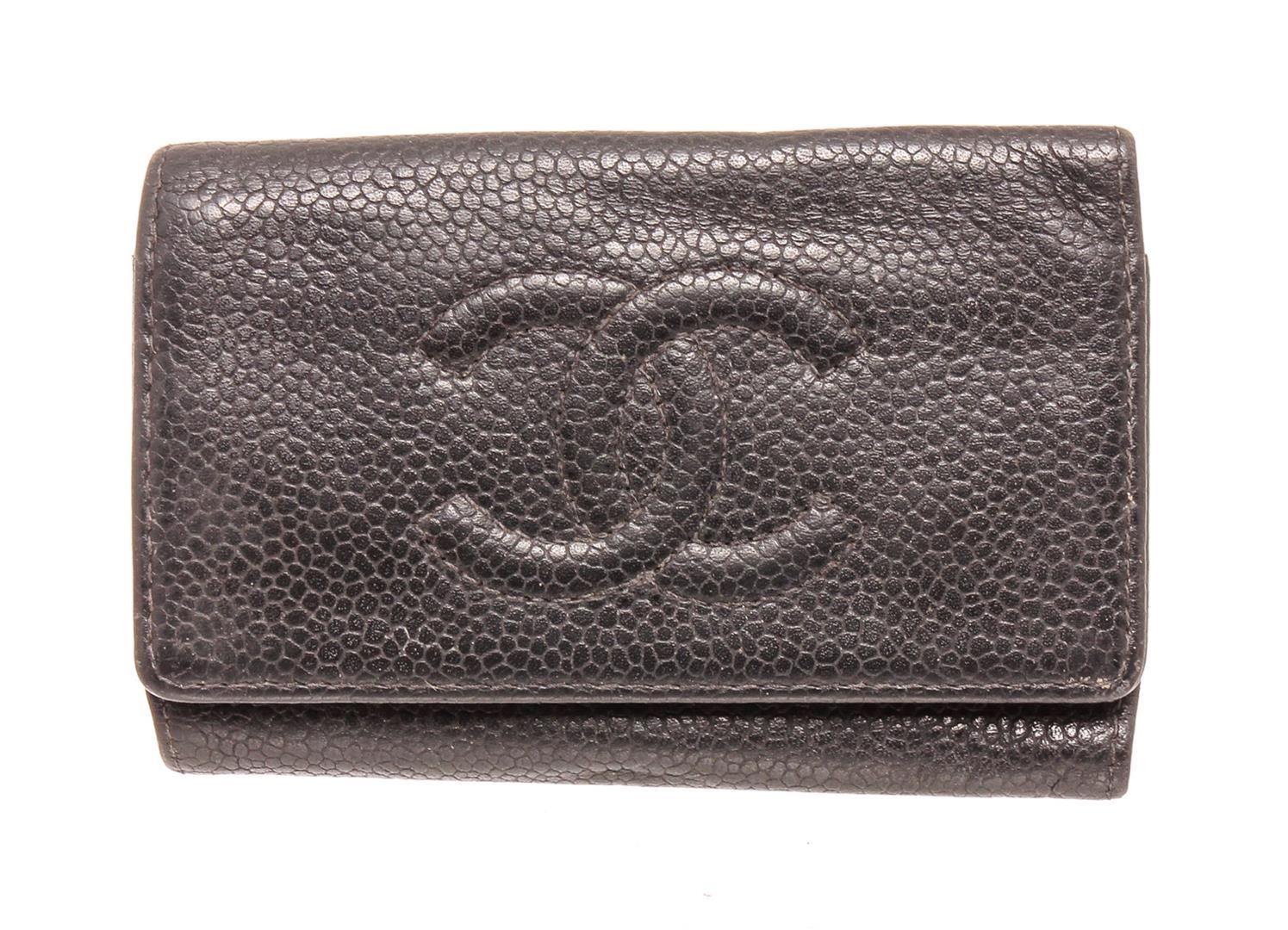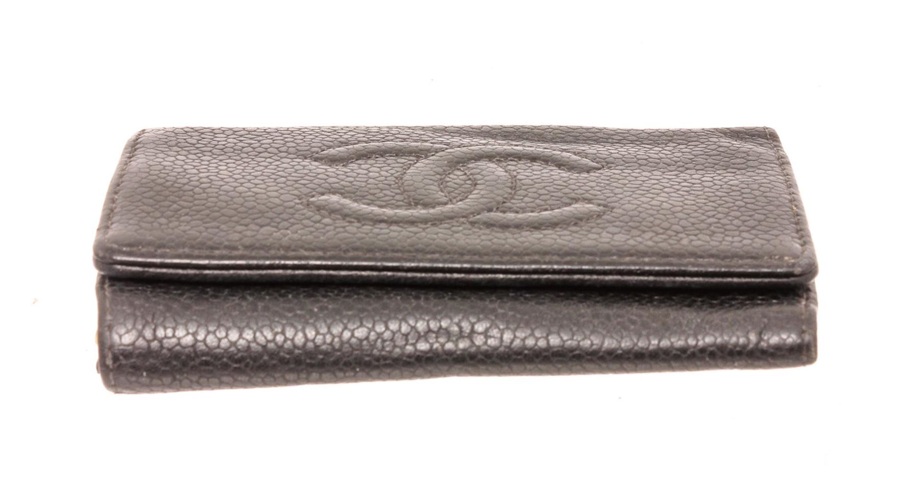 Chanel black caviar leather six key holder with gold-tone hardware, embossed and stitched logo on front, six hook closures, two slip pockets at interior and overall dual snap closure at front.