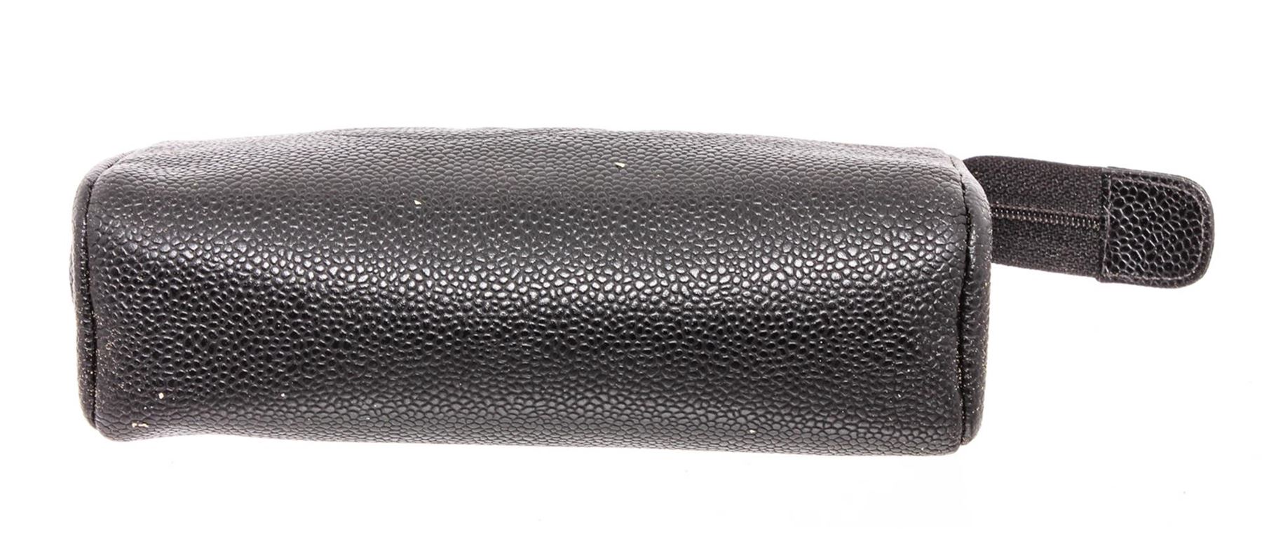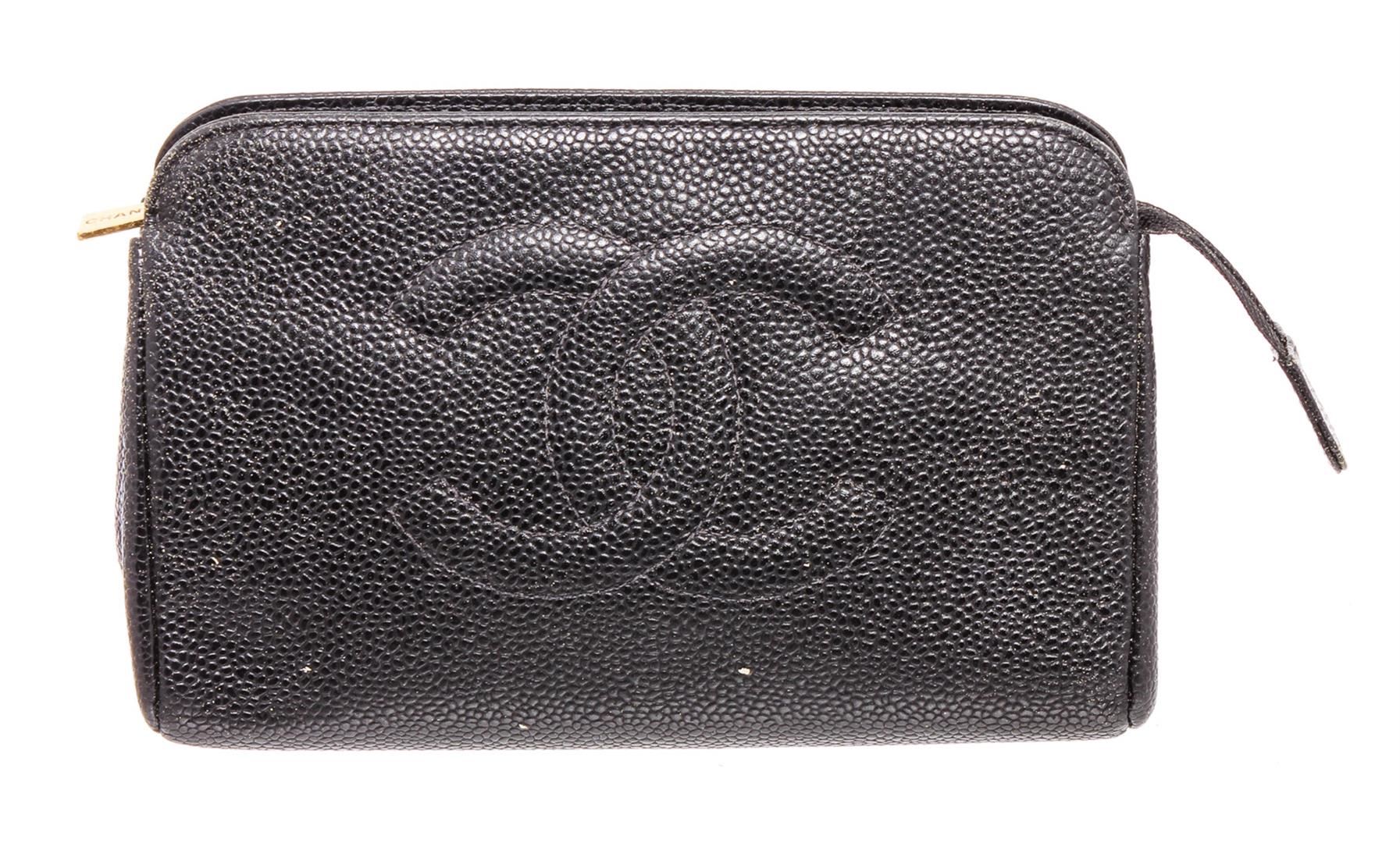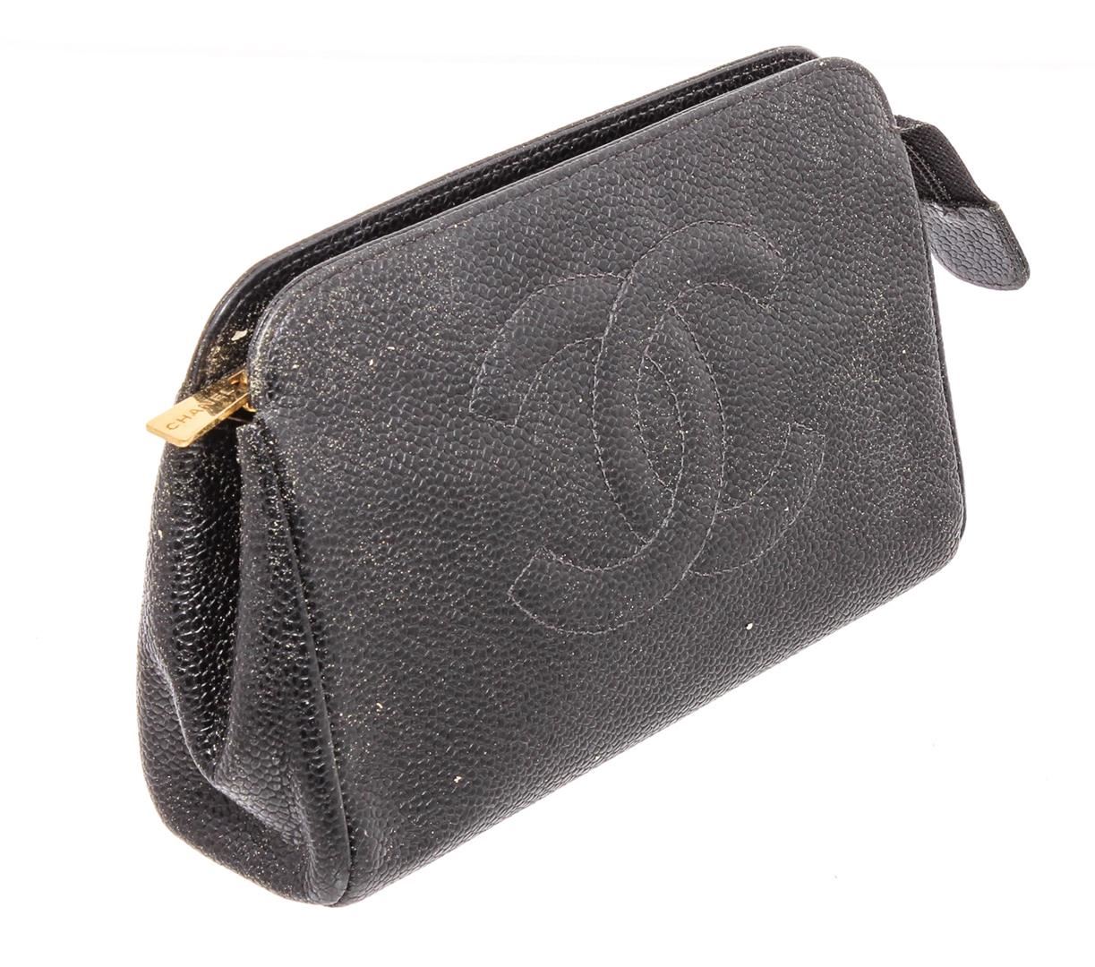 Black caviar leather Chanel Timeless CC cosmetic pouch with gold-tone hardware, stitched CC logo on face, beige leather interior and overall zip closure at top. Please see photos interior has peeling.