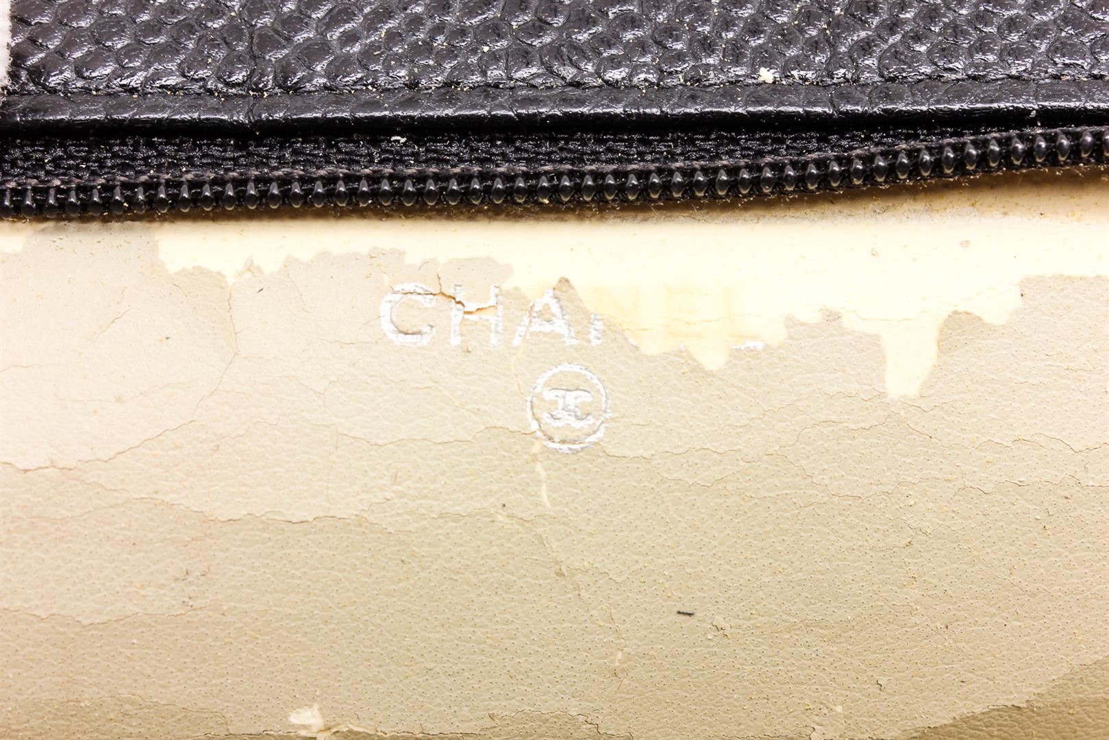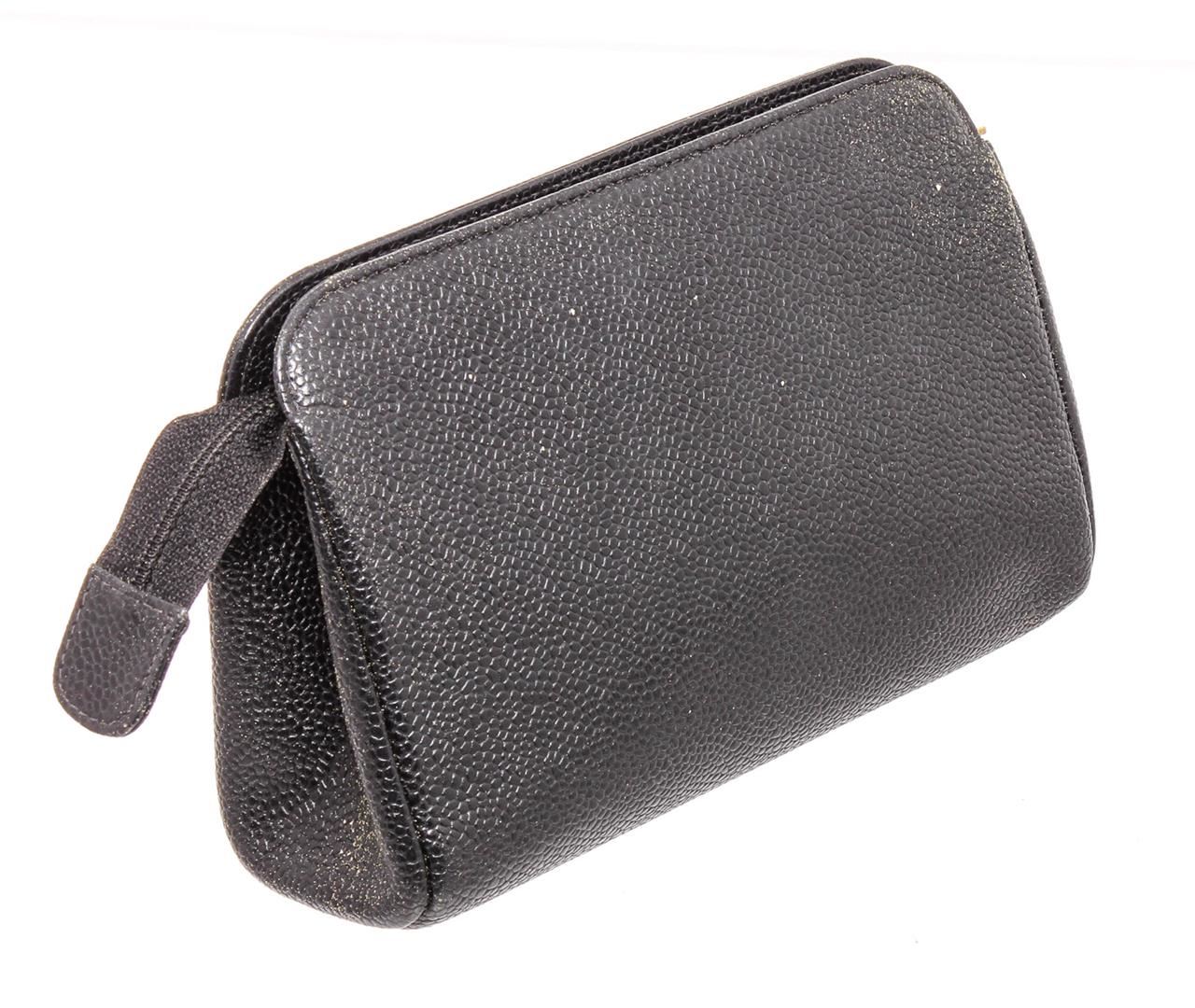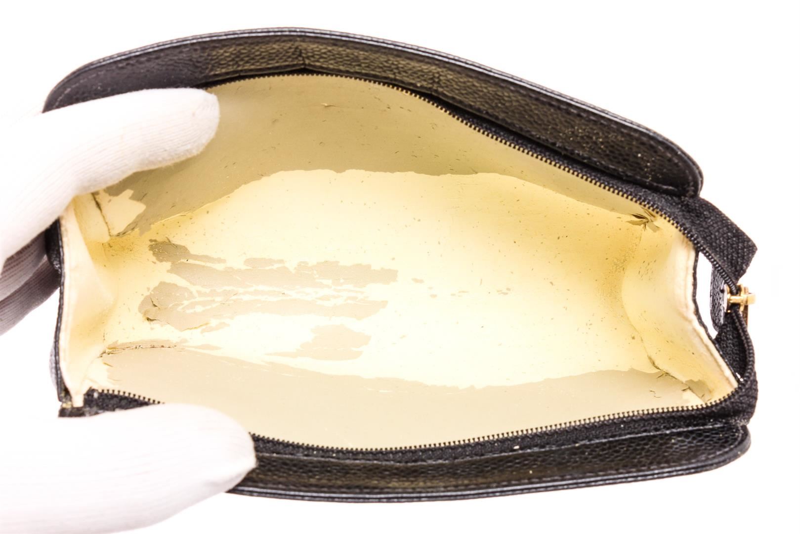 Black caviar leather Chanel Timeless CC cosmetic pouch with gold-tone hardware, stitched CC logo on face, beige leather interior and overall zip closure at top. Please see photos interior has peeling.