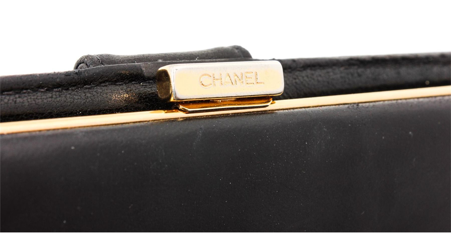 Black Caviar leather vintage Chanel Timeless French Purse wallet with gold-tone hardware, embossed logo at front face, single interior compartment with snap closure, three bill compartments, tonal leather lining, six card slots at interior wall and snap closure at front strap.