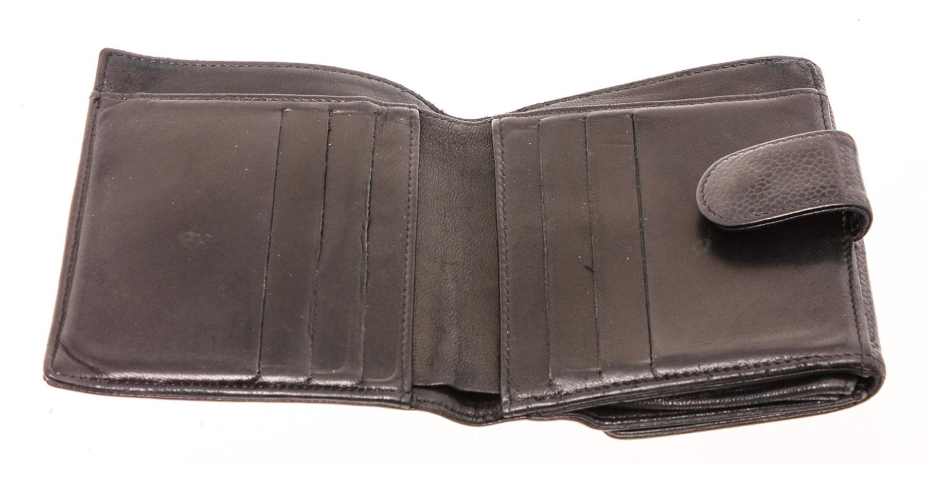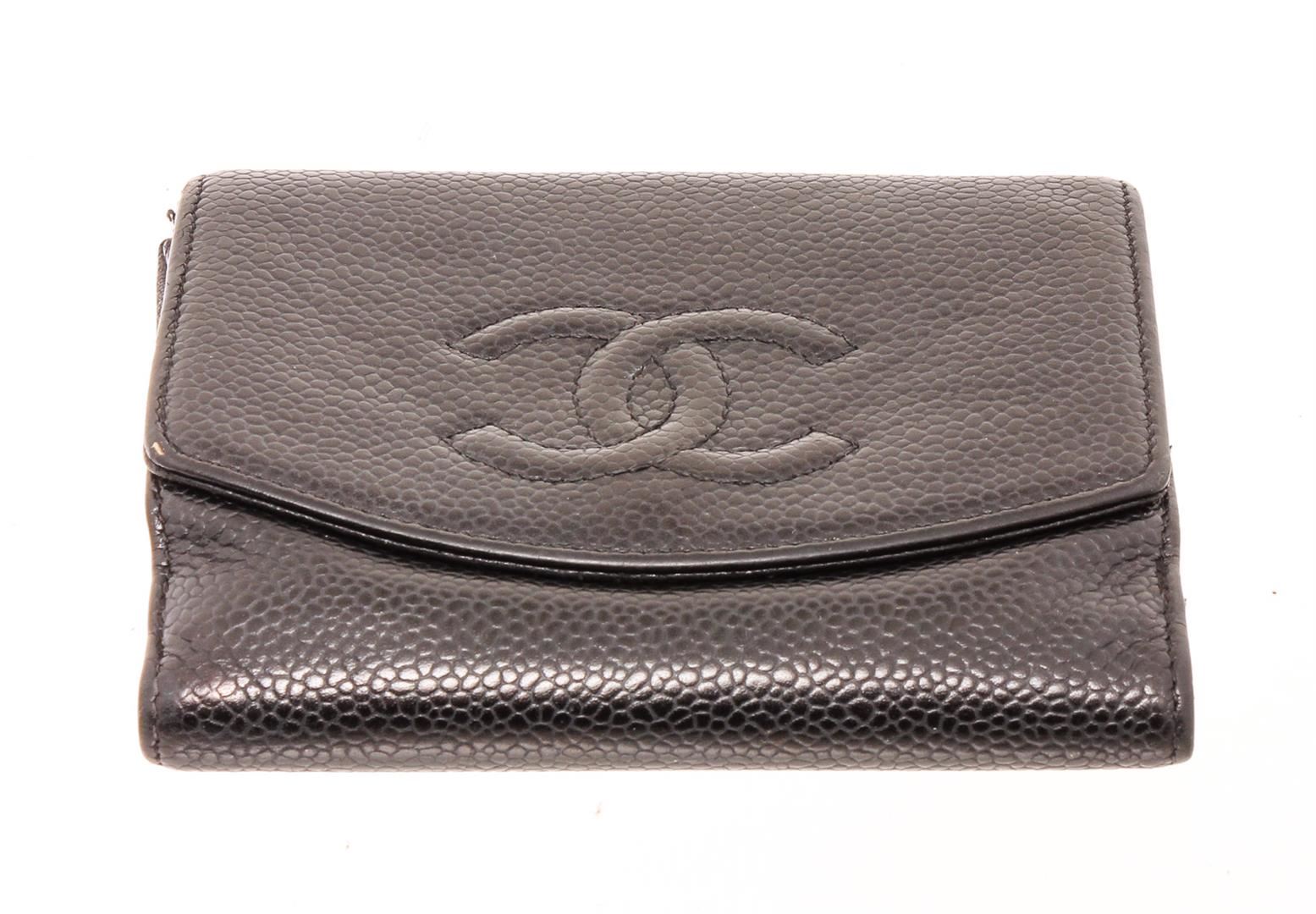 Chanel black caviar leather timeless french purse wallet with gold-tone hardware, embroidered and stitched CC at front, exterior flap pocket, leather interior, six card slots, two slit pockets, bill compartment and exterior snap closure at tab.