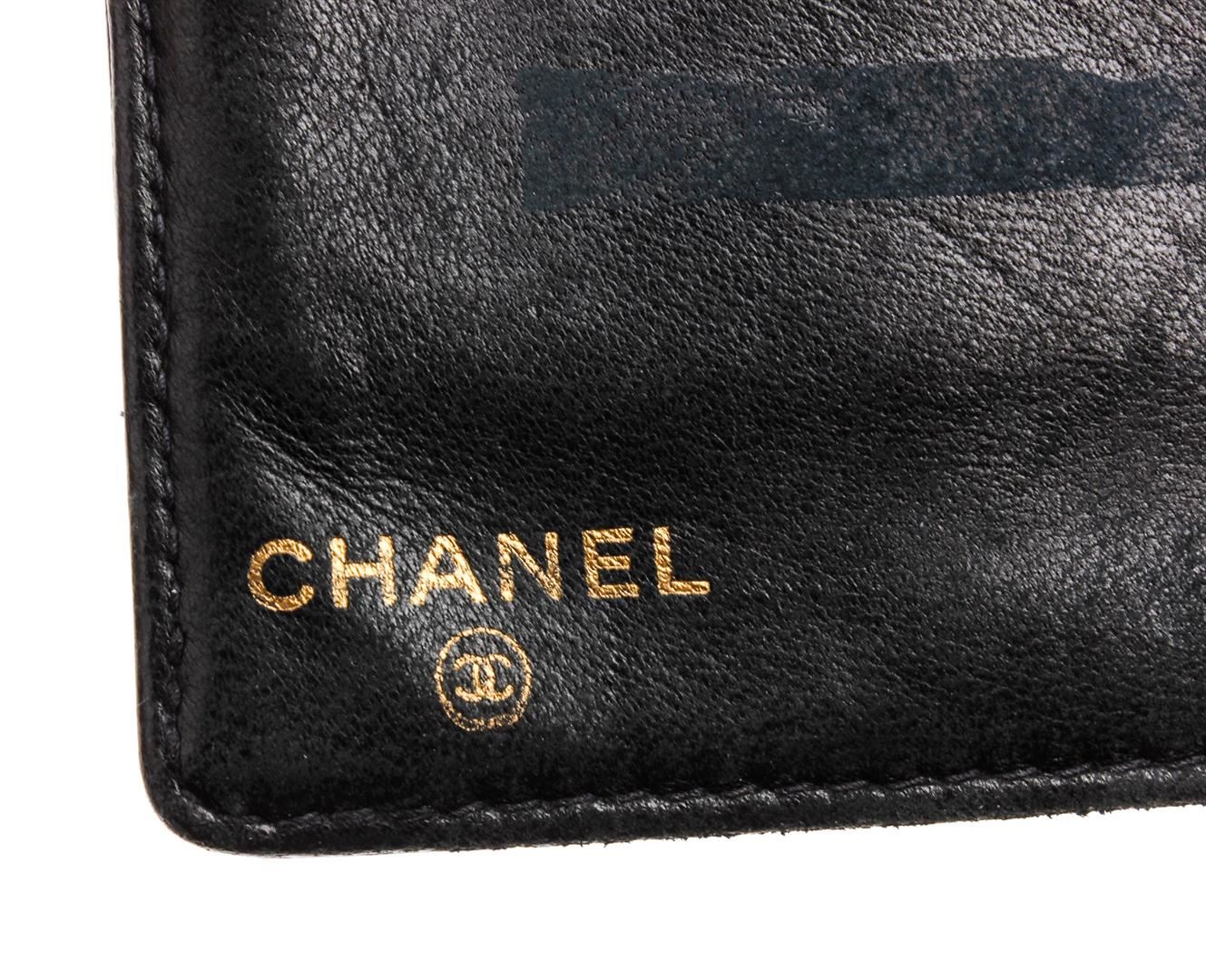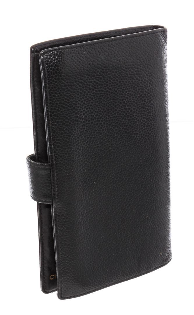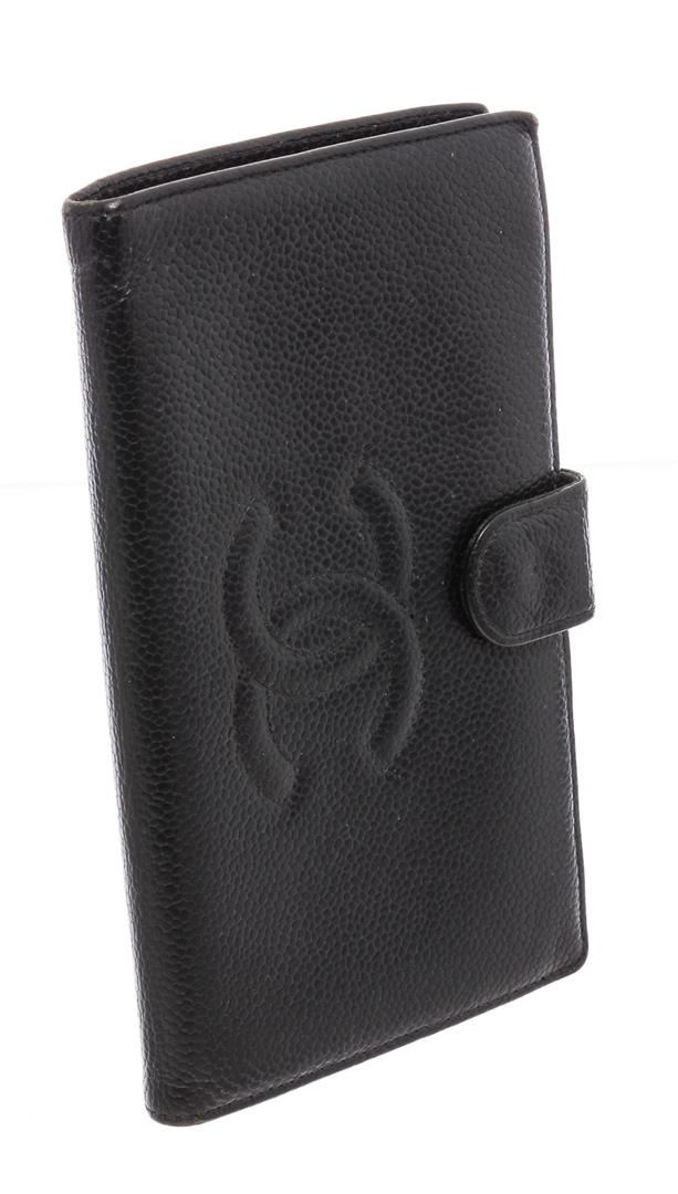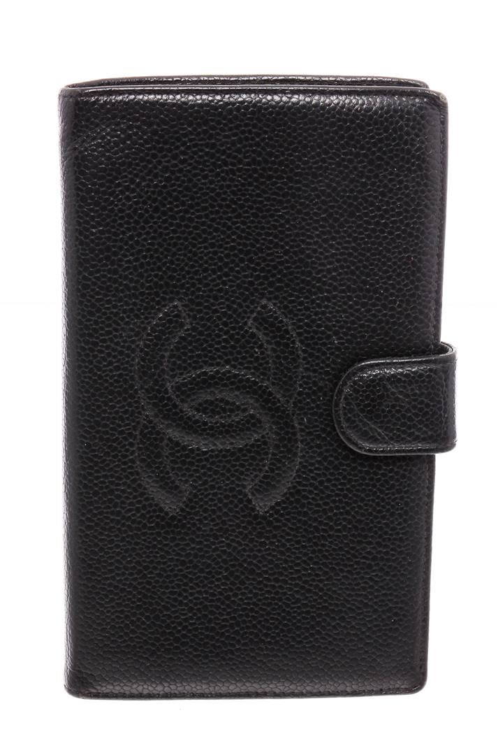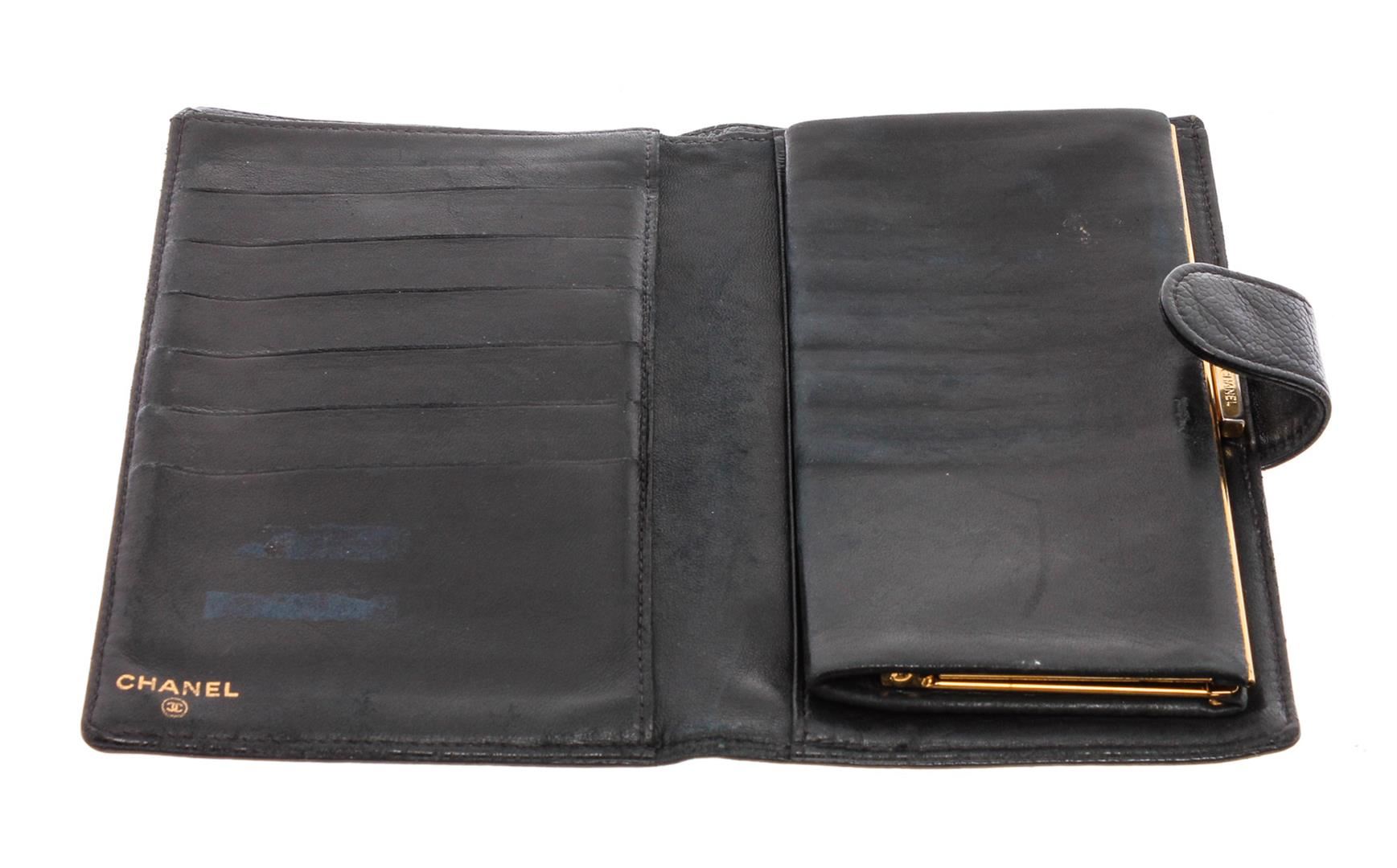 Black Caviar leather Chanel Timeless French Purse wallet with gold-tone hardware, tonal leather lining, single bill compartment, three pockets at interior; one with push-lock closure, six card slots and snap closure at front.