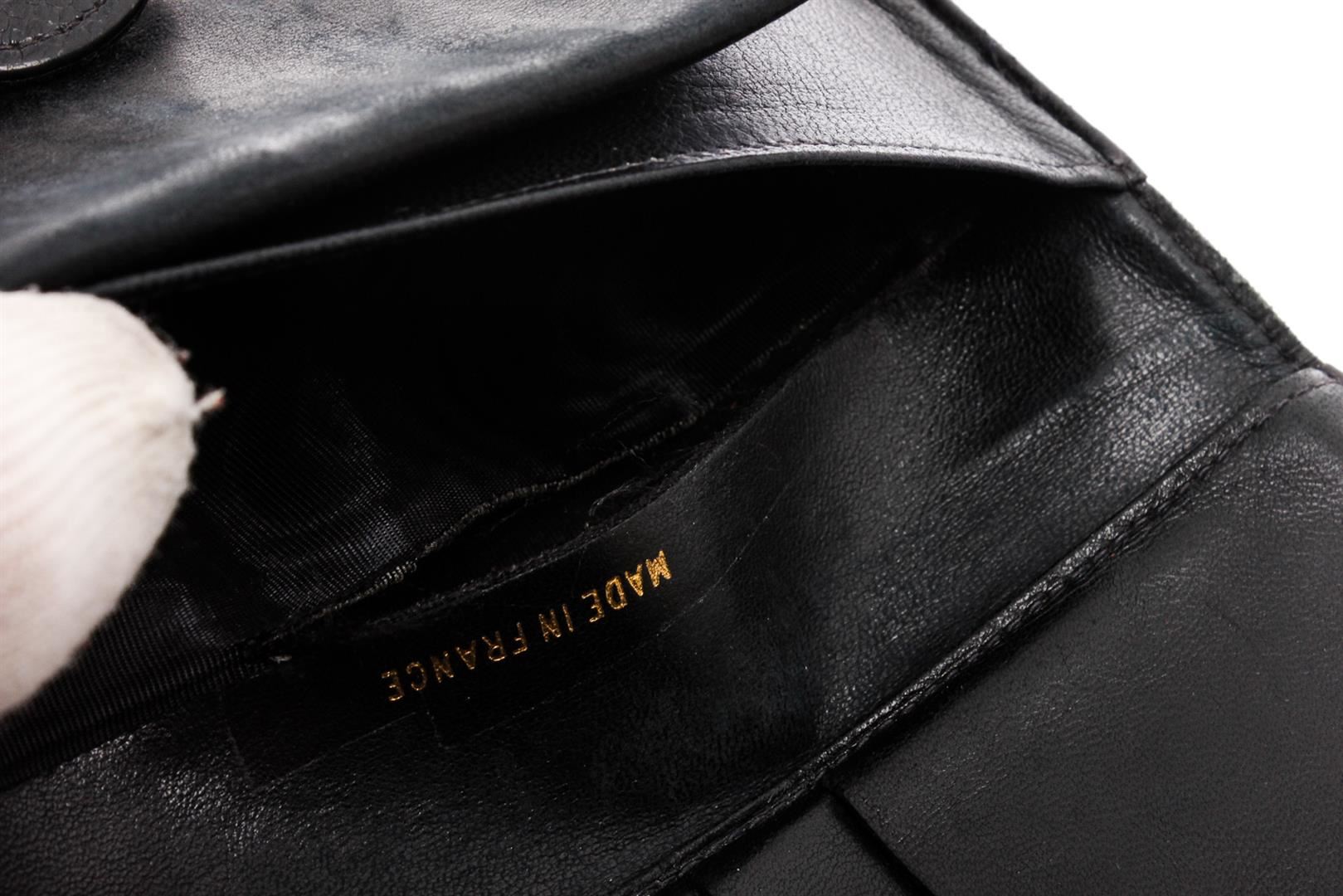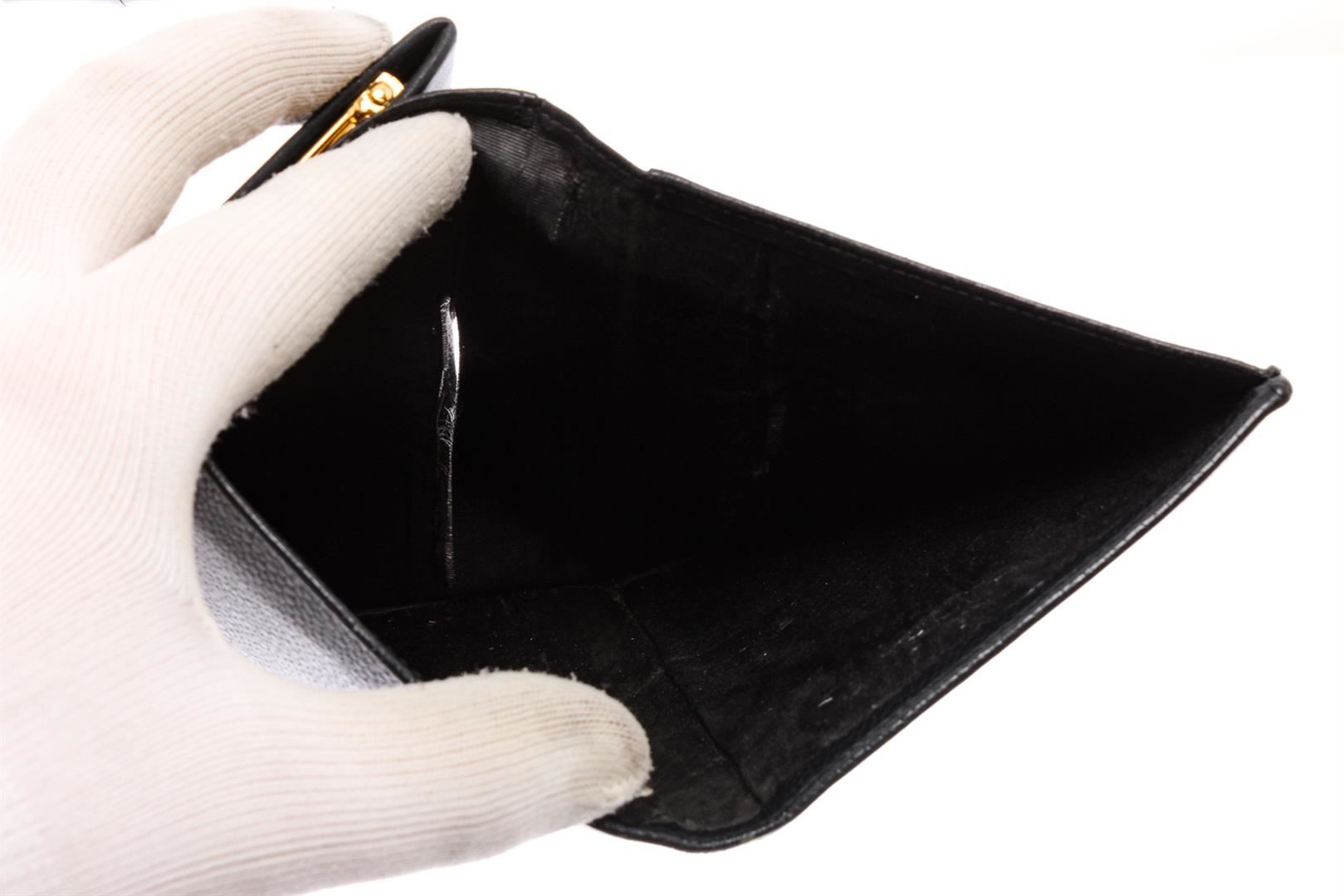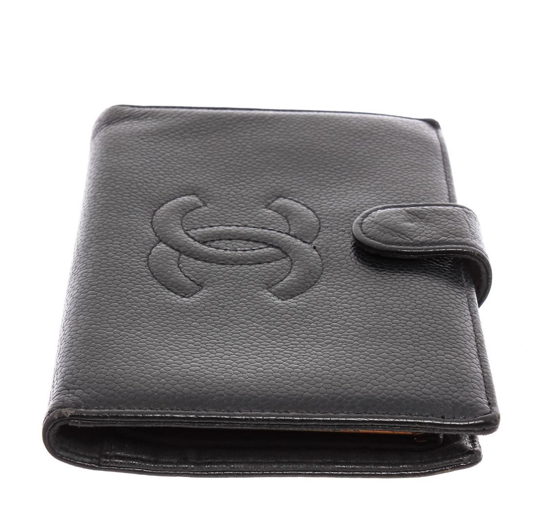 Black Caviar leather Chanel Timeless French Purse wallet with gold-tone hardware, tonal leather lining, single bill compartment, three pockets at interior; one with push-lock closure, six card slots and snap closure at front.