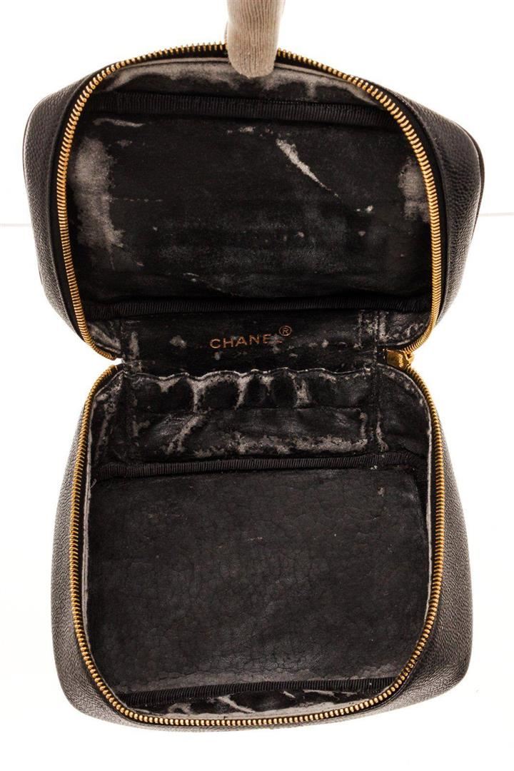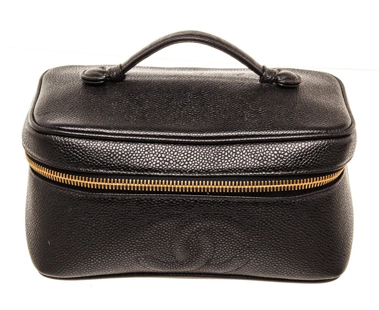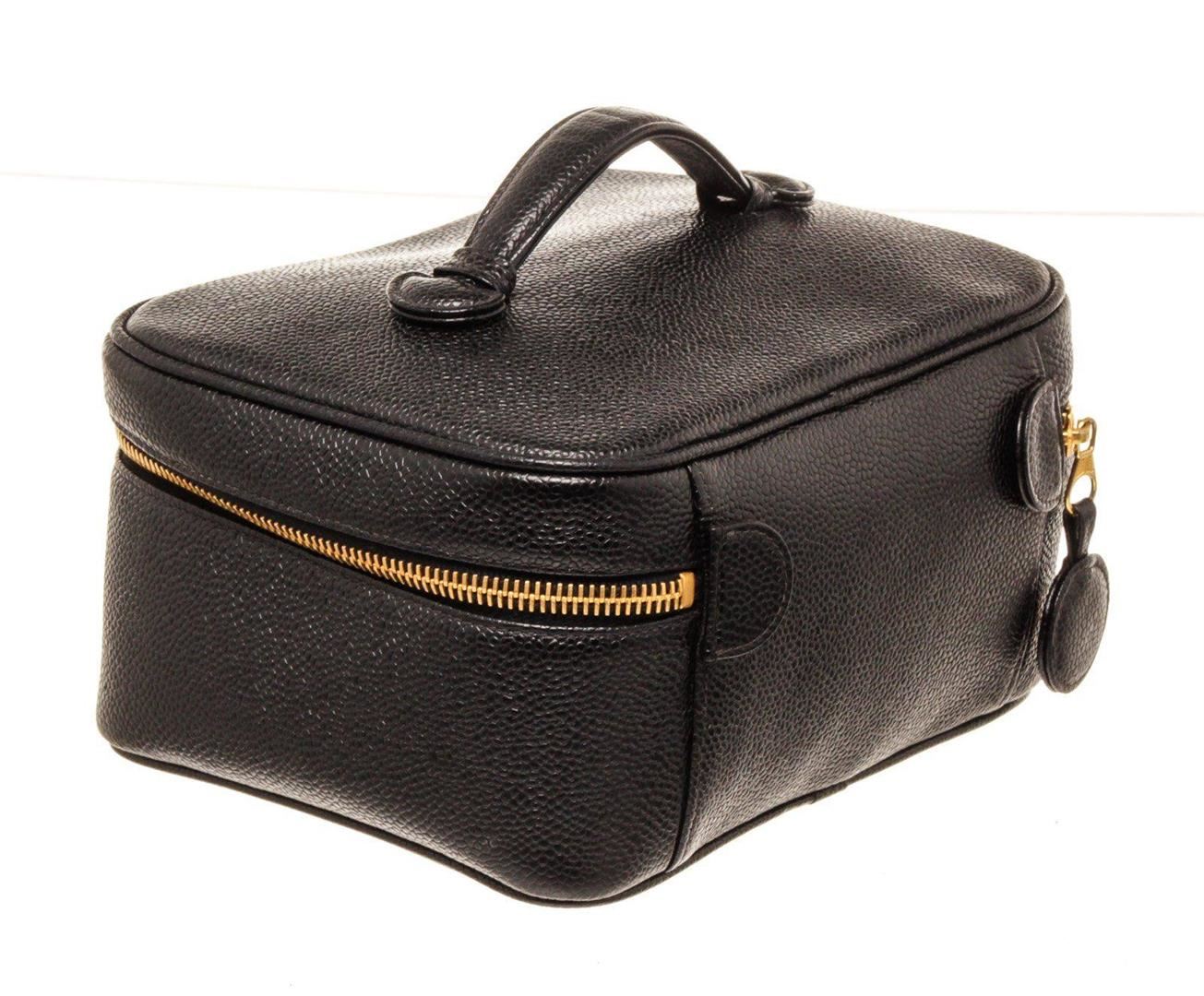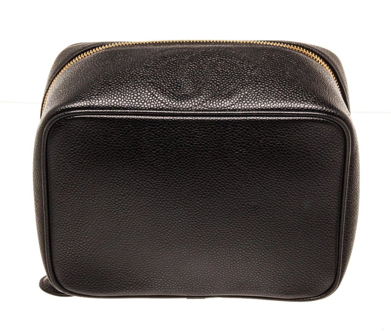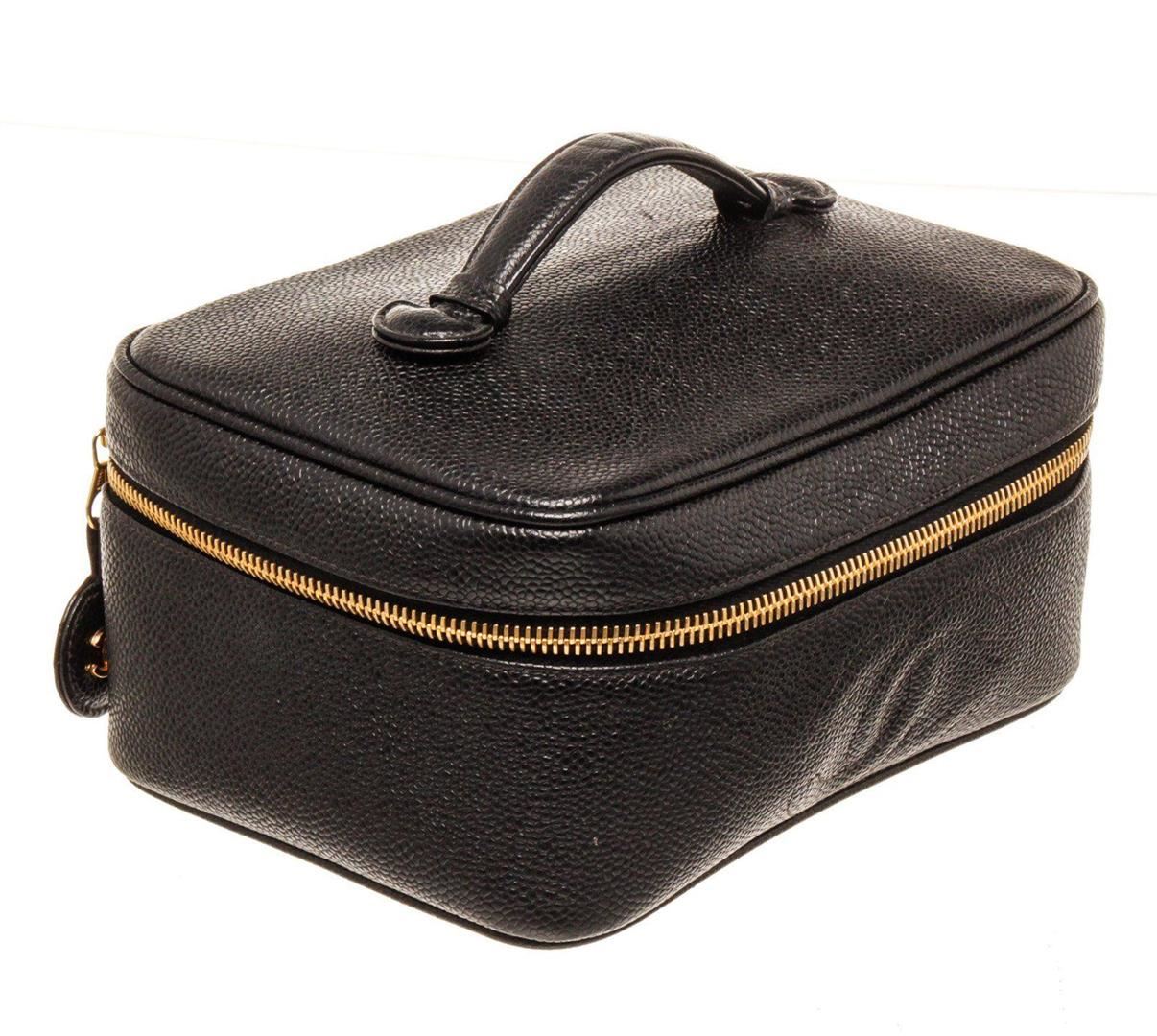 Chanel Black Caviar Leather Vanity Case Bag. All available information is listed in the description and shown in the photos. Chanel Black Caviar Leather Vanity Case Bag with caviar leather, gold-tone hardware, single flat top handle, stitched CC logo accent at front face, tonal leather lining, single elasticized slit pocket at interior wall and zip-around closure at top. 41778