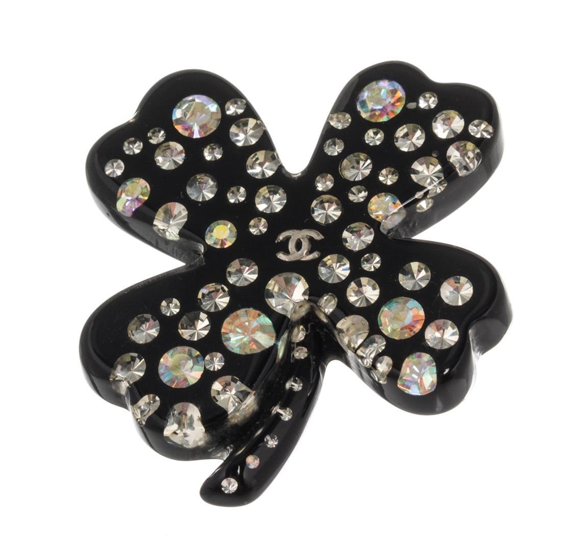 One Chanel Black Clover Rhinestone Brooch. Item is sold AS-IS. All available information is listed in the description and shown in the photo. Chanel Black clover rhinestone brooch with CC logo at the center and silver-tone hardware.