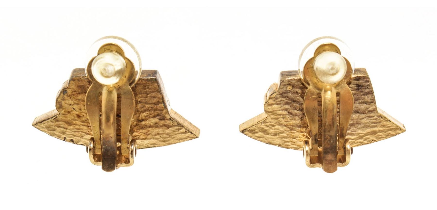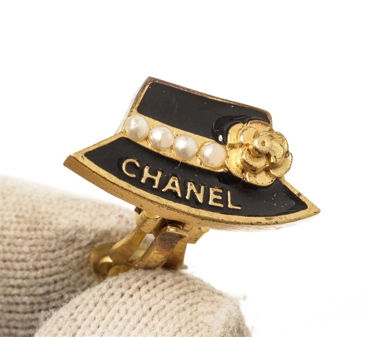 Chanel Black Gold & Pearls Metal Hat Earring. All available information is listed in the description and shown in the photos. chanel black gold & pearls metal hat earring with goldtone and black enamel earrings adorned with faux pearl's.