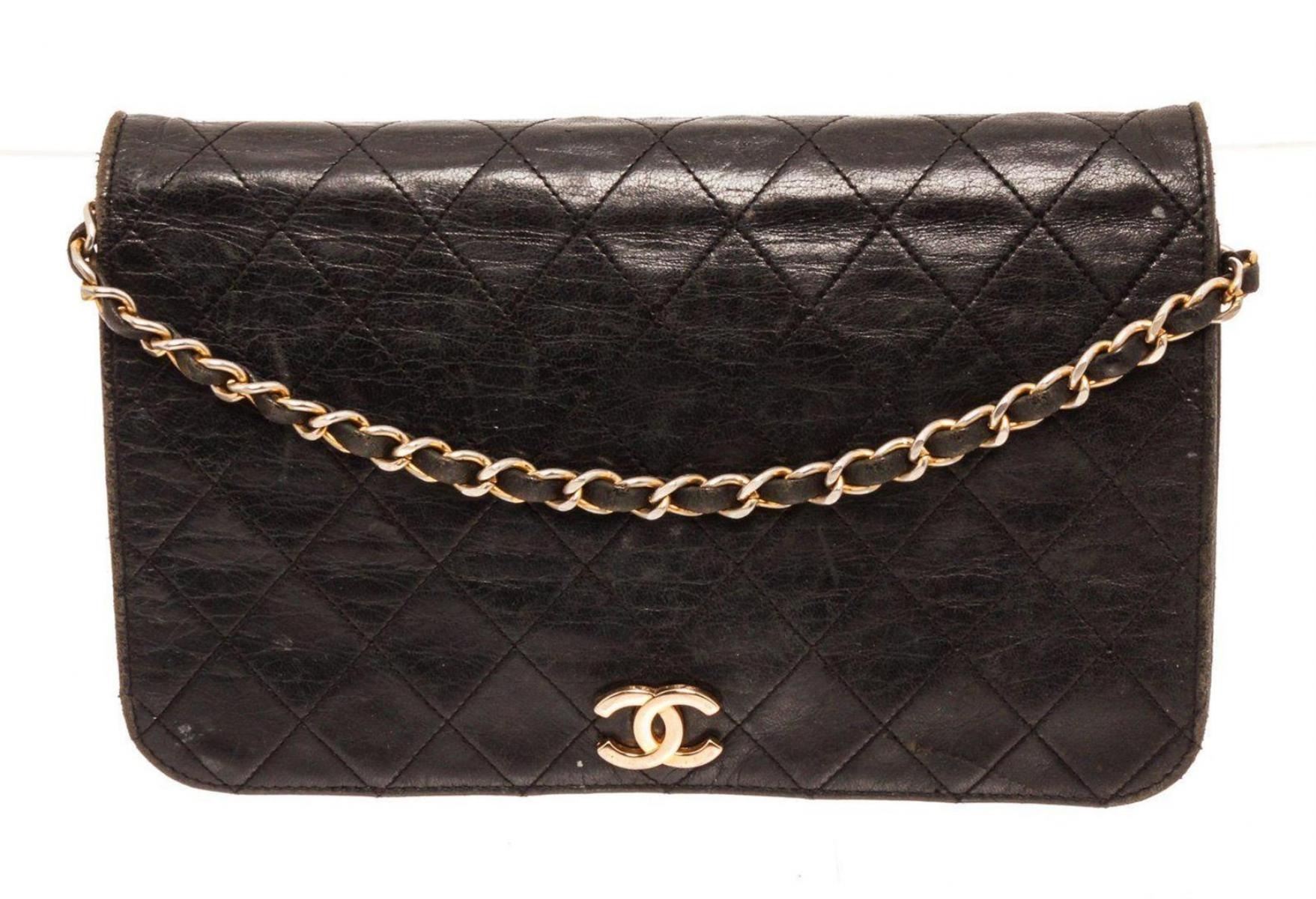 Chanel Black Lambskin Flap Shoulder Bag with material leather, gold-tone hardware, interior zip pockets, chain shoulder strap and flap closure. MEASUREMENTS: Length 7.5 in / 19 cm Width 11.5 in / 29 cm Height 2.25 in / 6 cm Condition: Pre-Owned Good overall, please see photographs for detail.
