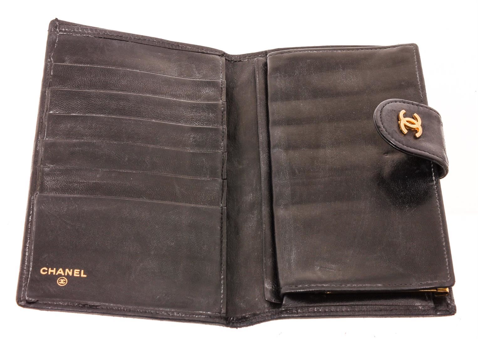 Chanel black lambskin leather french purse wallet with gold-tone hardware, Snap closure pocket on back, black leather interior lining with six card pockets and three slip pockets with overall snap closure at front.