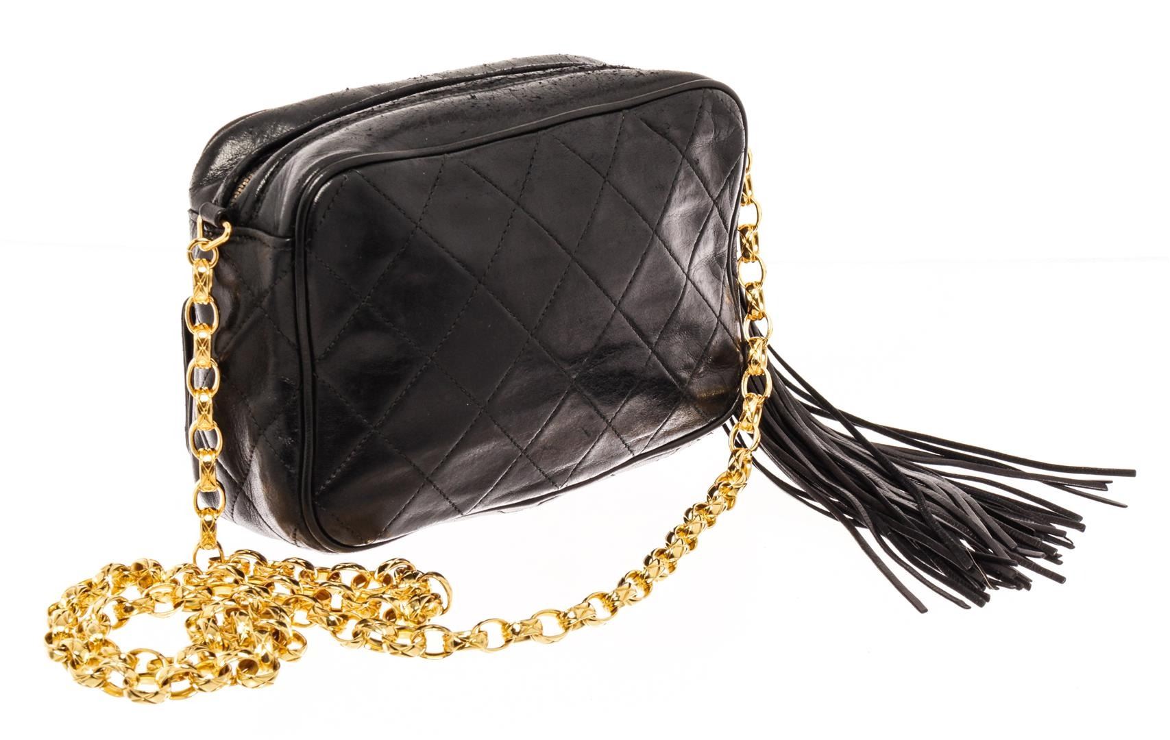 Chanel Black Lambskin Mini Tassel Camera Crossbody Bag. All available information is listed in the description and shown in the photos. chanel black lambskin mini tassel camera crossbody bag with exterior slip pocket with snap lock closure is accented by a hand-stitched "cc" logo located to front side of bag and one zipped pocket with serial logo to interior, interior pocket, full zip closure. 7" L x 5" H x 3" D / 9.98 x 12.7 x 7.62 CM