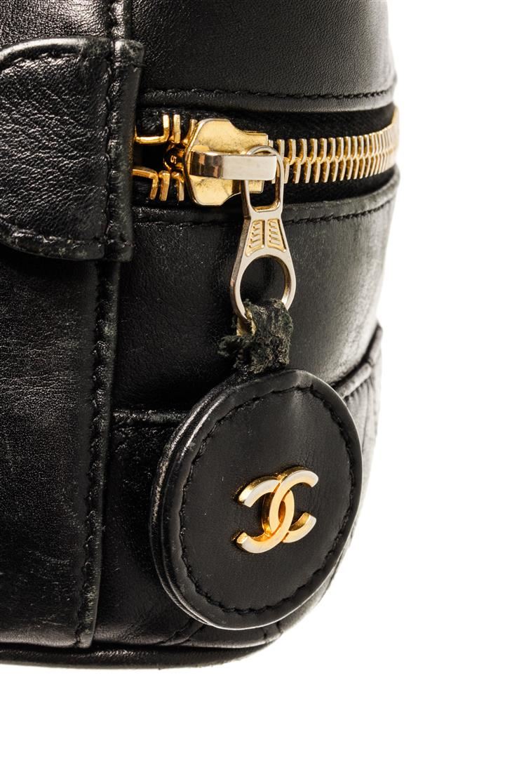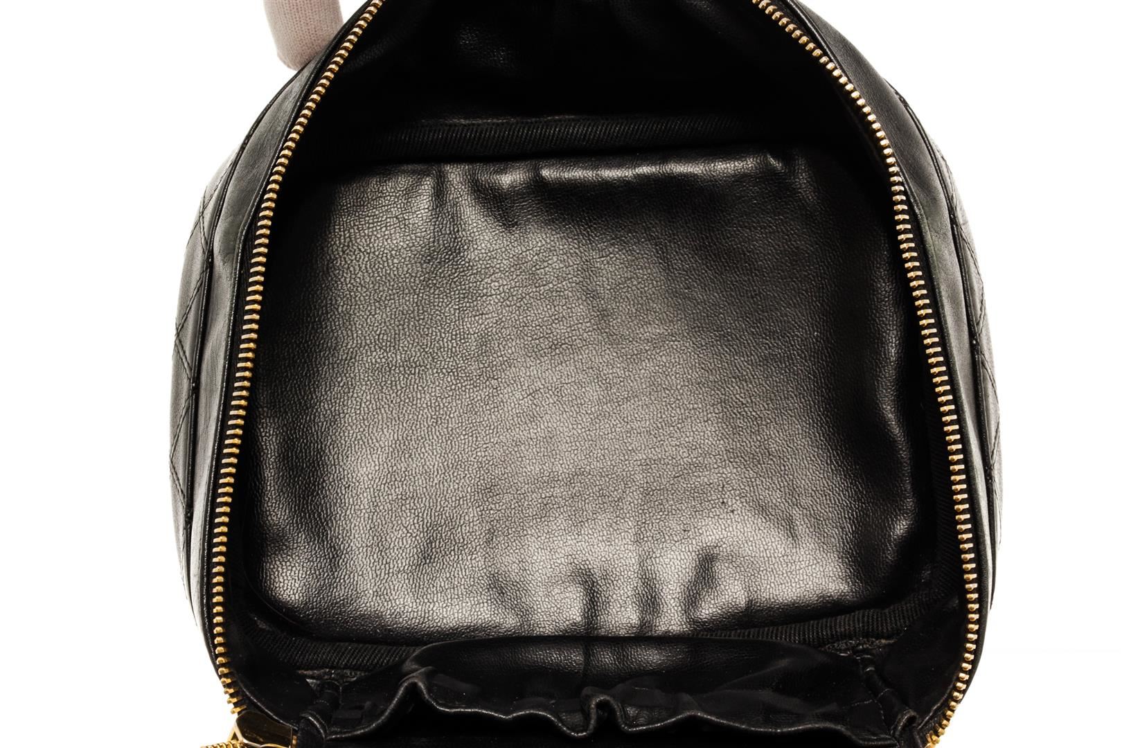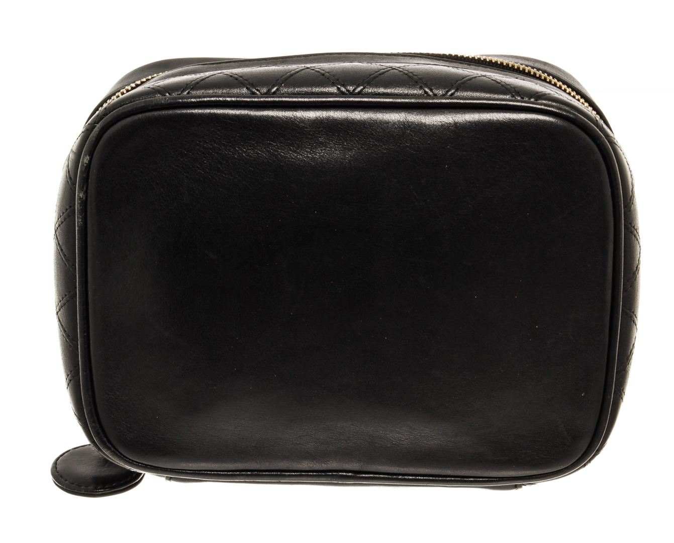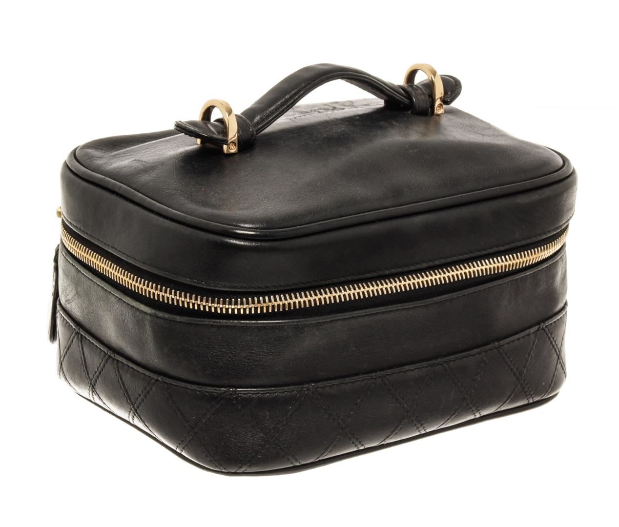 One Chanel Black Lambskin Vintage Vanity Case. Item is sold AS-IS. All available information is listed in the description and shown in the photo. Chanel Black Lambskin Vintage Vanity Case with gold-tone hardware, diamond quilted leather detailing at the bottom part, CC gold-tone metal logo on a round shaped leather zipper charm, black leather interior, single flat leather top handle, and zipper closure. .