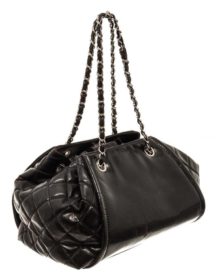 Chanel Black Leather CC Bowler Bag. All available information is listed in the description and shown in the photos. Chanel black leather CC bowler bag with black vinyl exterior, the interlocking CC logo stitched on the front, quilted leather sides, silver-tone hardware, two shoulder straps with leather and chain interlinked, black and white plaid lining, and drawstring closure. There are some markings on the bottom and around the exterior, peeling on the strap. Please refer to photos. length: 9.50 in, Height: 8.75 in, Width: 6.50 in, Drop: 8.00 in / 24.13 x 22.22 x 20.32 Cm