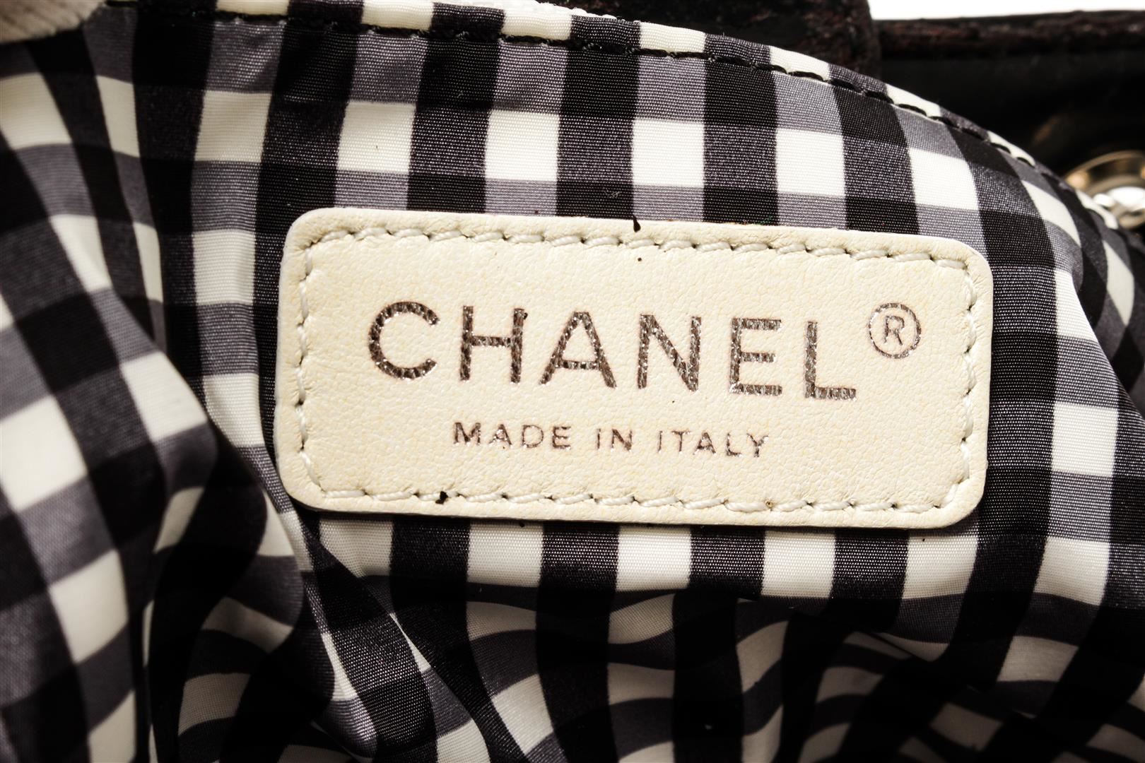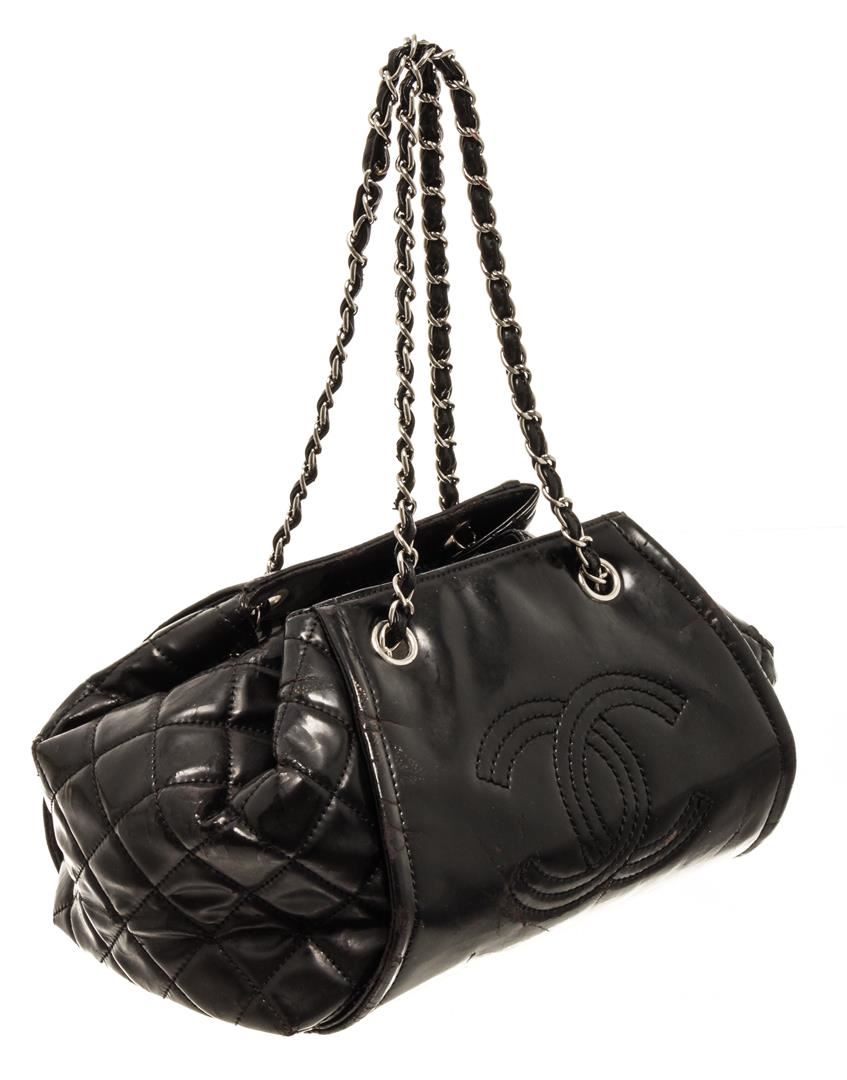 Chanel Black Leather CC Bowler Bag. All available information is listed in the description and shown in the photos. Chanel black leather CC bowler bag with black vinyl exterior, the interlocking CC logo stitched on the front, quilted leather sides, silver-tone hardware, two shoulder straps with leather and chain interlinked, black and white plaid lining, and drawstring closure. There are some markings on the bottom and around the exterior, peeling on the strap. Please refer to photos. length: 9.50 in, Height: 8.75 in, Width: 6.50 in, Drop: 8.00 in / 24.13 x 22.22 x 20.32 Cm