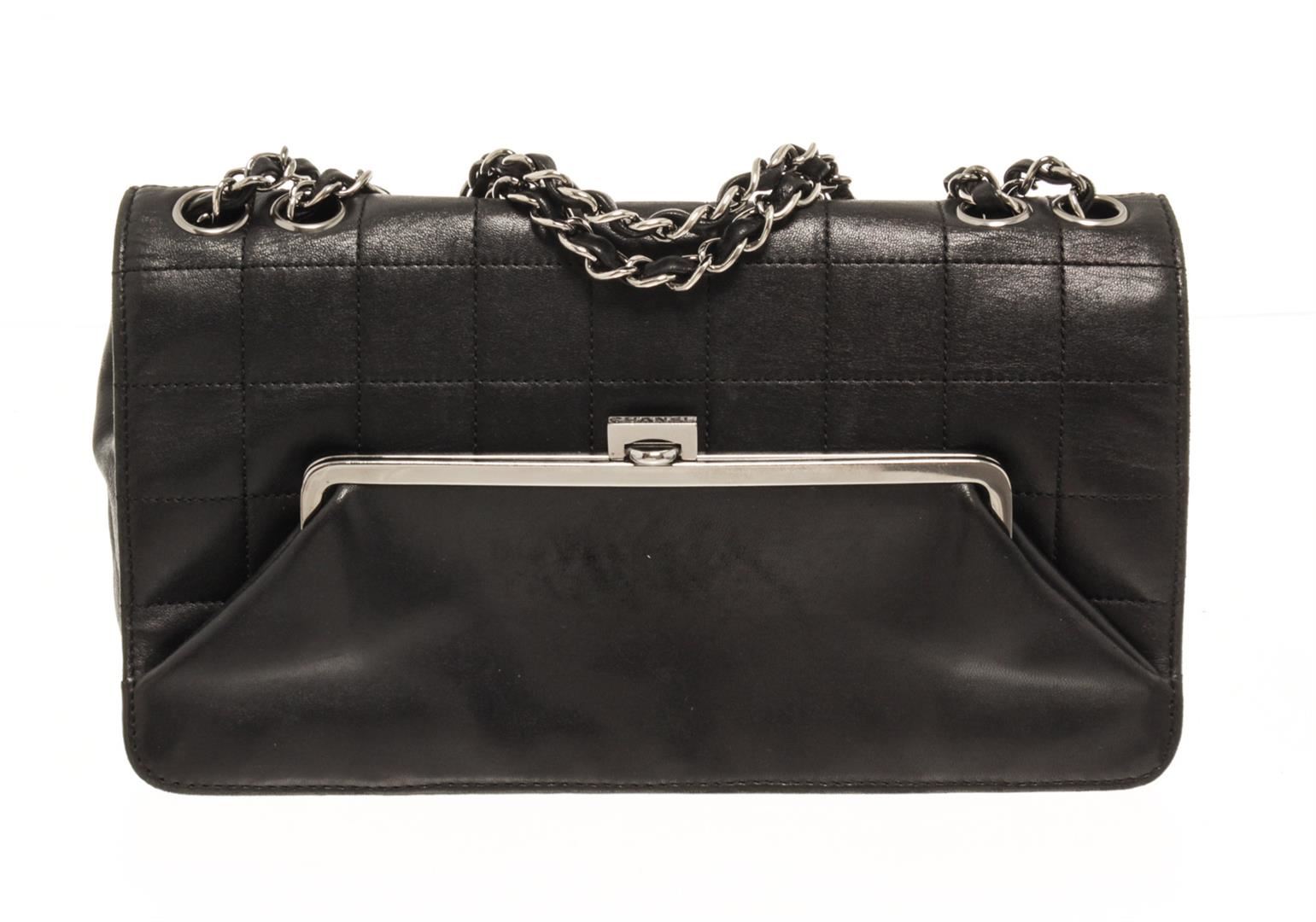One Chanel Black Leather Chocolate Bar Shoulder bag. Item is sold AS-IS. All available information is listed in the description and shown in the photo. Chanel Black Leather Chocolate Bar Shoulder bag with material leather, silver-tone hardware, chain/leather shoulder strap, interior pocket, fabric interior, snap closure. H4.5 X W8 X D1.5 inches Strap drop(Single) : 13 inches Strap drop(double) : 7 inches H11 X W20 X D4 cm