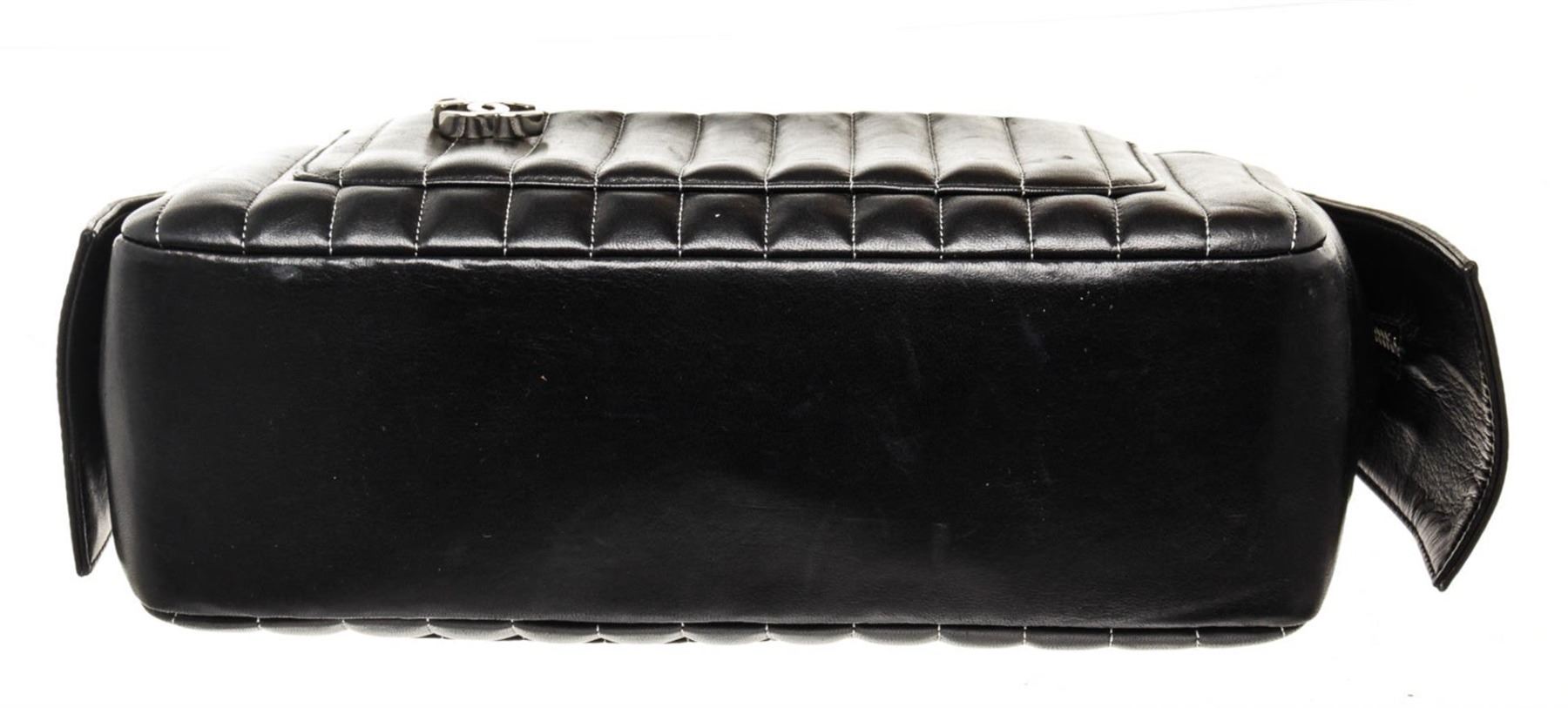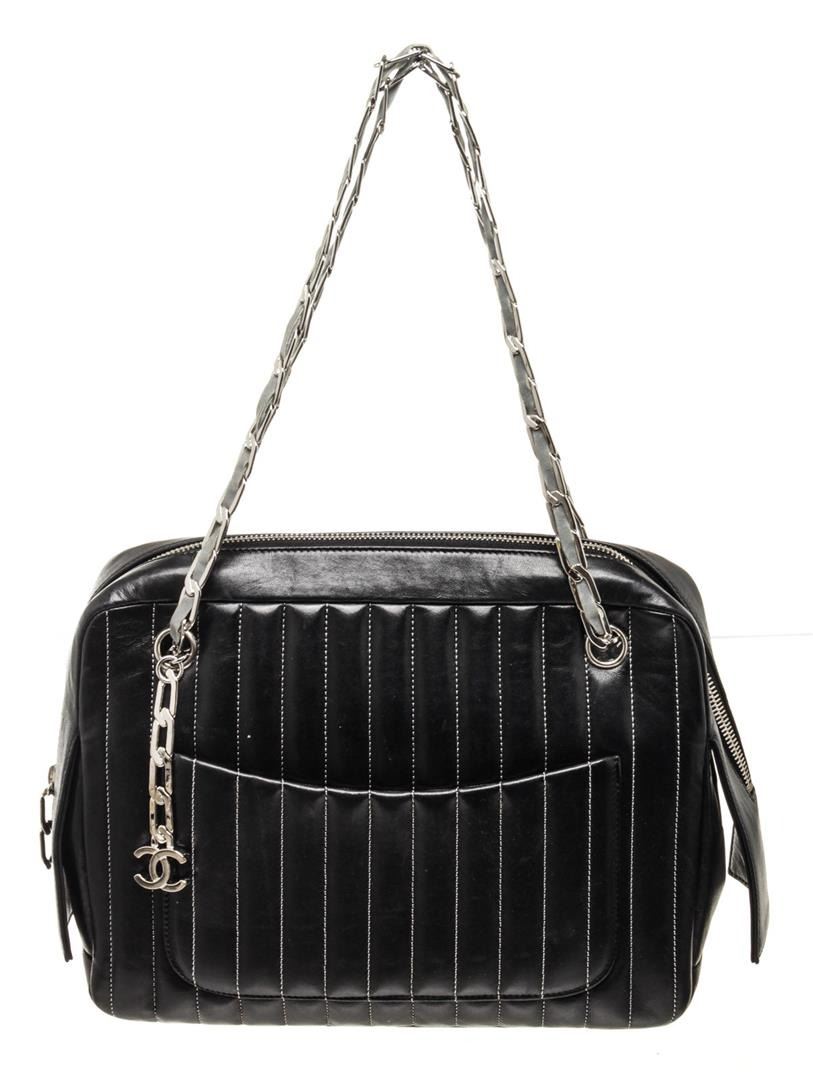 One Chanel Black Leather Mademoiselle Shoulder Bag. Item is sold AS-IS. All available information is listed in the description and shown in the photo. Chanel Black Leather Mademoiselle Shoulder Bag with leather, silver-tone hardware, trim leather, interior zip slip pocket, chain shoulder strap and zipper closure.