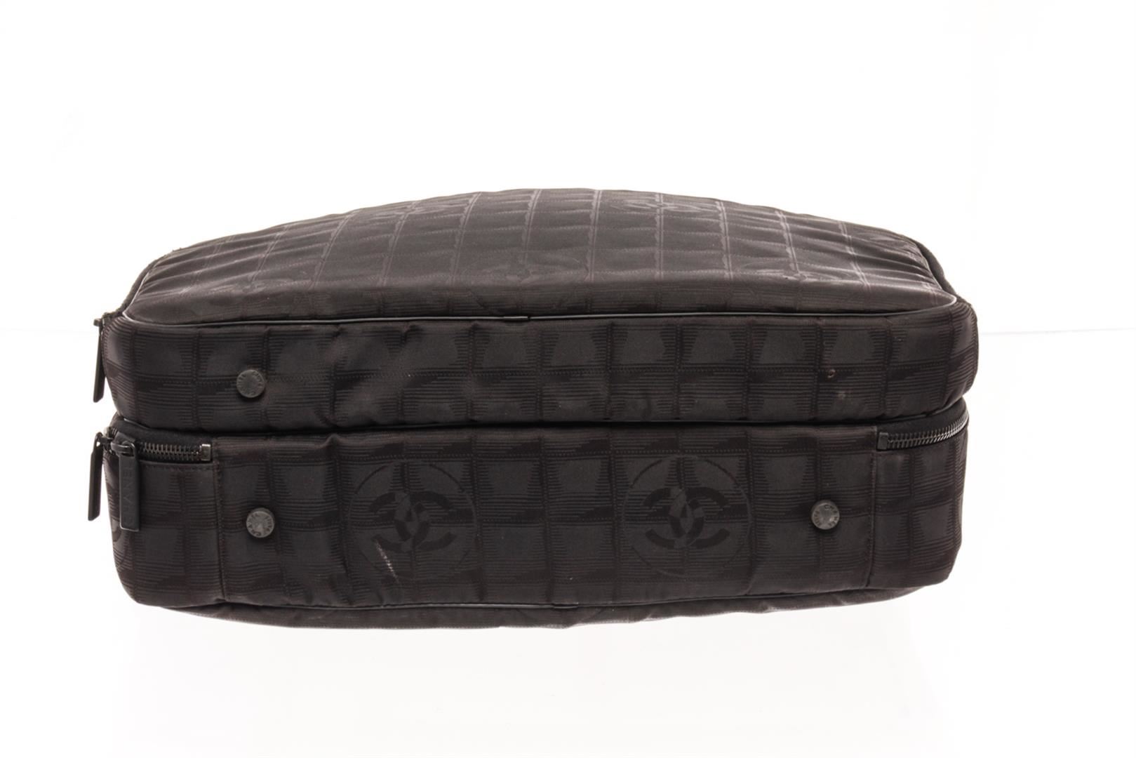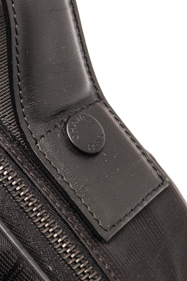 Chanel Black Nylon Travel Bag. All available information is listed in the description and shown in the photos. chanel black nylon travel bag with light wear and marks on exterior and in interior, scuffs on leather trism and handle, slight loss of shape on handle. pilling on zipper tapes, scratches and discoloration on hardware. Height 11.5", Width 14", Depth 5", Strap Drop 8.5-20" / 29.21 x 35.56 x 12.7 Cm