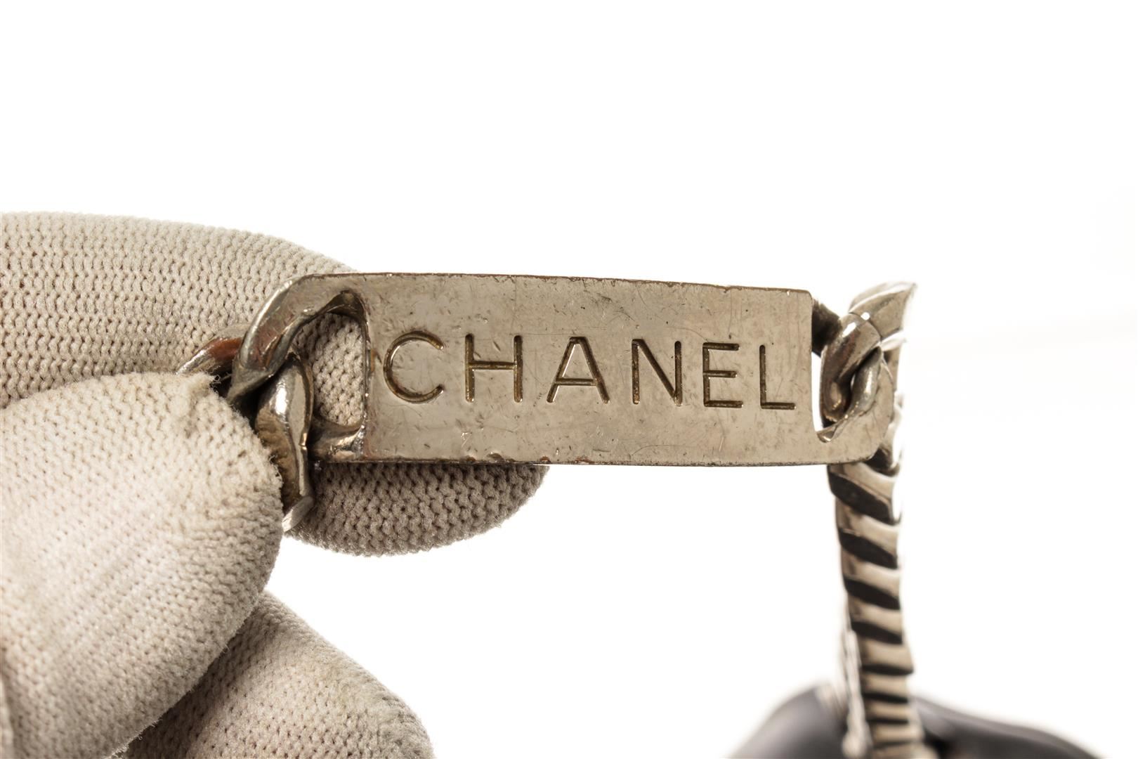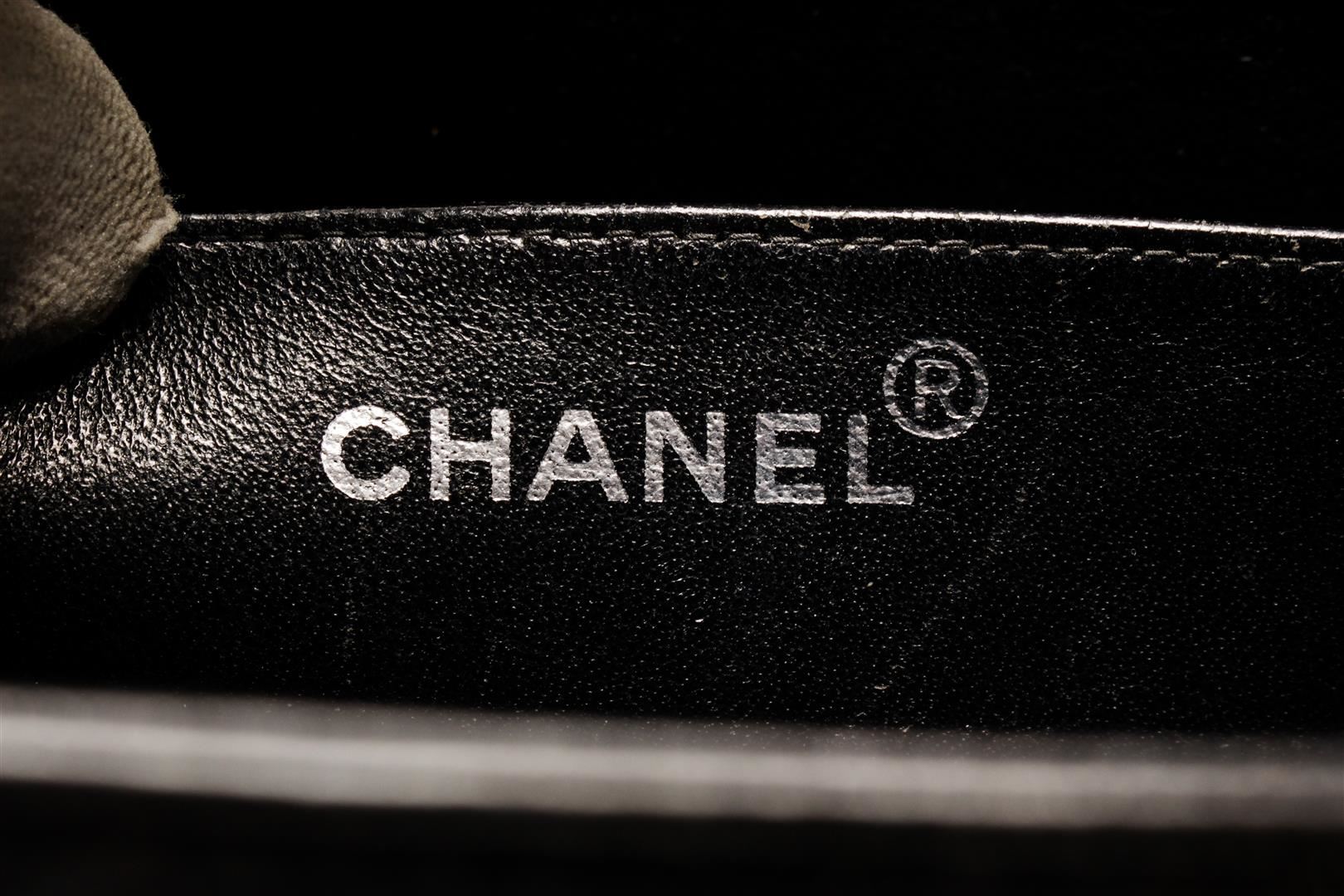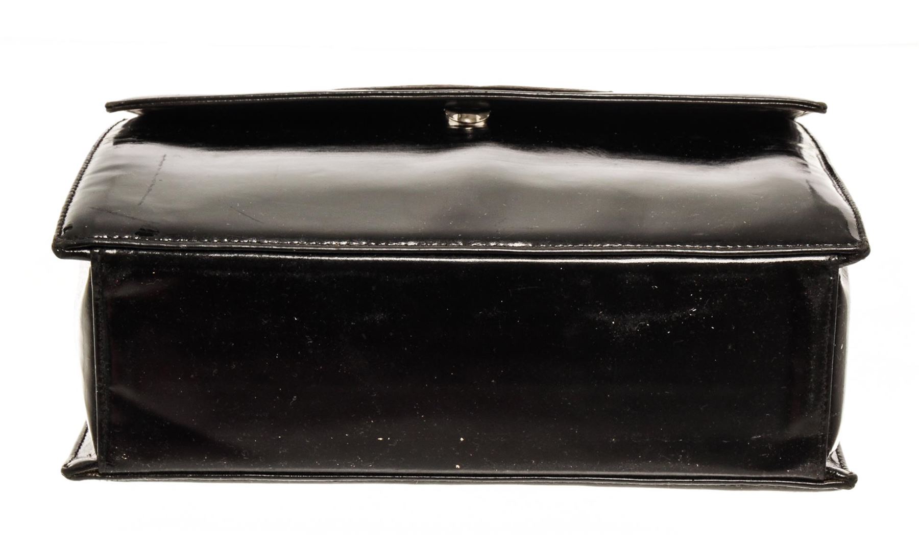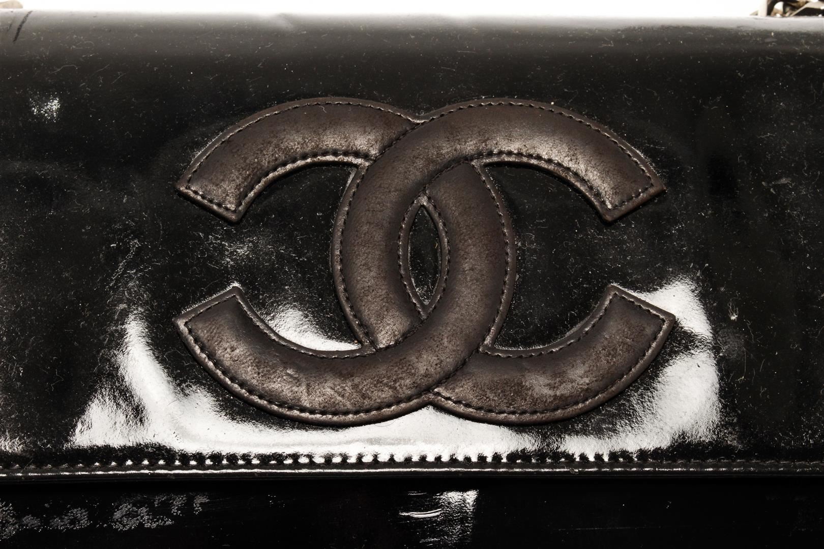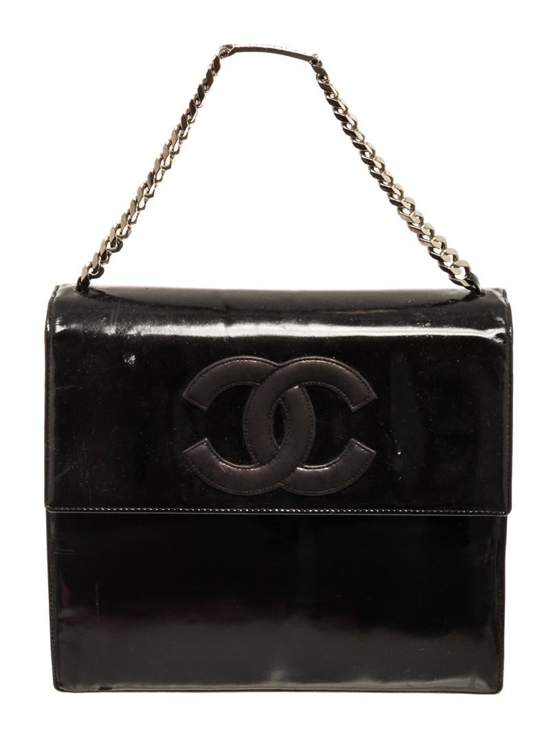 One Chanel Black Patent Leather CC Chain Shoulder Bag. Item is sold AS-IS. All available information is listed in the description and shown in the photo. Chanel black patent leather CC chain shoulder bag with black patent leather exterior, black leather lining, silver-toned hardware, silver chain top handle with shoulder pad, flap and snap button closure, CC logo on the flap, and one interior zip pocket. Conditions: this bag has a fine scratch at the base of the flap (photo), and on the back chain inlay (photo) no signs of wear or stains inside and out. chain length 34 cm. Height: 9.1" Width: 10.6" Depth: 3.1", Handle Drop: / 23.11 x 26.92 x 7.87 Cm