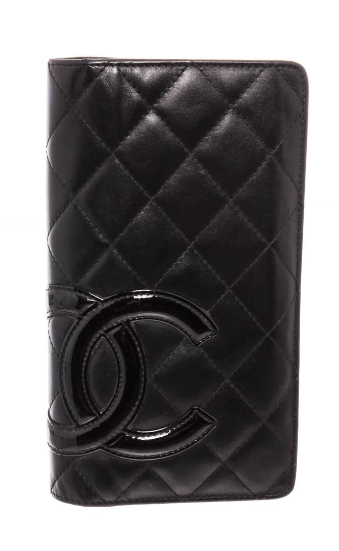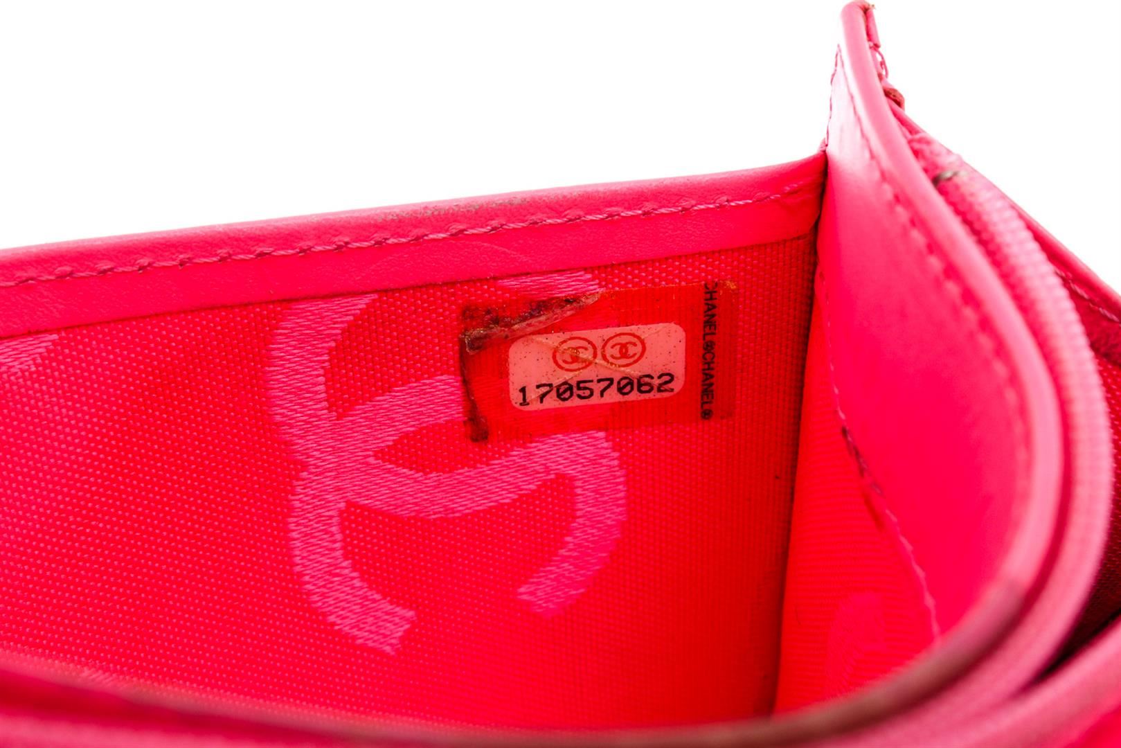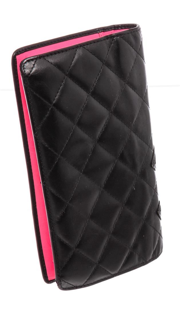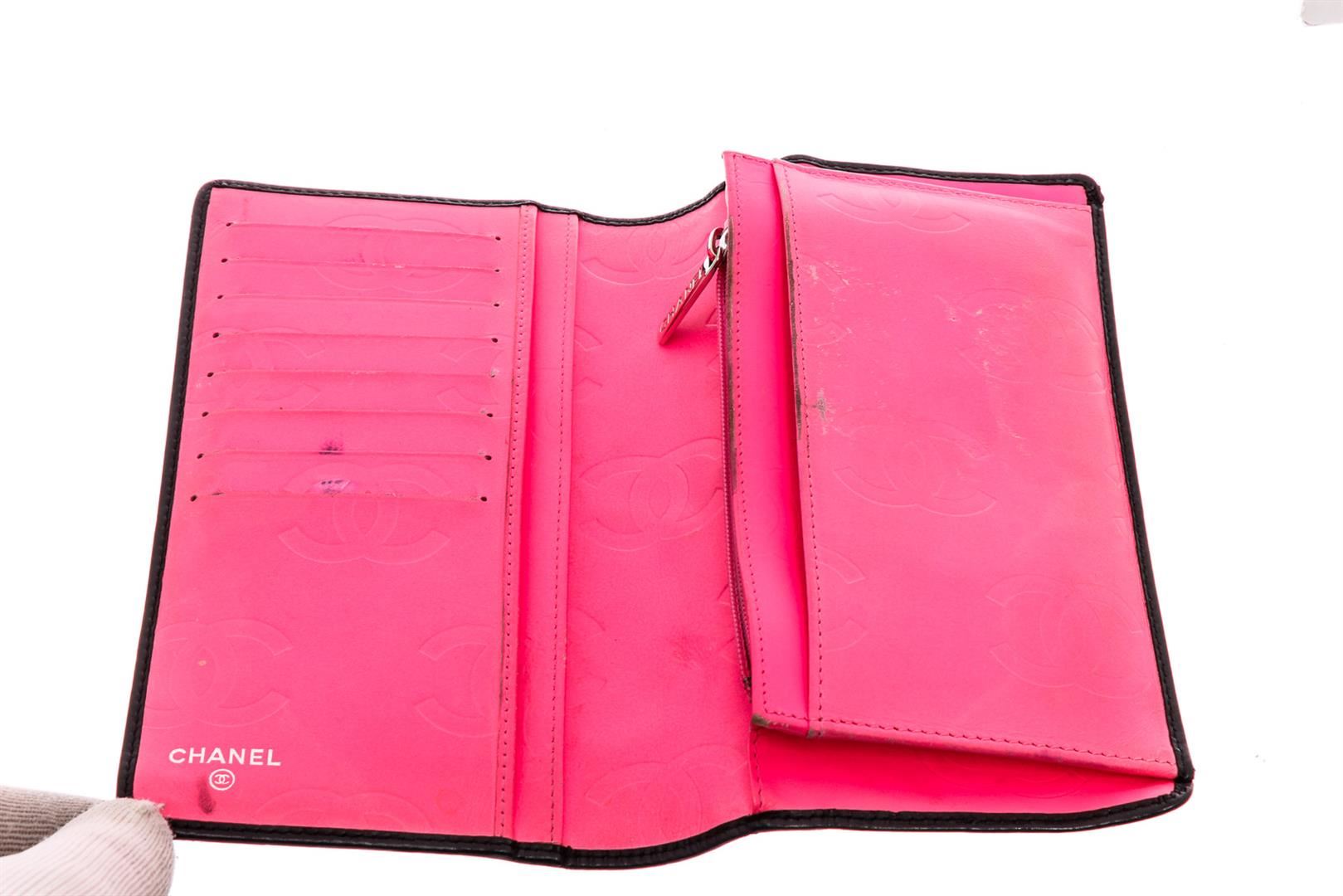 Black quilted calfskin Chanel Ligne Cambon Yen wallet with gold-tone hardware, patent leather CC logo adornment at exterior, neon pink CC embossed leather interior lining, dual interior bill compartments, four interior compartments; one with zip closure, eight interior card slots and bifold closure at side.
