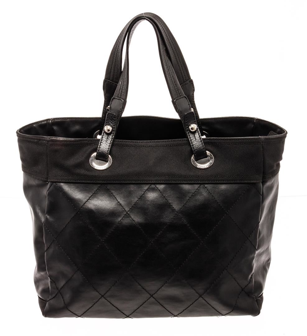 Chanel Black Quilted Coated Canvas Paris Biarritz Shoulder Bag. All available information is listed in the description and shown in the photos. Chanel Black Quilted Coated Canvas Paris Biarritz Shoulder Bag with top handles, nylon lining, interior pockets, silver hardware, zipper closure. Height: 11.42 in (29 cm), Width: 5.52 in (14 cm), Length: 13.78 in (35 cm)